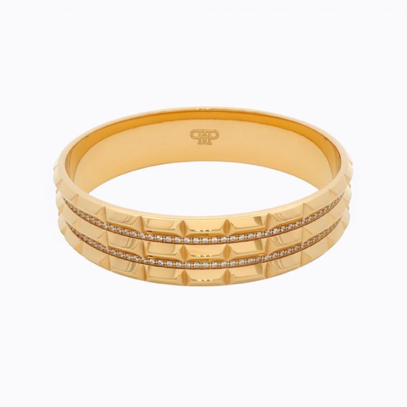 - Limited edition statement bangle crafted in premium stainless steel with luxurious 18K gold plating - Features a bold, architectural triple-edge design accented with precision-set sparkling stones for elevated brilliance - Sculptural volume creates a strik...