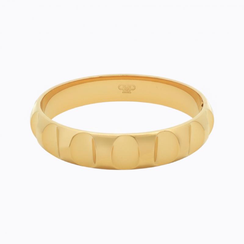 - Contemporary stainless steel bangle finished in luxurious 18K gold plating for lasting brilliance - Features a refined geometric ridged texture, adding subtle volume and modern architectural style - Slim, polished profile offers an elegant everyday look th...