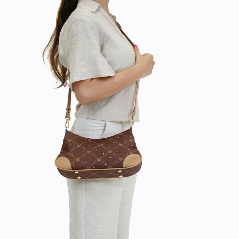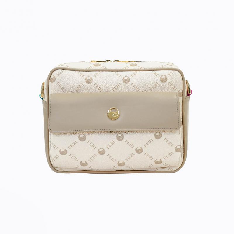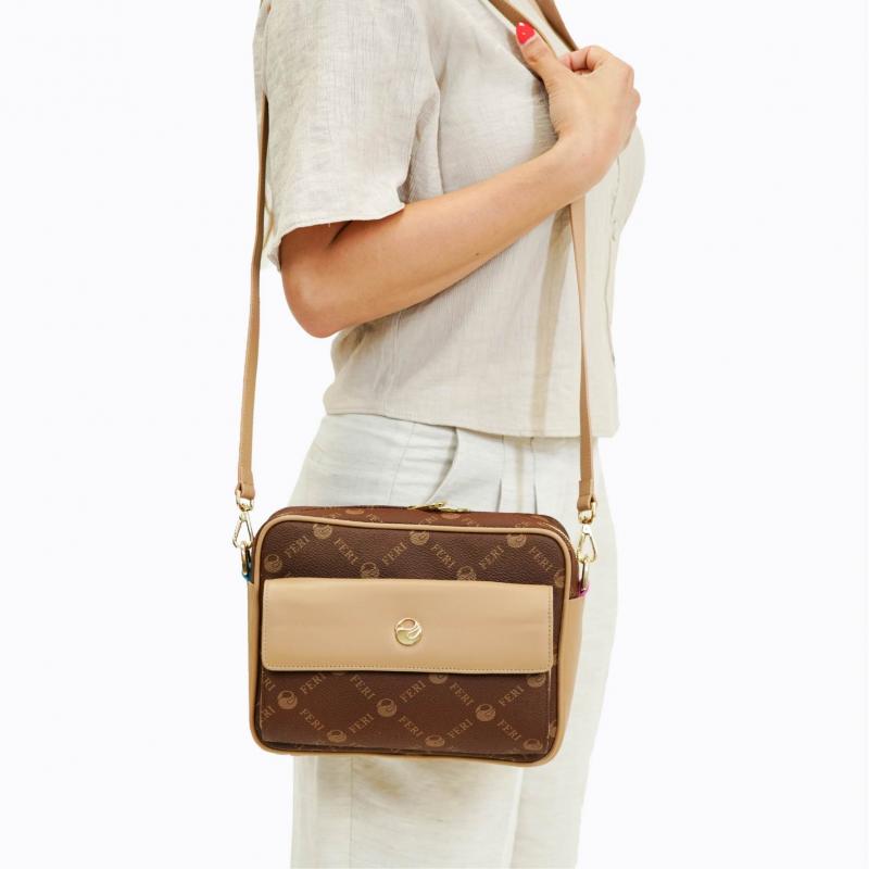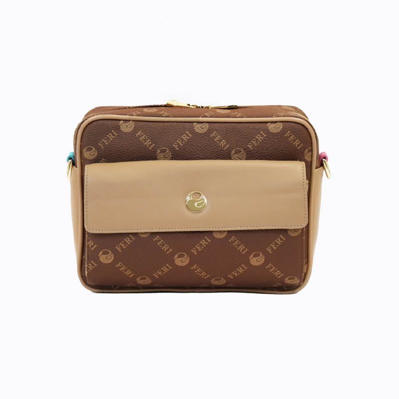 Elevate your style with the FERI Signature Messenger Bag, crafted for both elegance and practicality. This compact, rectangular messenger bag features a refined two-tone design with a light beige flap overlaying a classic brown leather-textured base adorned wi...
