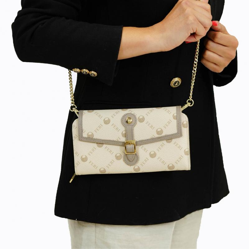 The FERI Signature Buckle-Flap Wallet blends classic elegance with smart utility. Crafted from soft beige textured leather featuring the all-over FERI monogram, this wallet stands out with its structured flap closure, complete with a decorative strap, gold-ton...