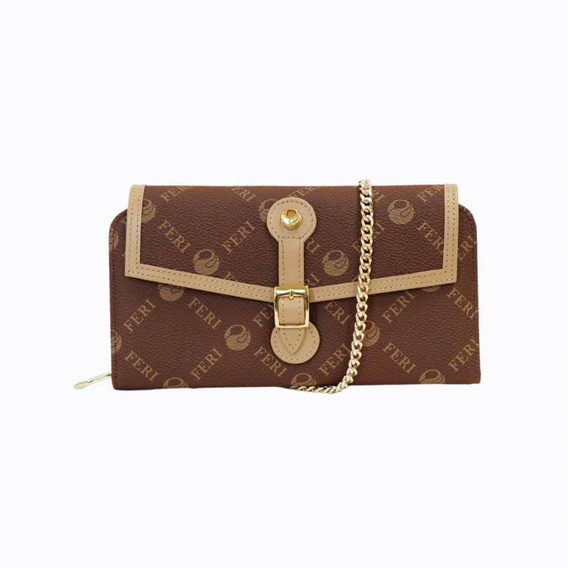 The FERI Signature Buckle-Flap Wallet blends classic elegance with smart utility. Crafted from classic brown textured leather featuring the all-over FERI monogram, this wallet stands out with its structured flap closure, complete with a decorative strap, gold-...