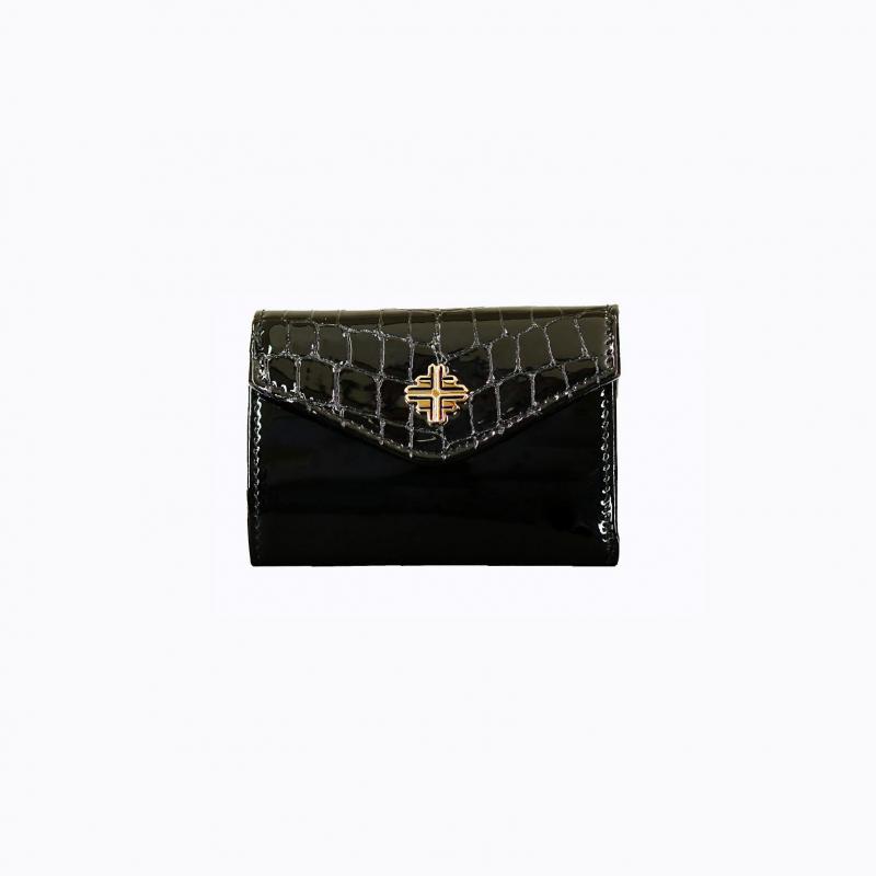 Sleek, sophisticated, and compact, the FERI Black Patent Leather Mini Wallet is the perfect fusion of elegance and everyday function. Crafted from high-gloss black patent leather with a croc-embossed flap, this mini wallet brings timeless style to modern utili...