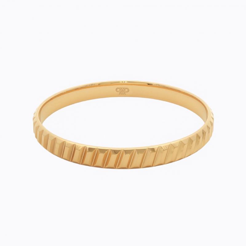 - Contemporary stainless steel bangle finished in luxurious 18K gold plating for lasting brilliance - Features a refined geometric ridged texture, adding subtle volume and modern architectural style - Slim, polished profile offers an elegant everyday look th...