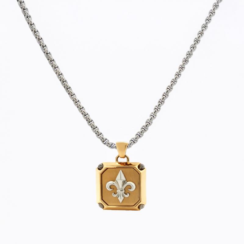 - Bold stainless steel necklace featuring 18K gold plating and a striking pendant for a statement accessory - Unique shield- shaped pendant with a fleur- de- lis design for a classic touch - Sturdy chain for a robust and masculine look - Polished finish for...
