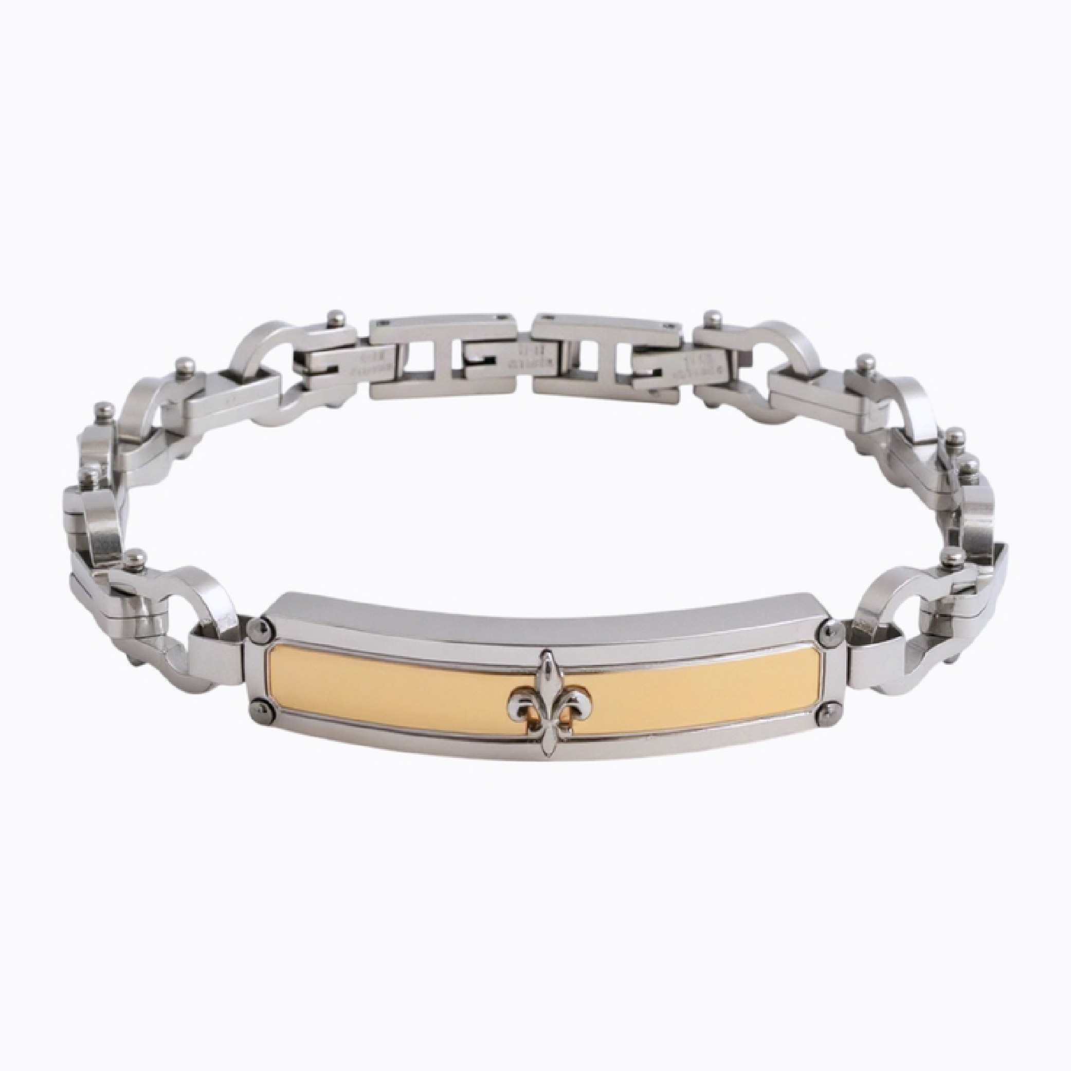 - Elegant stainless steel bracelet featuring 18K gold plating and a classic fleur-de-lis design for a refined accessory