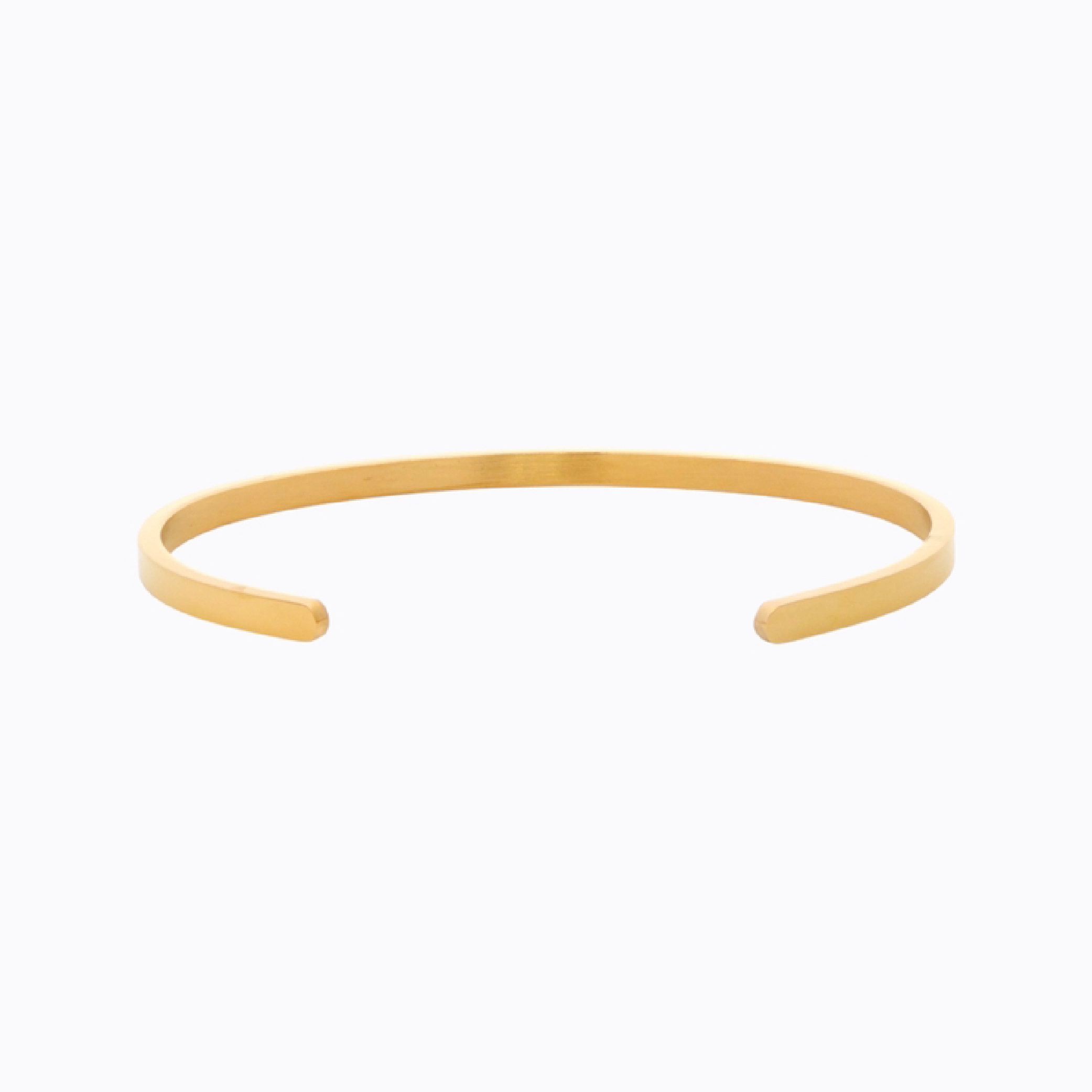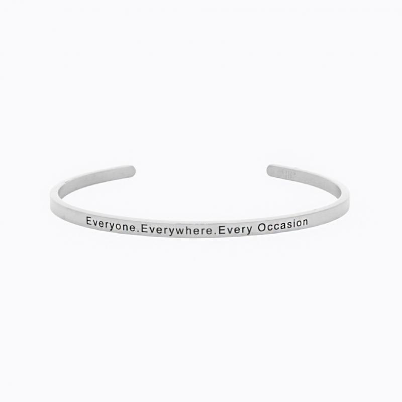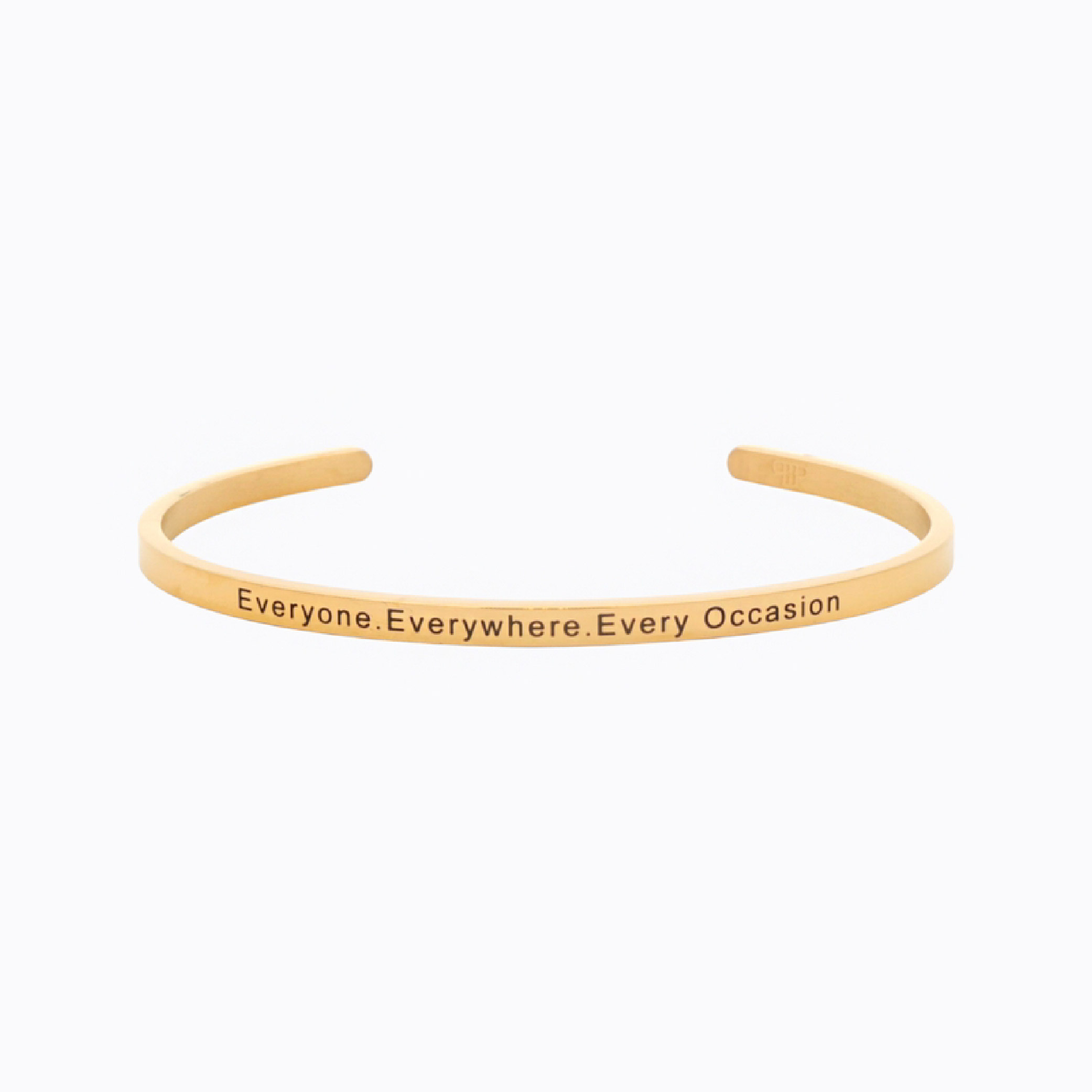 - Elegant open cuff bangle featuring a sleek and minimalist design, inscribed with an inspirational message: Everyone. Everywhere. Every Occasion.