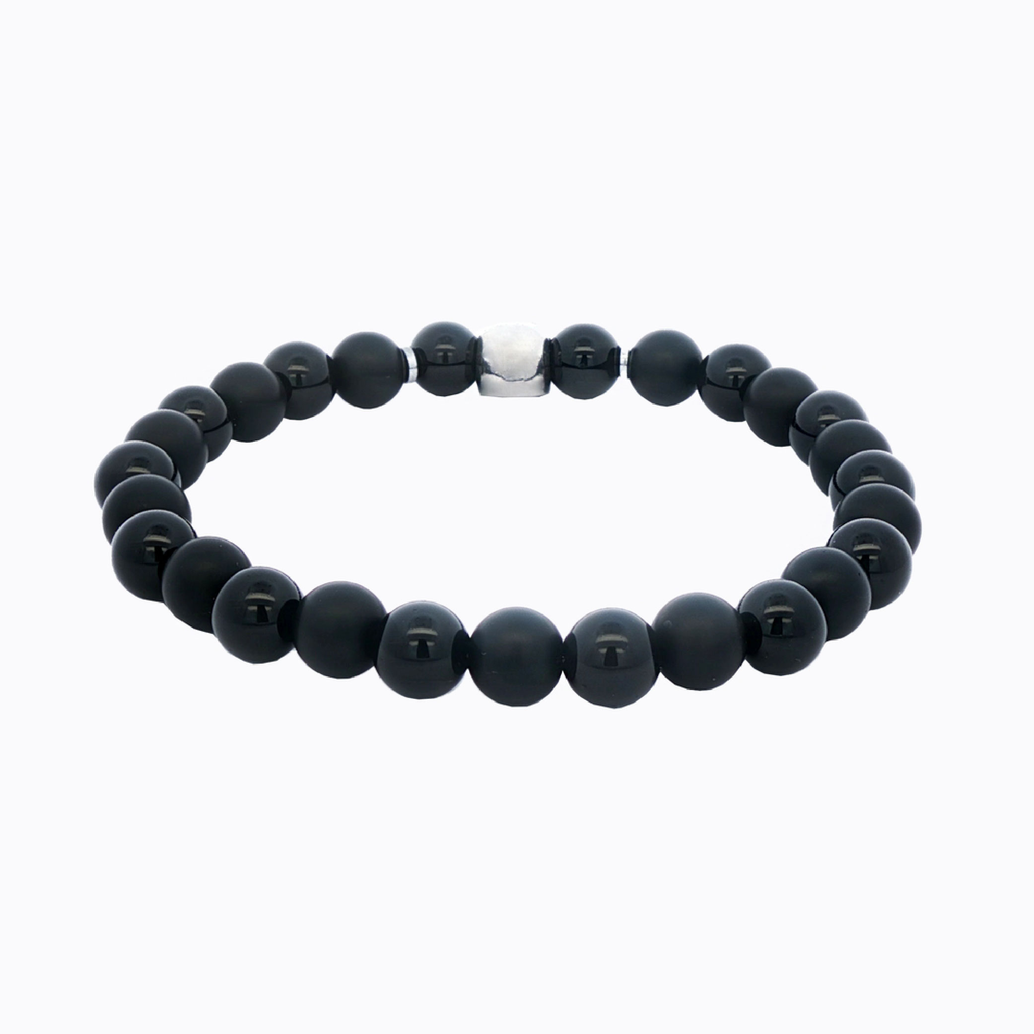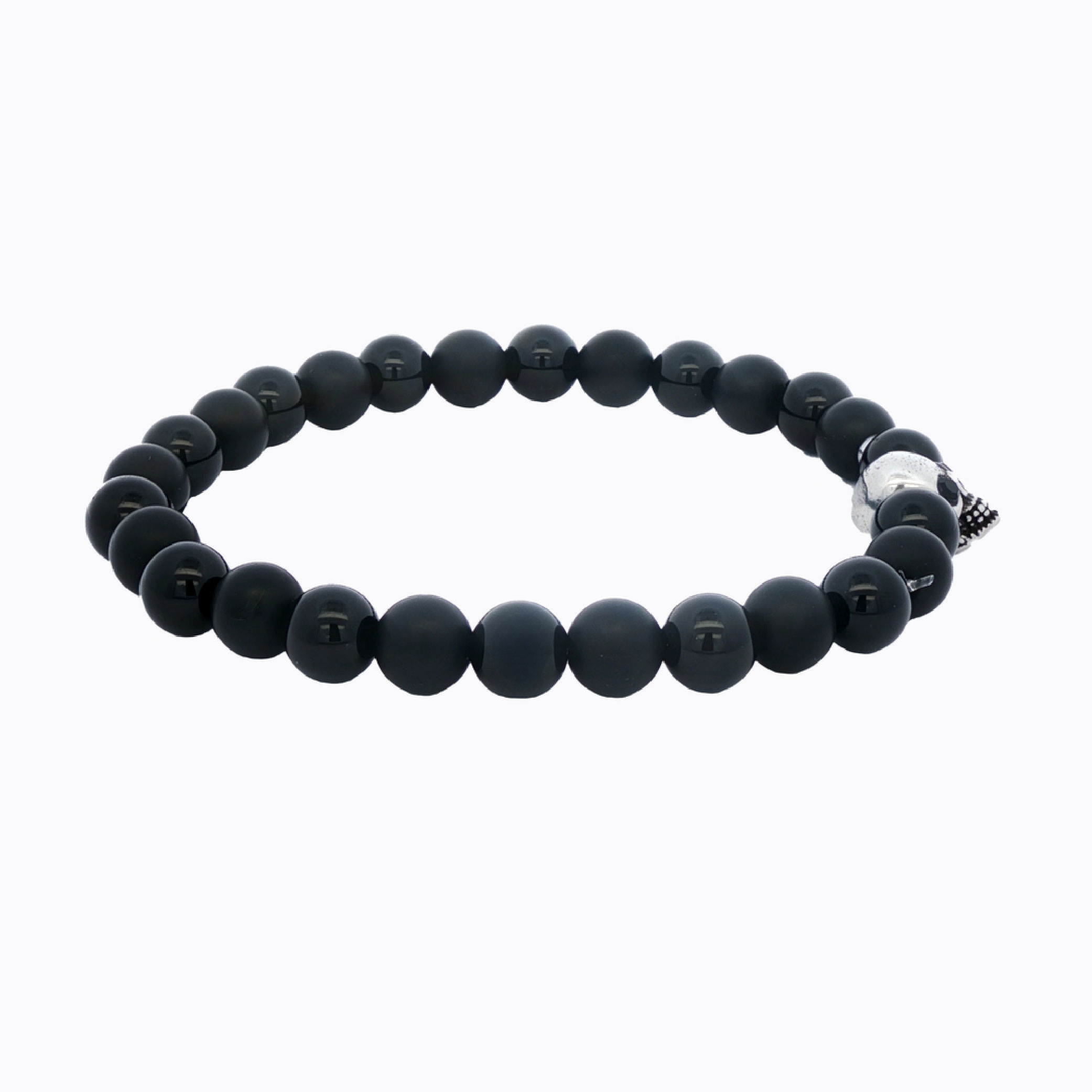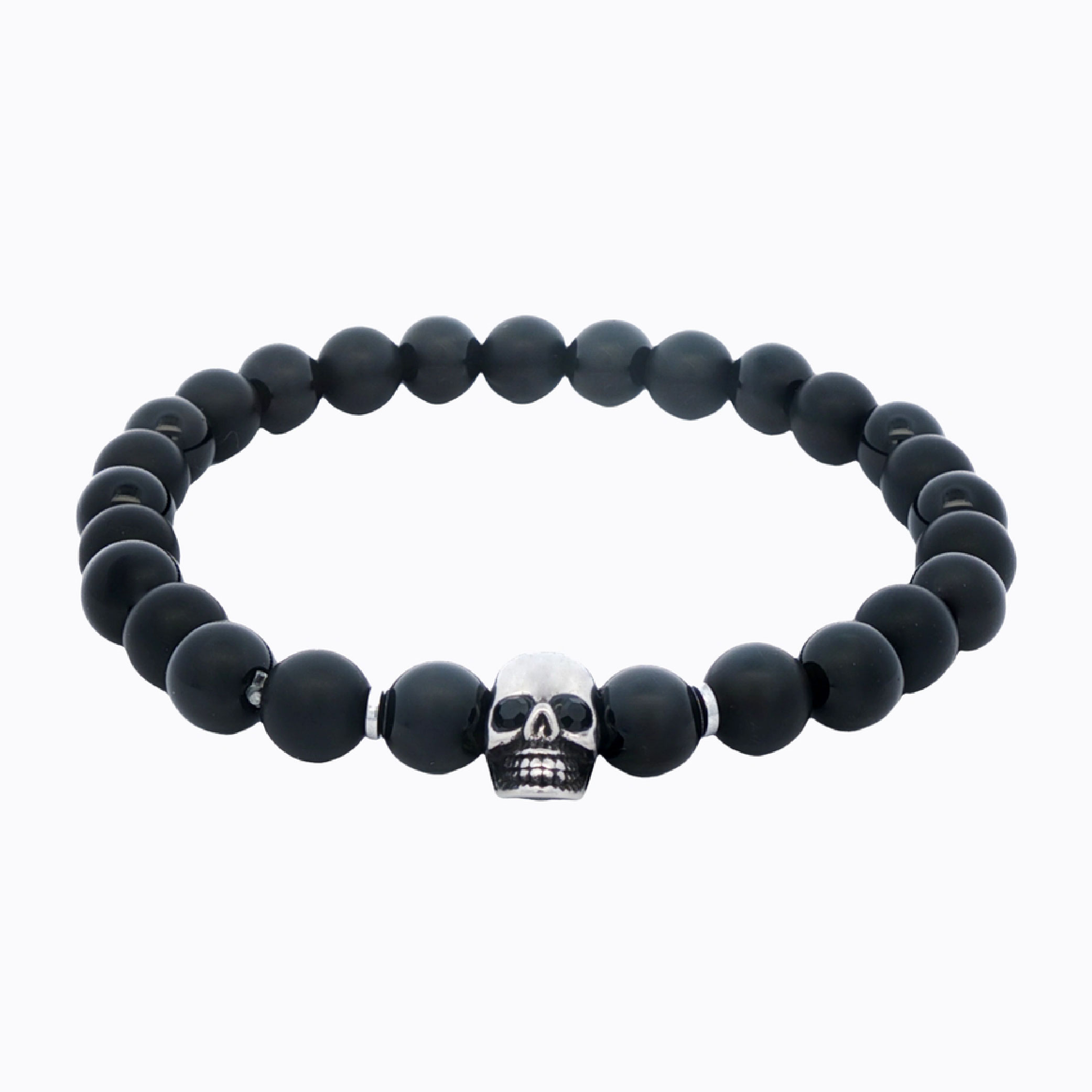 - Bold stainless steel skull bracelet featuring sleek black beads for a striking accessory