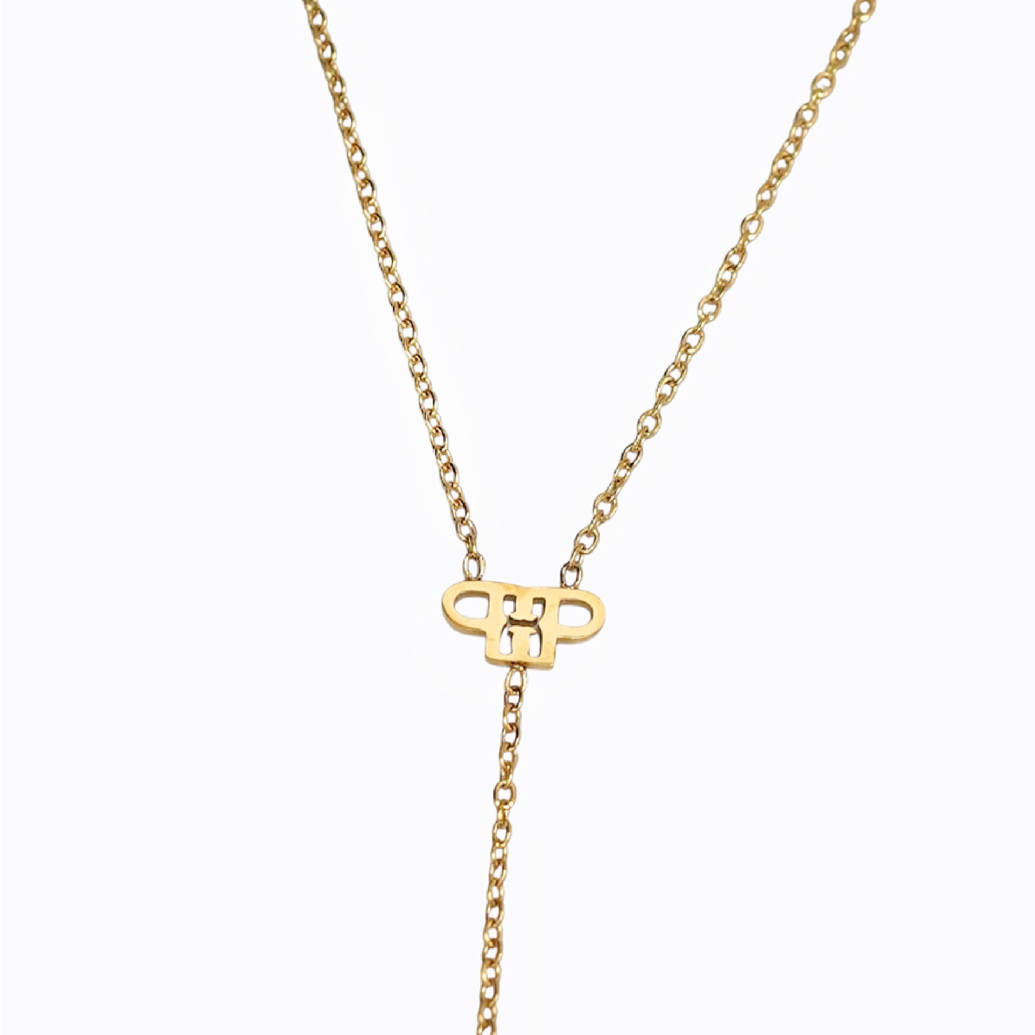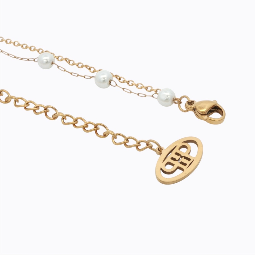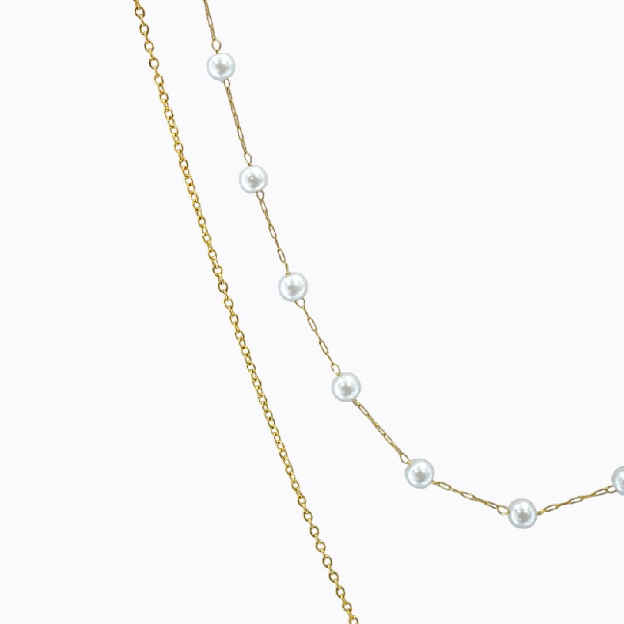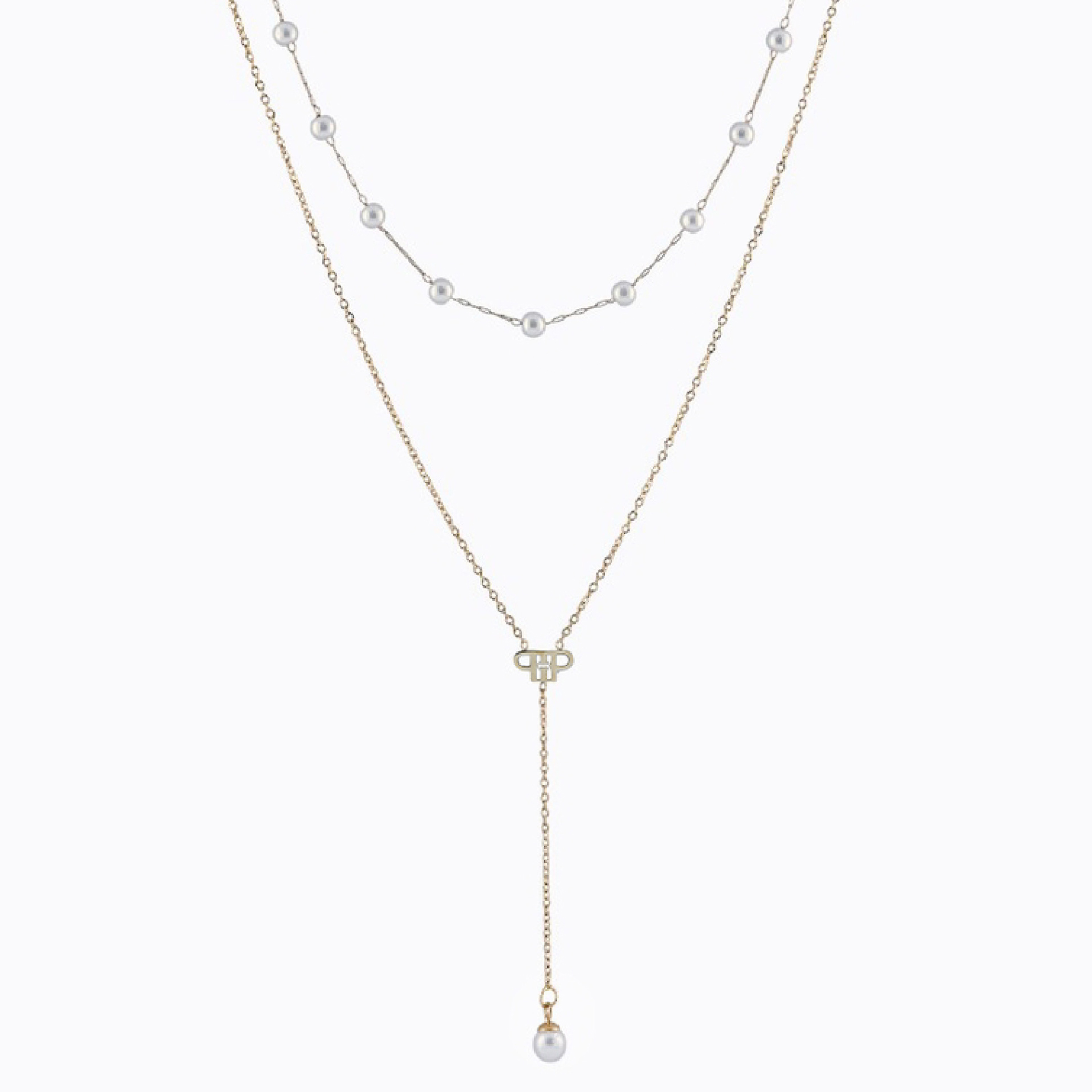 - Chic stainless steel layered y-necklace featuring 18K gold plating, elegant pearls, and a POSH logo plate for a refined accessory