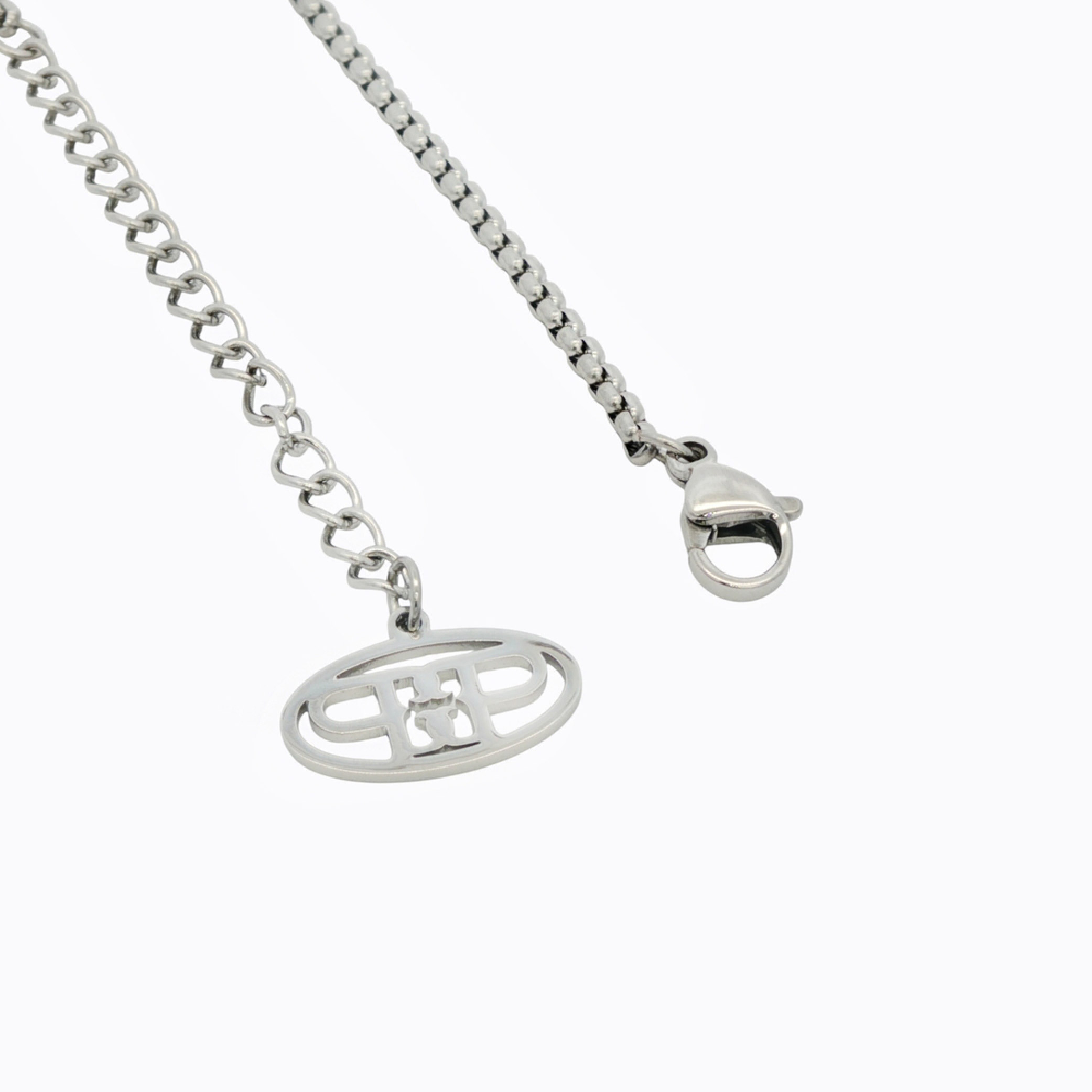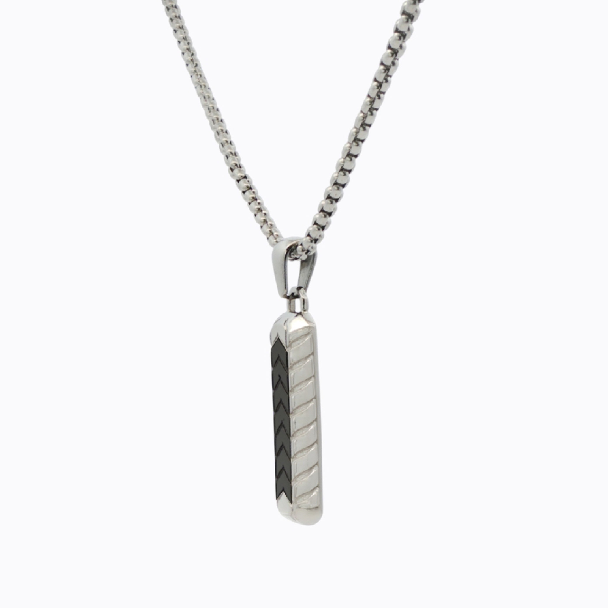 - Rugged stainless steel necklace featuring a striking black plating center and a textured tire tread pendant for a bold accessory