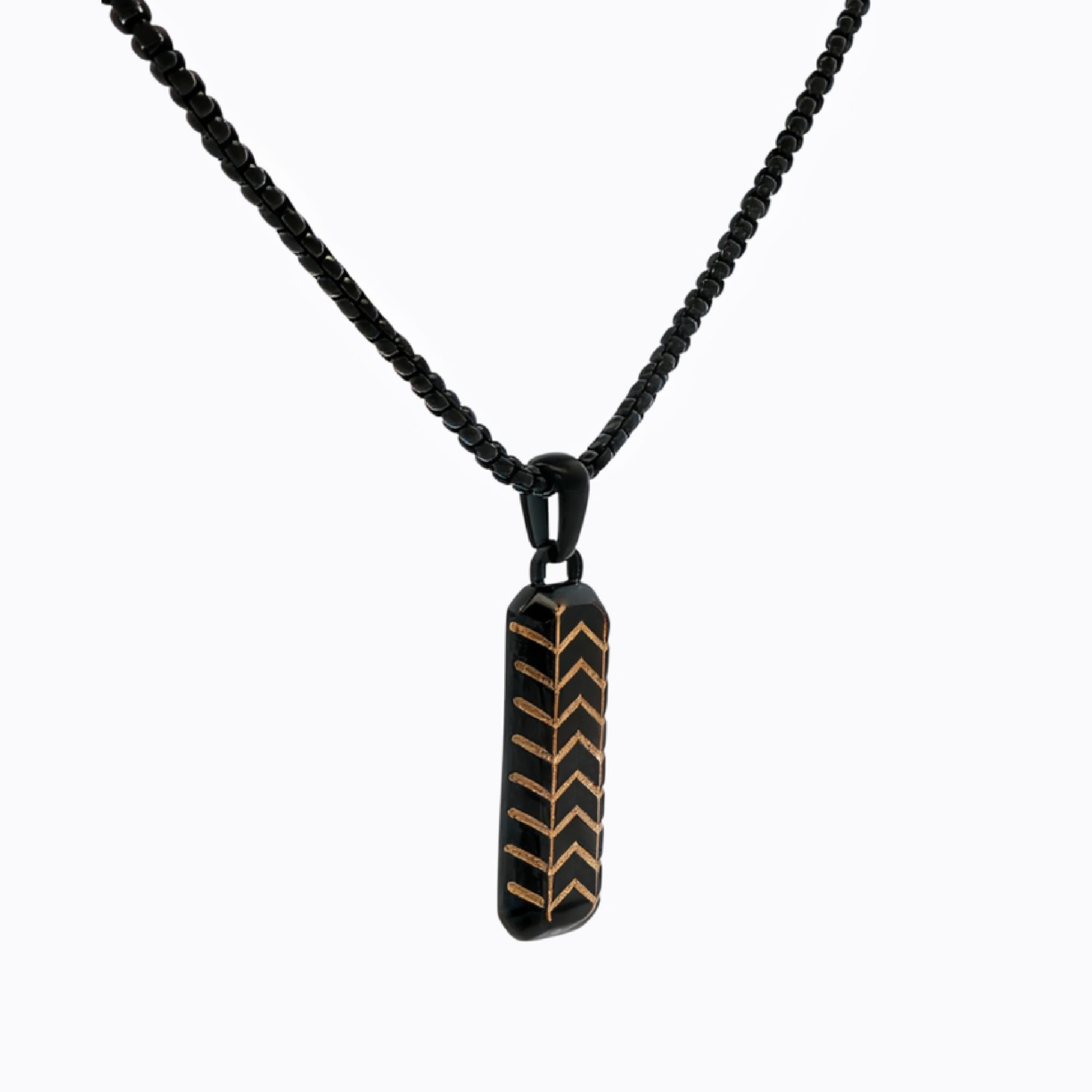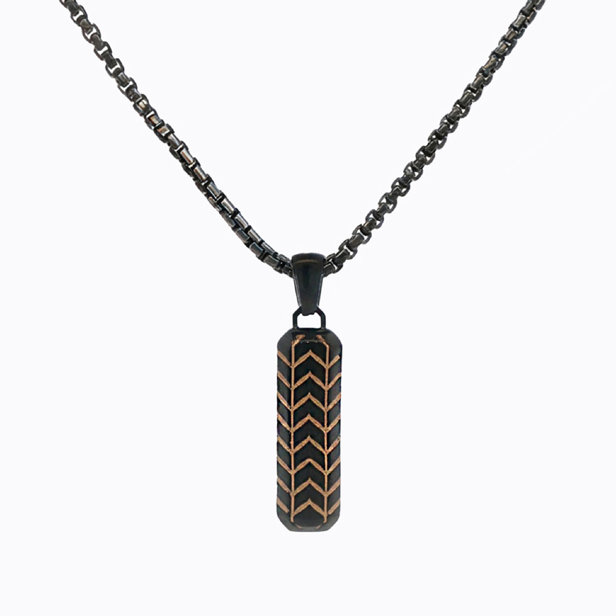 - Bold stainless steel necklace featuring a sleek black plating center accented with rose gold line detail for a striking accessory