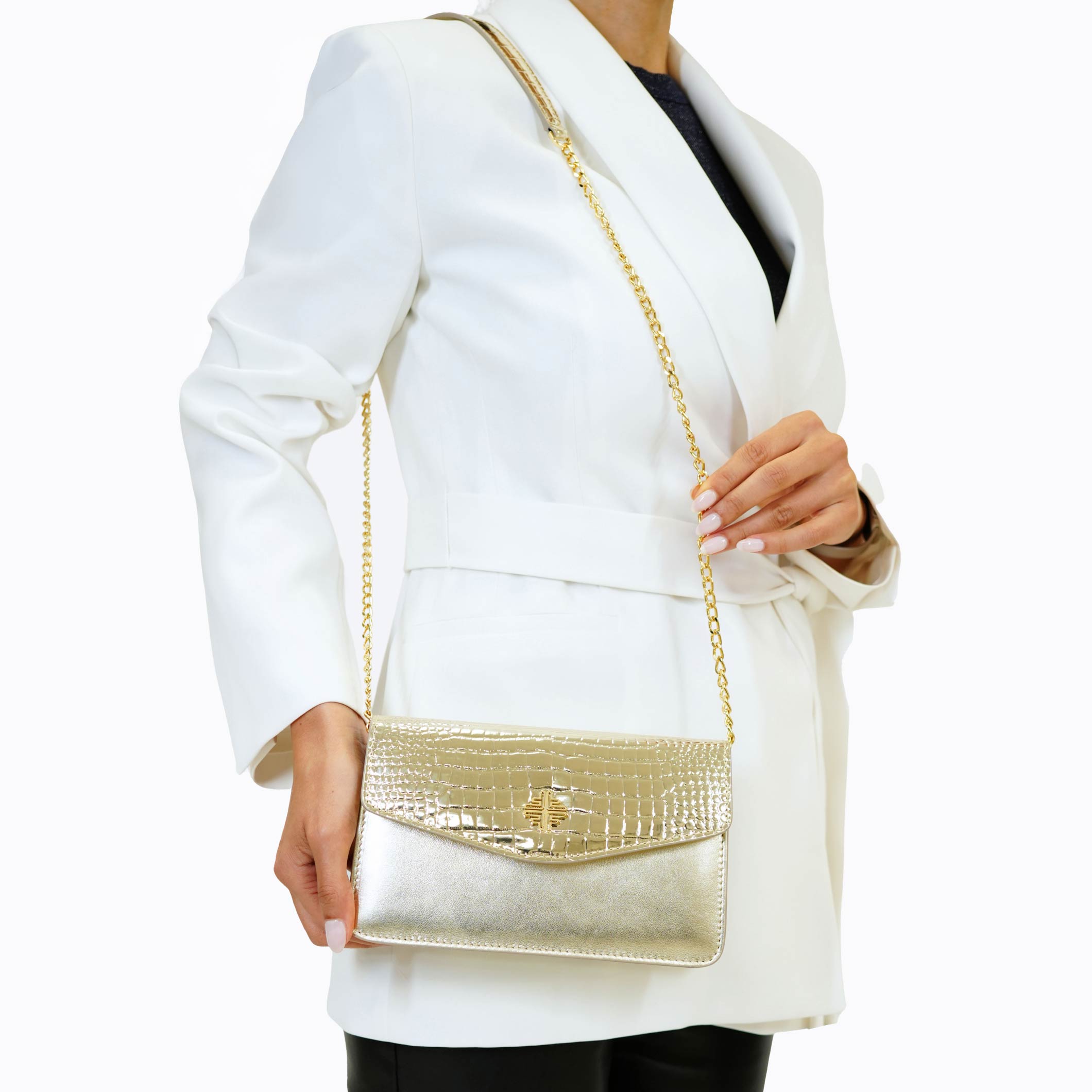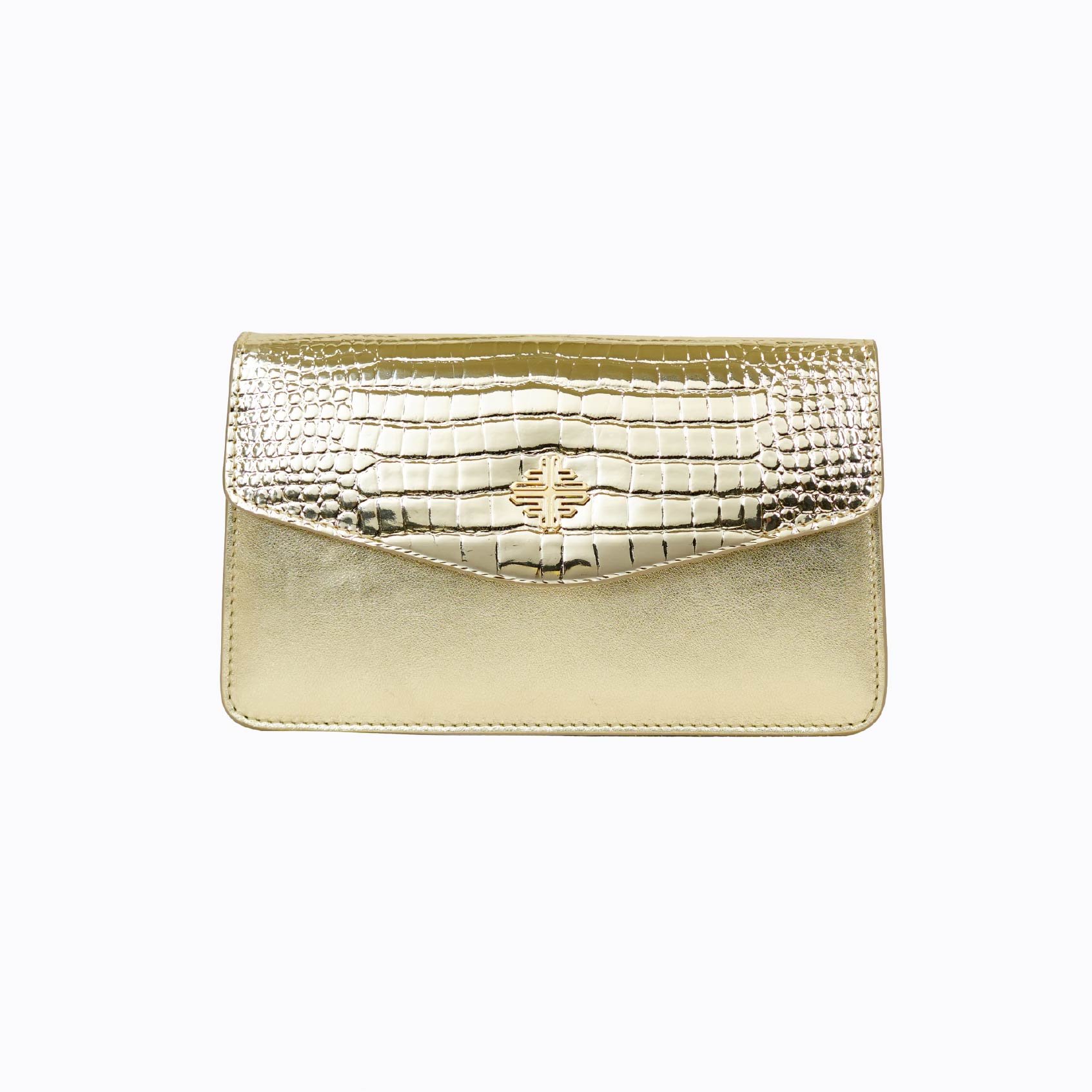 Turn heads with the bold elegance of the FERI Gold Glossy Croc-Embossed Clutch Purse, a striking accessory designed for moments that matter. Featuring a vivid, high-gloss gold finish with a croc-embossed texture, this structured clutch delivers both fashion and sophistication. The signature gold-tone FERI emblem on the flap closure adds a refined focal point to this vibrant design.