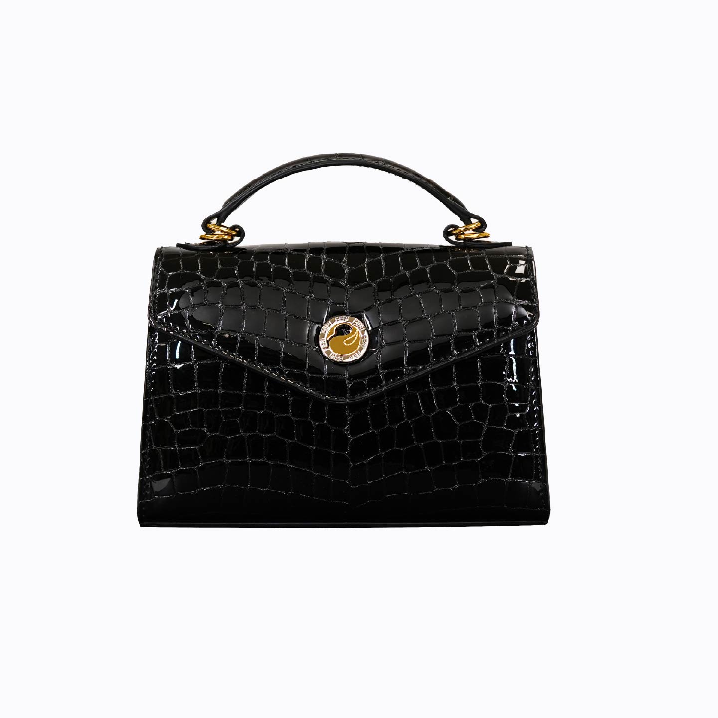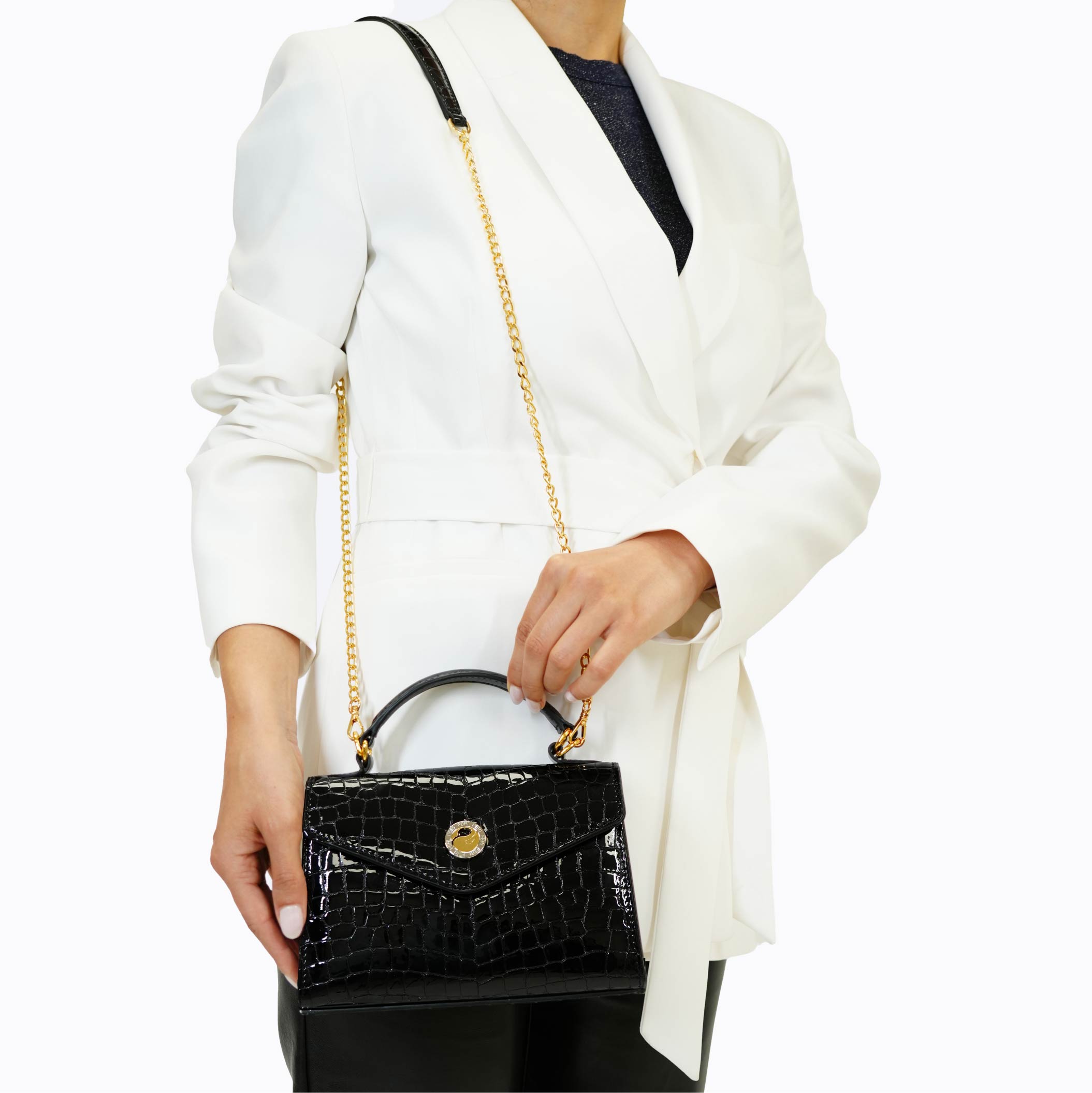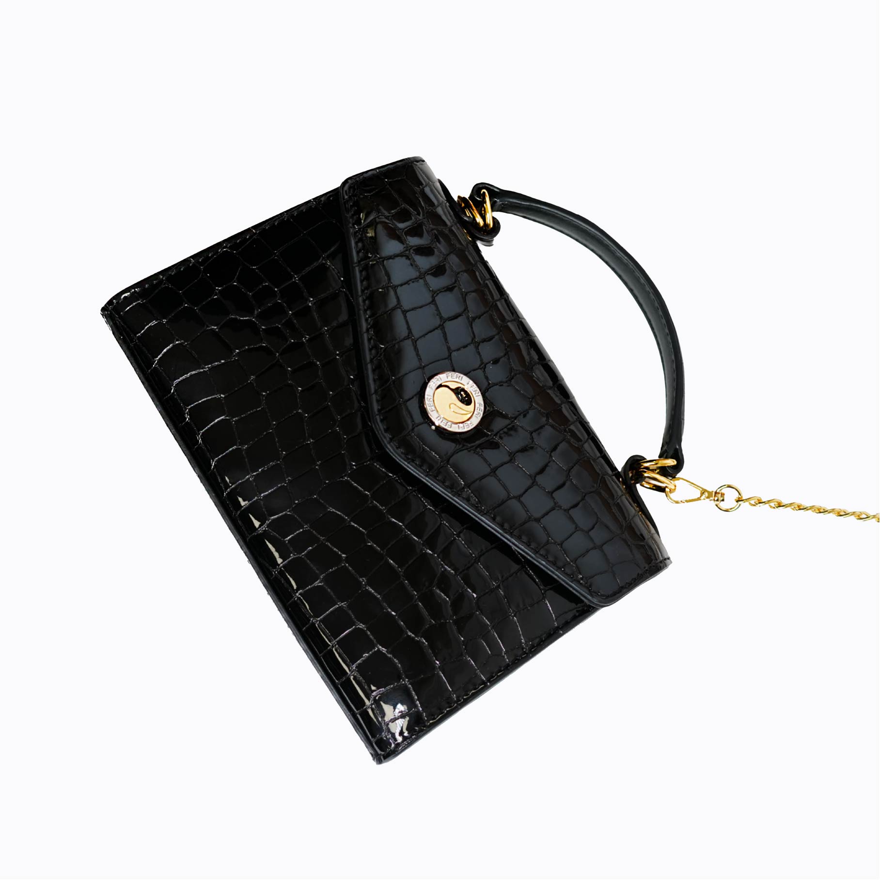 Timeless sophistication meets compact style in the FERI Black Mini Handbag. Expertly crafted from glossy patent leather with a refined croc-embossed texture, this structured mini bag exudes elegance. The envelope-style flap is adorned with a polished round metal clasp featuring the FERI insignia, while the top handle with gold-tone hardware adds a luxurious touch. Perfect for carrying your essentials with grace, this handbag transitions effortlessly from daytime outings to evening occasions.