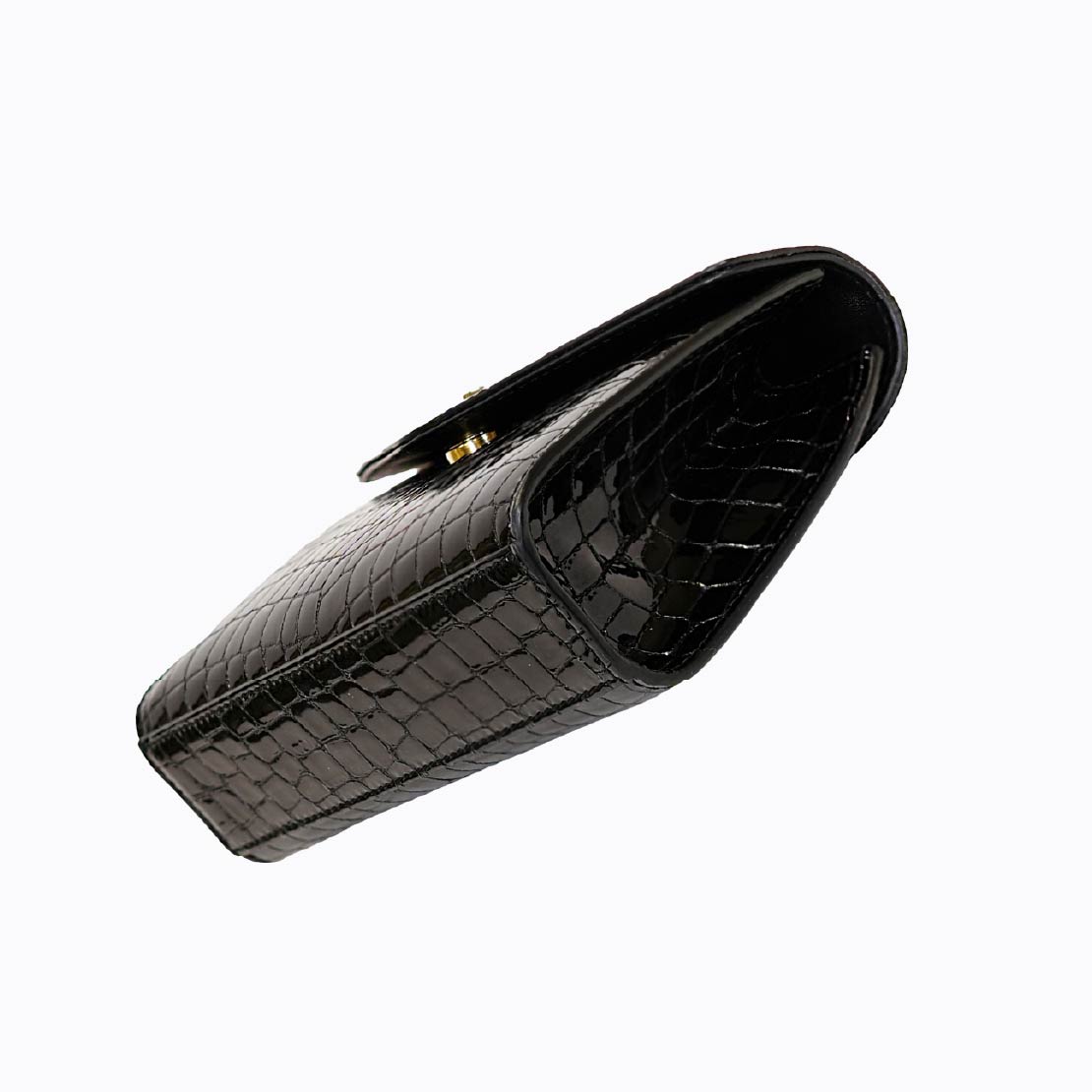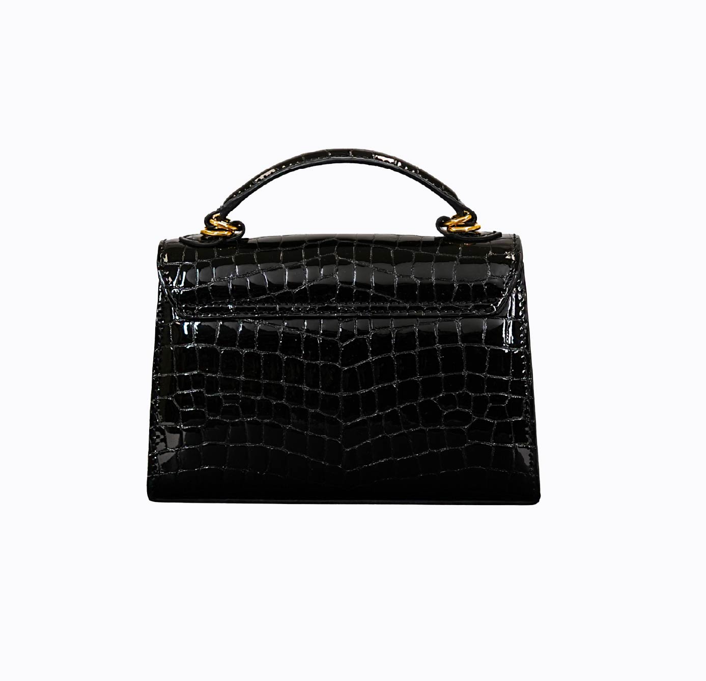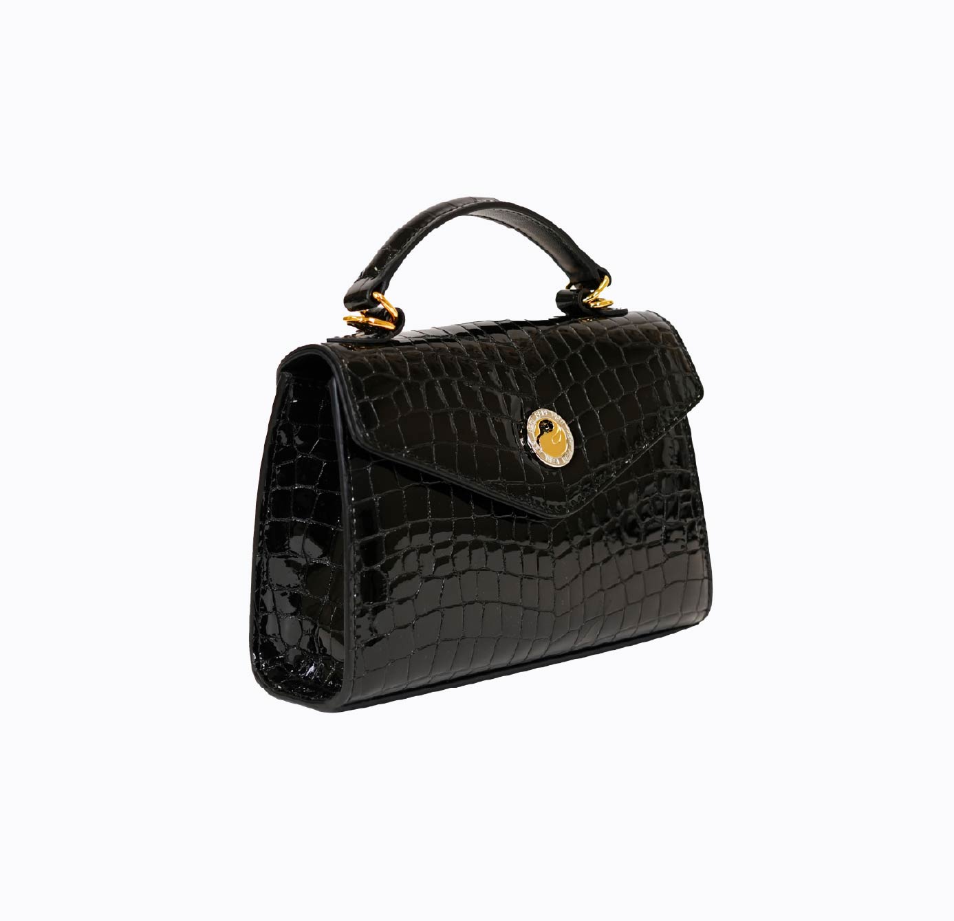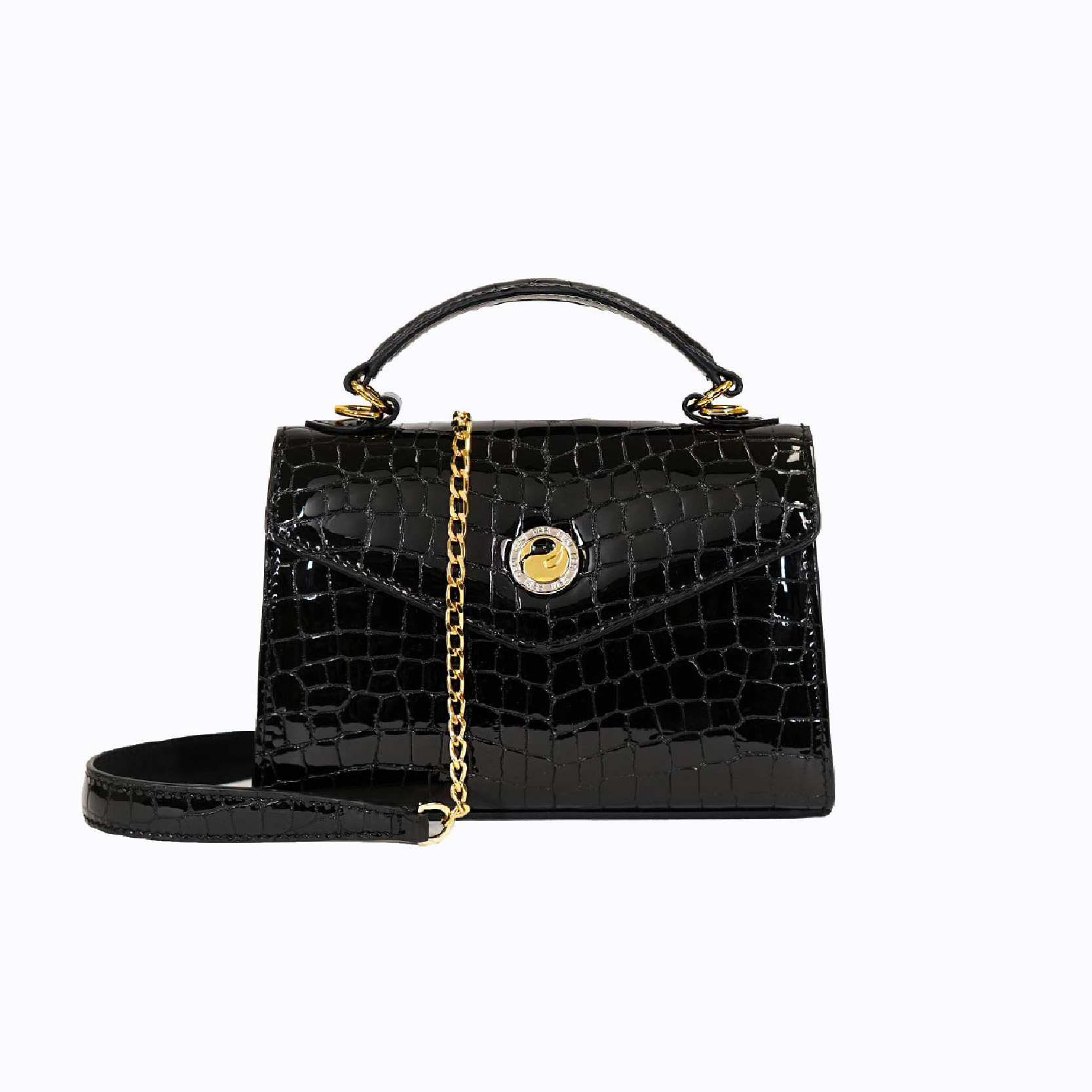 Timeless sophistication meets compact style in the FERI Black Mini Handbag. Expertly crafted from glossy patent leather with a refined croc-embossed texture, this structured mini bag exudes elegance. The envelope-style flap is adorned with a polished round metal clasp featuring the FERI insignia, while the top handle with gold-tone hardware adds a luxurious touch. Perfect for carrying your essentials with grace, this handbag transitions effortlessly from daytime outings to evening occasions.