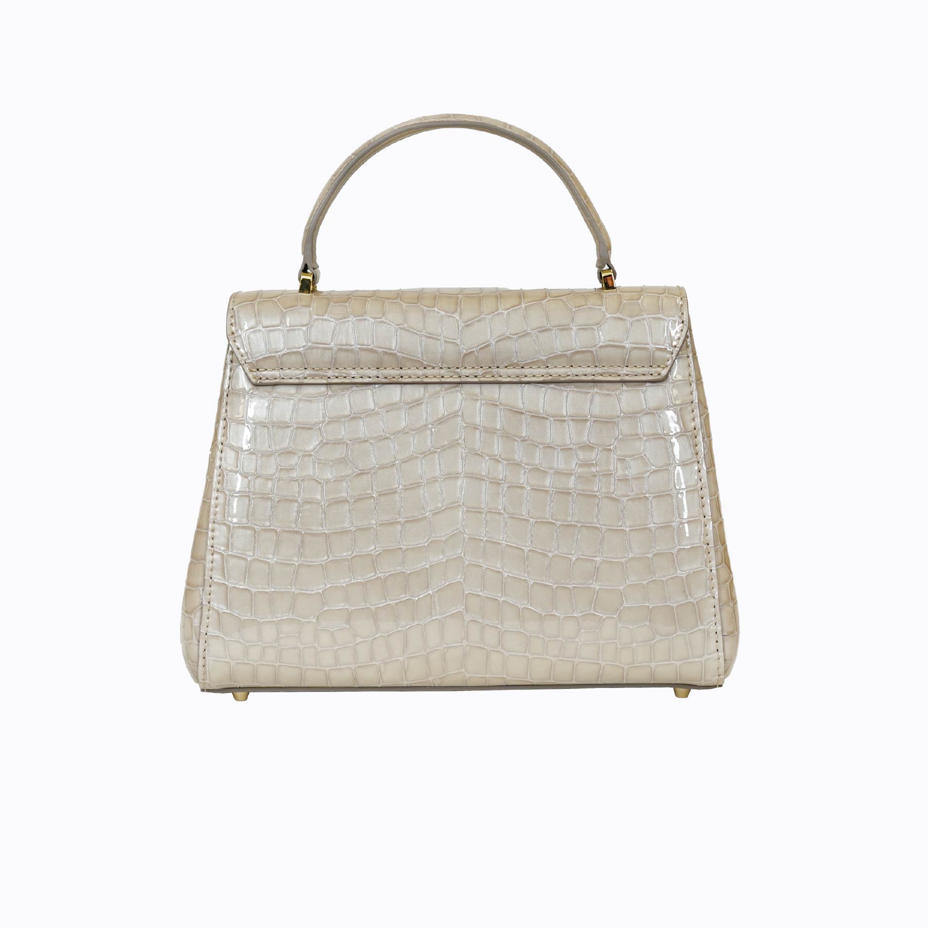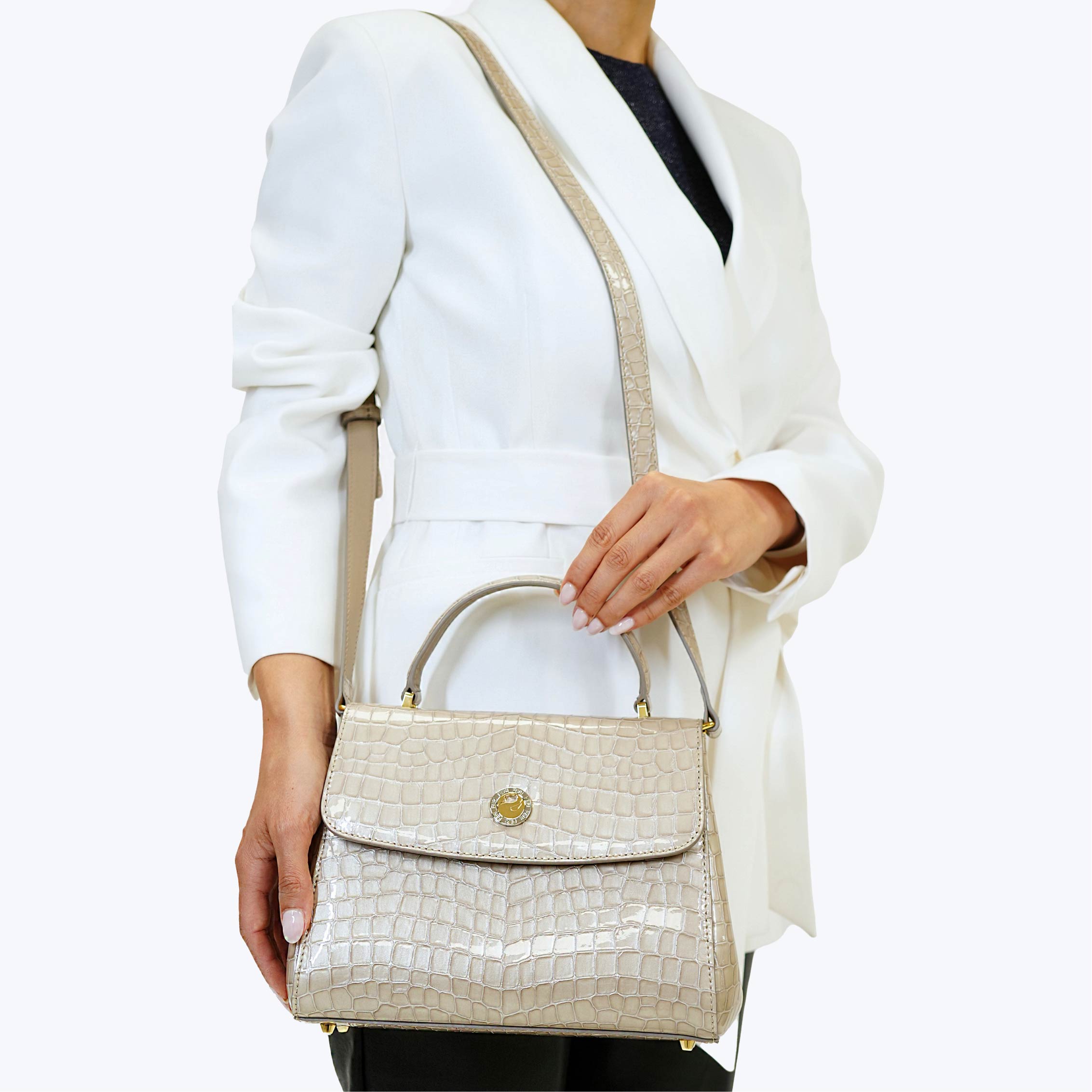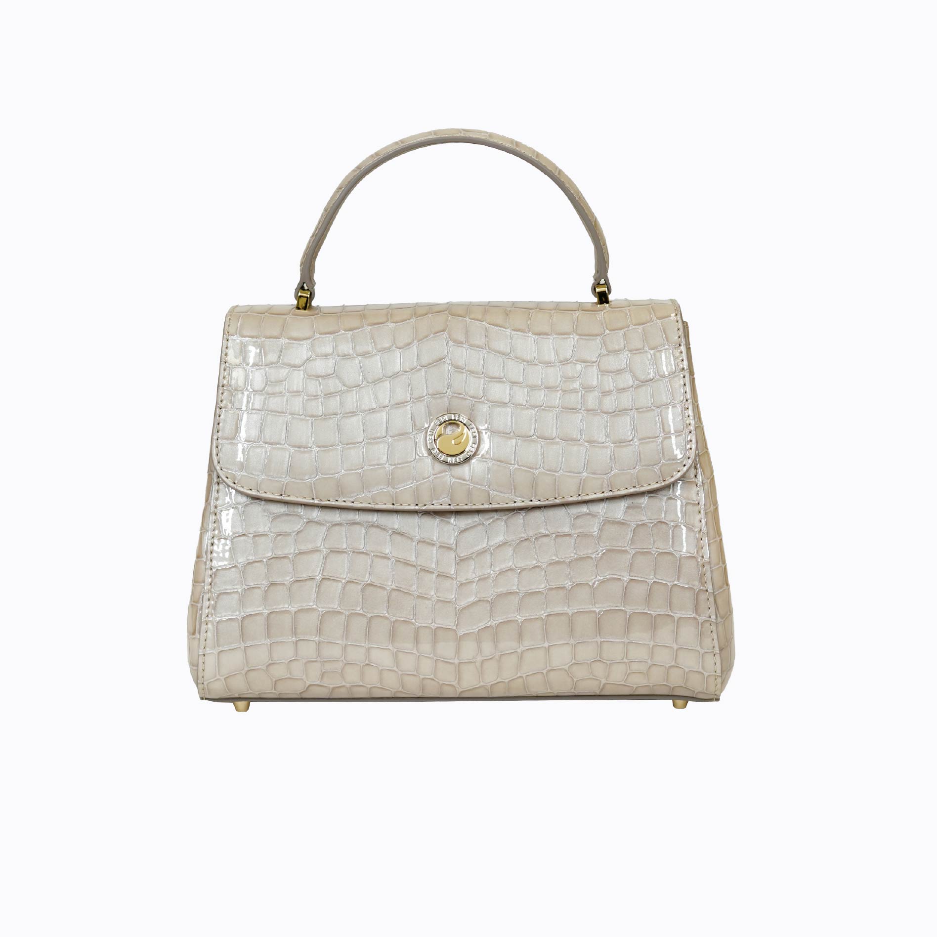 Step into timeless elegance with the FERI Beige Medium Handbag, a perfect fusion of classic sophistication and modern luxury. Crafted from high-shine patent leather in a refined beige tone, this handbag features an all-over croc-embossed texture that adds richness and depth. The structured silhouette is elevated by a sleek top handle and secured with a signature gold-and-silver round FERI logo clasp. Roomy yet refined, this bag is ideal for day-to-night transitions.