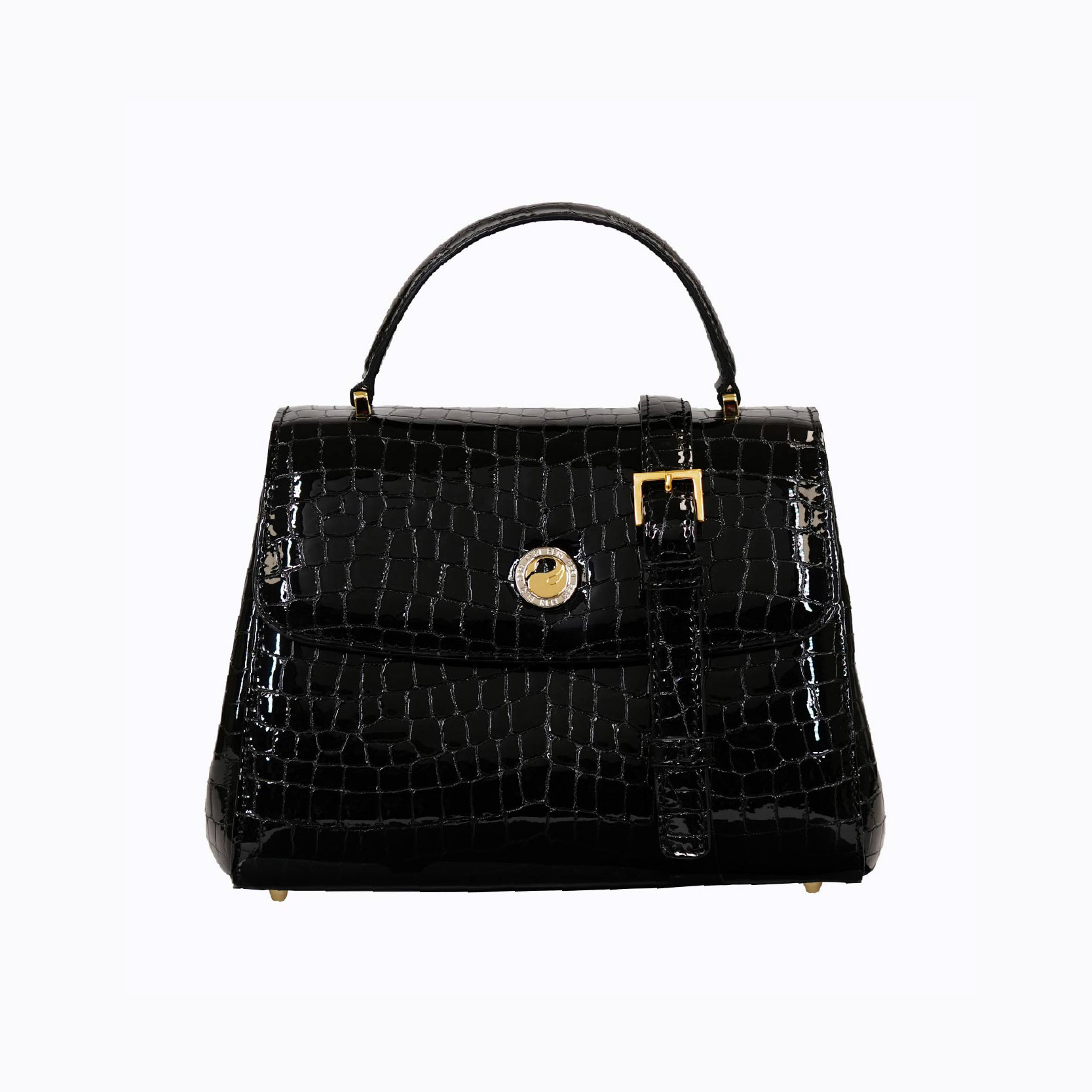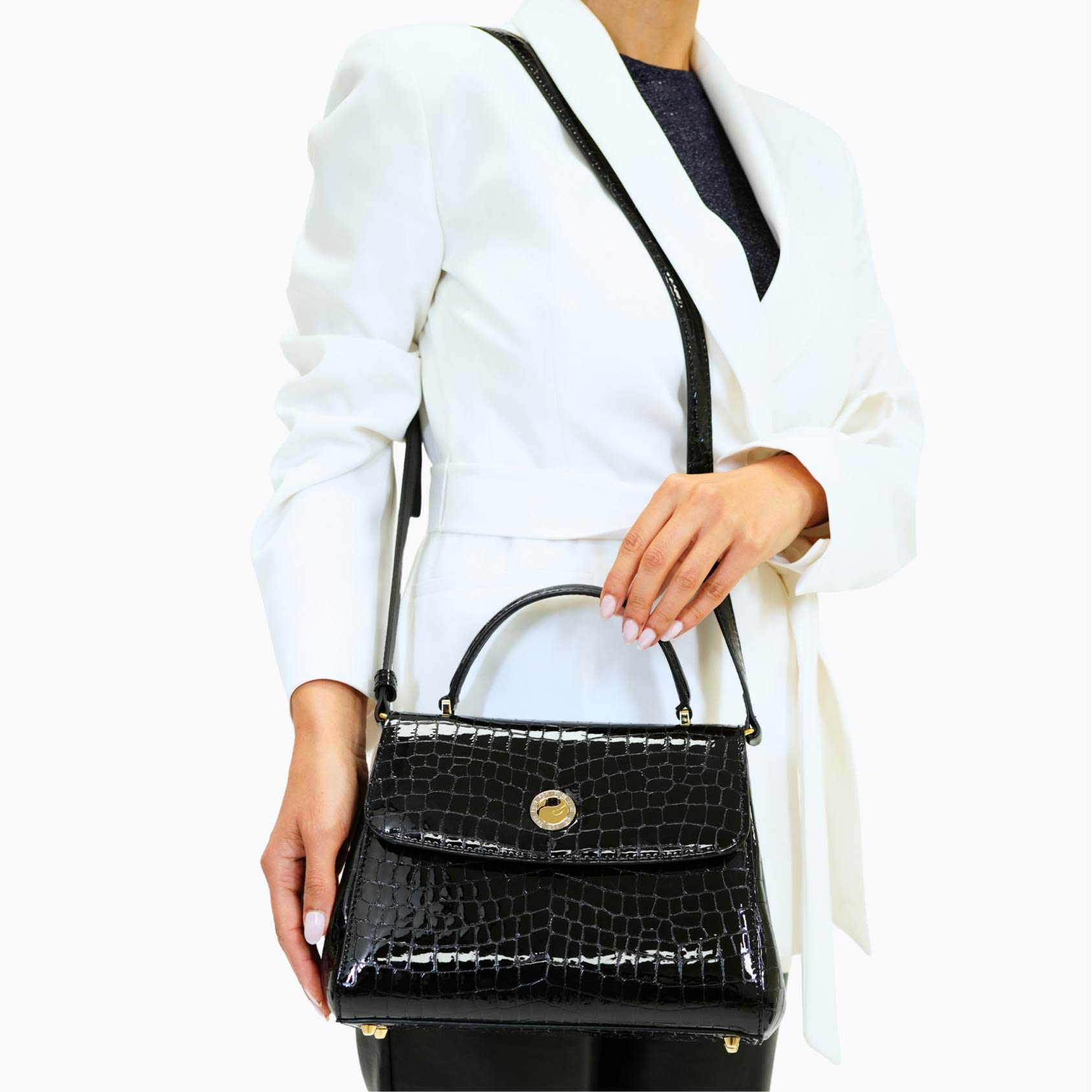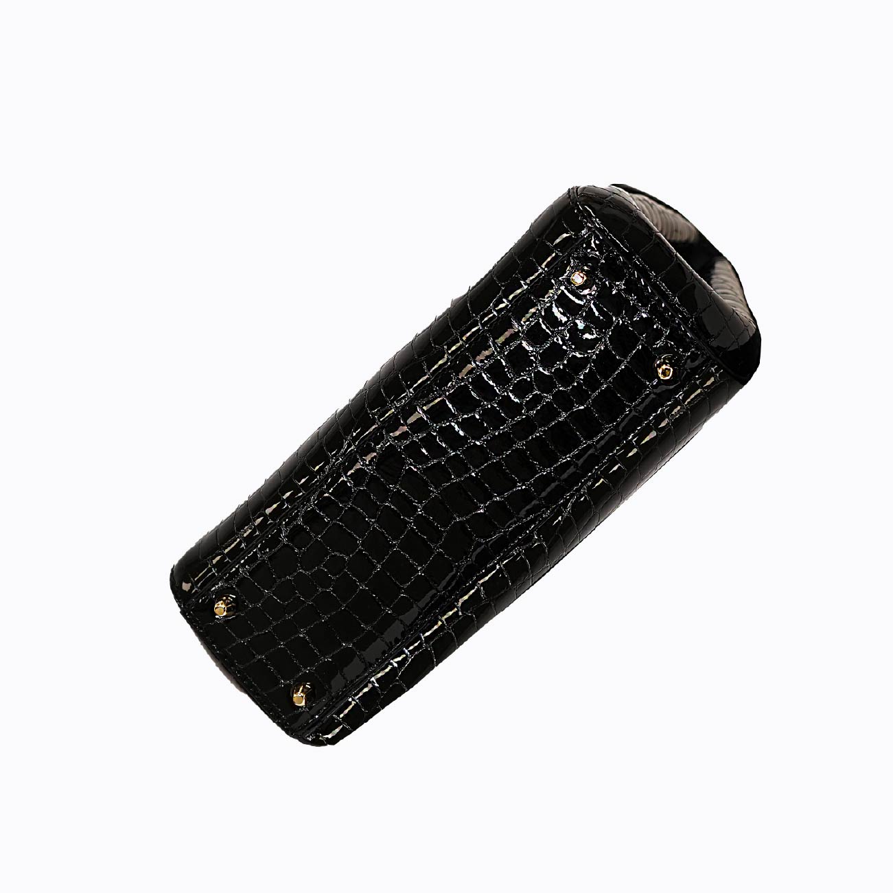 Step into timeless elegance with the FERI Black Medium Handbag, a perfect fusion of classic sophistication and modern luxury. Crafted from high-shine patent leather in a refined black tone, this handbag features an all-over croc-embossed texture that adds richness and depth. The structured silhouette is elevated by a sleek top handle and secured with a signature gold-and-silver round FERI logo clasp. Roomy yet refined, this bag is ideal for day-to-night transitions.