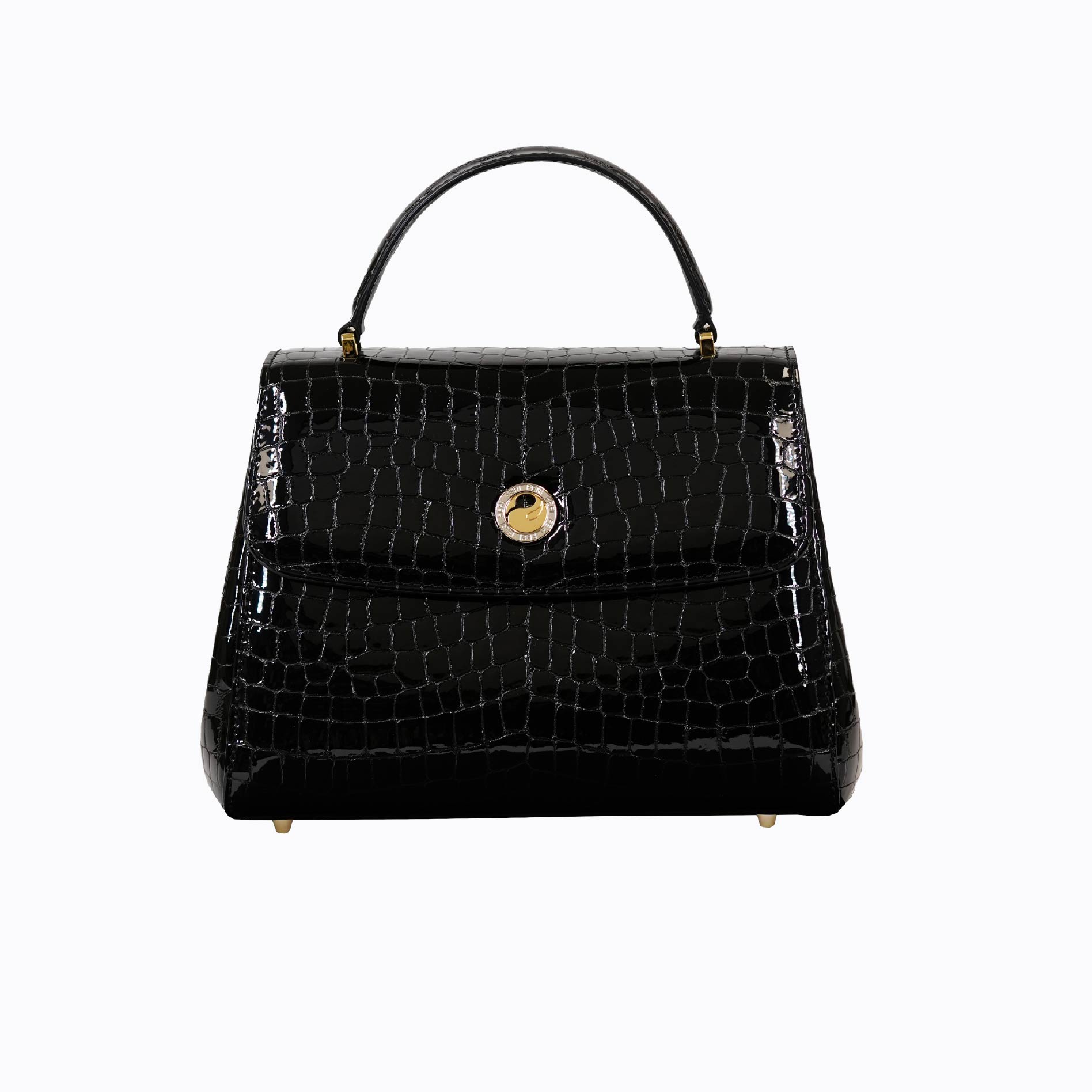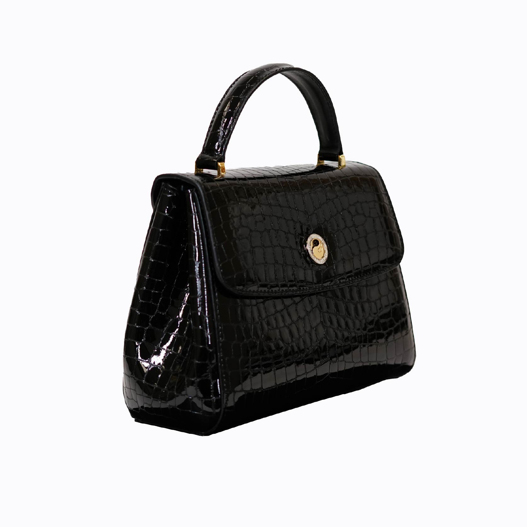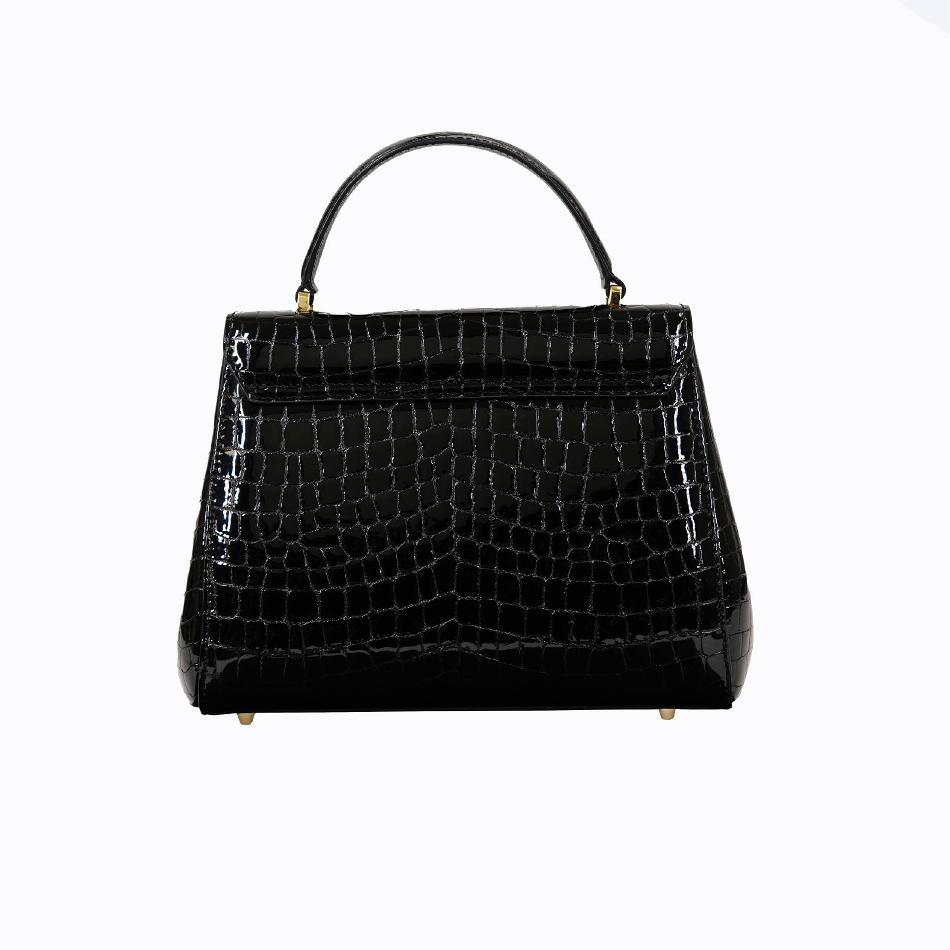 Step into timeless elegance with the FERI Black Medium Handbag, a perfect fusion of classic sophistication and modern luxury. Crafted from high-shine patent leather in a refined black tone, this handbag features an all-over croc-embossed texture that adds richness and depth. The structured silhouette is elevated by a sleek top handle and secured with a signature gold-and-silver round FERI logo clasp. Roomy yet refined, this bag is ideal for day-to-night transitions.
