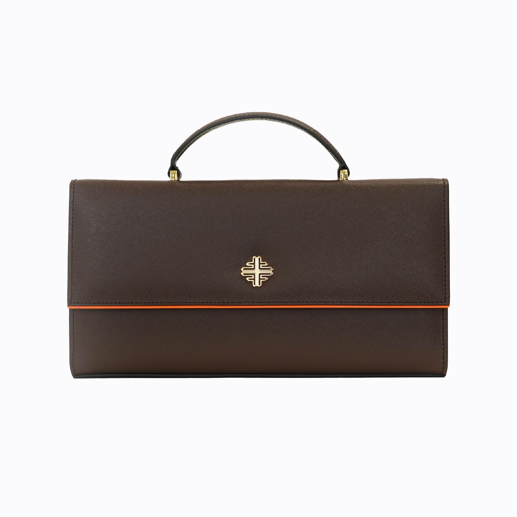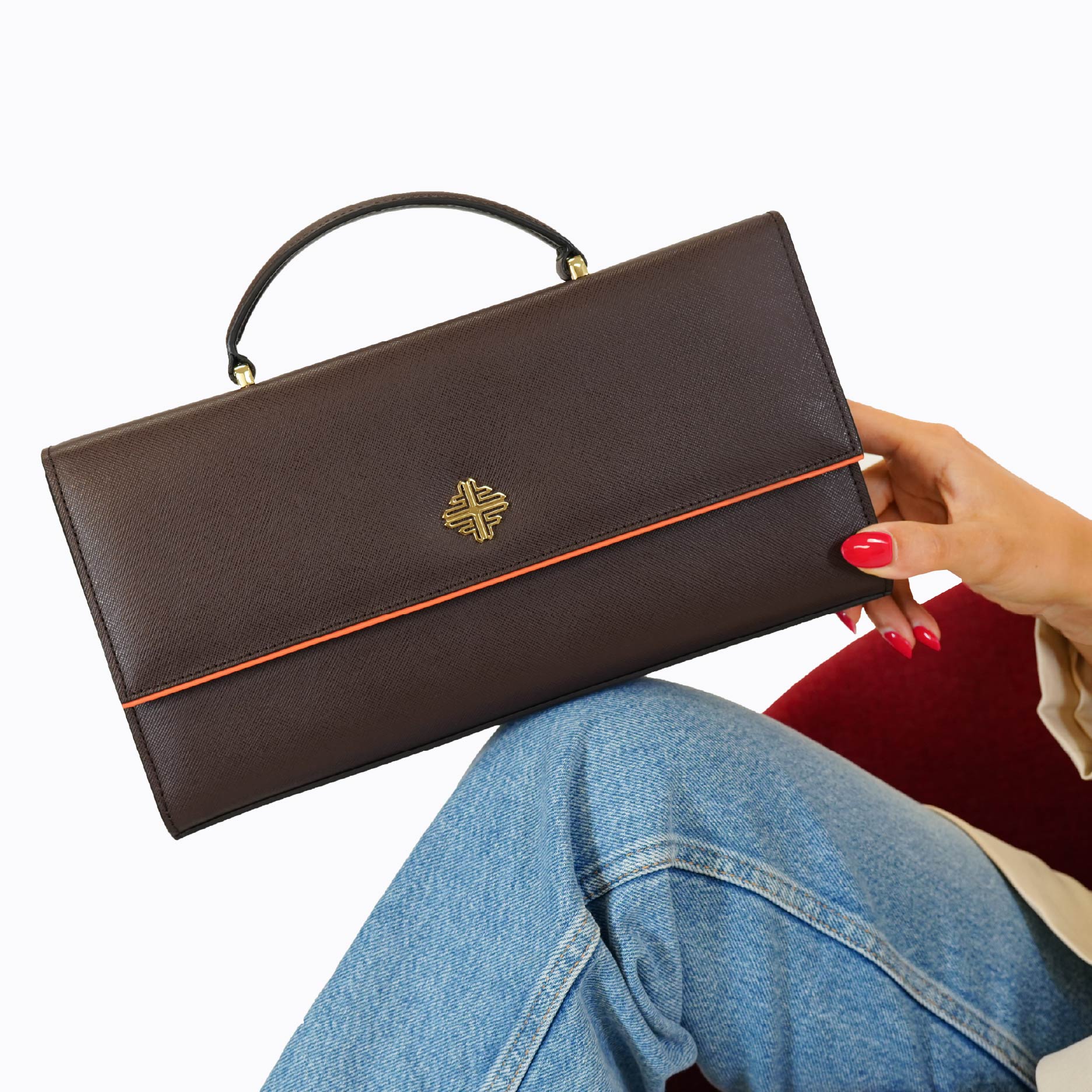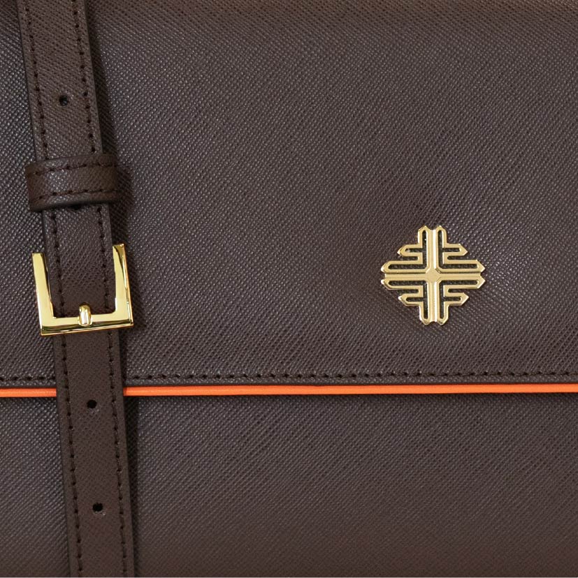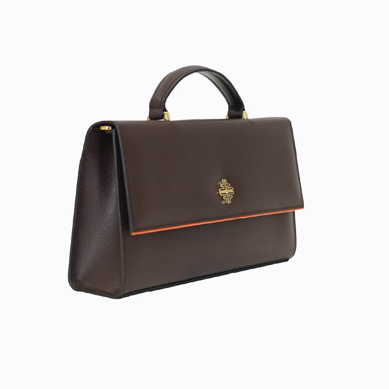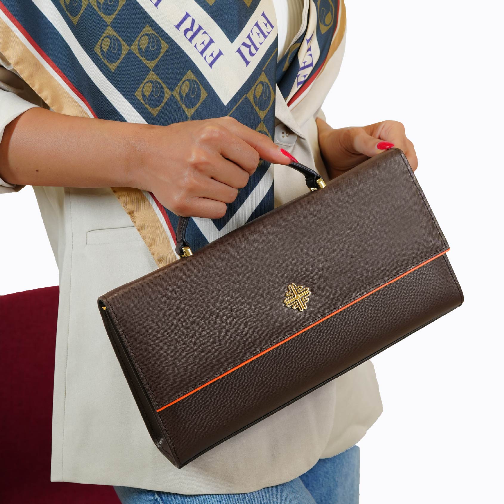 This elegant handbag features a sophisticated cognac exterior, crafted from high-quality textured leather that exudes luxury. The sleek silhouette is accented with an orange trim, adding a pop of color and a modern twist to its classic design. A stylish top handle allows for comfortable carrying, while the magnetic flap closure ensures security and easy access to your essentials. The 4F hardware logo on the front adds a touch of refinement. Perfect for both professional settings and evening outings, this bag is a versatile accessory that enhances any wardrobe.