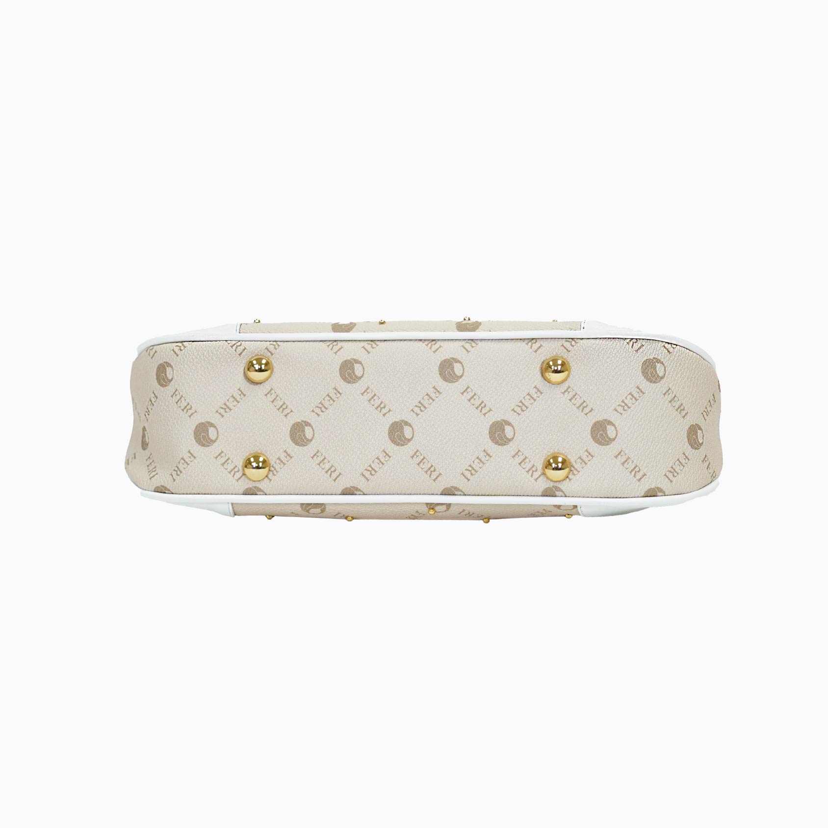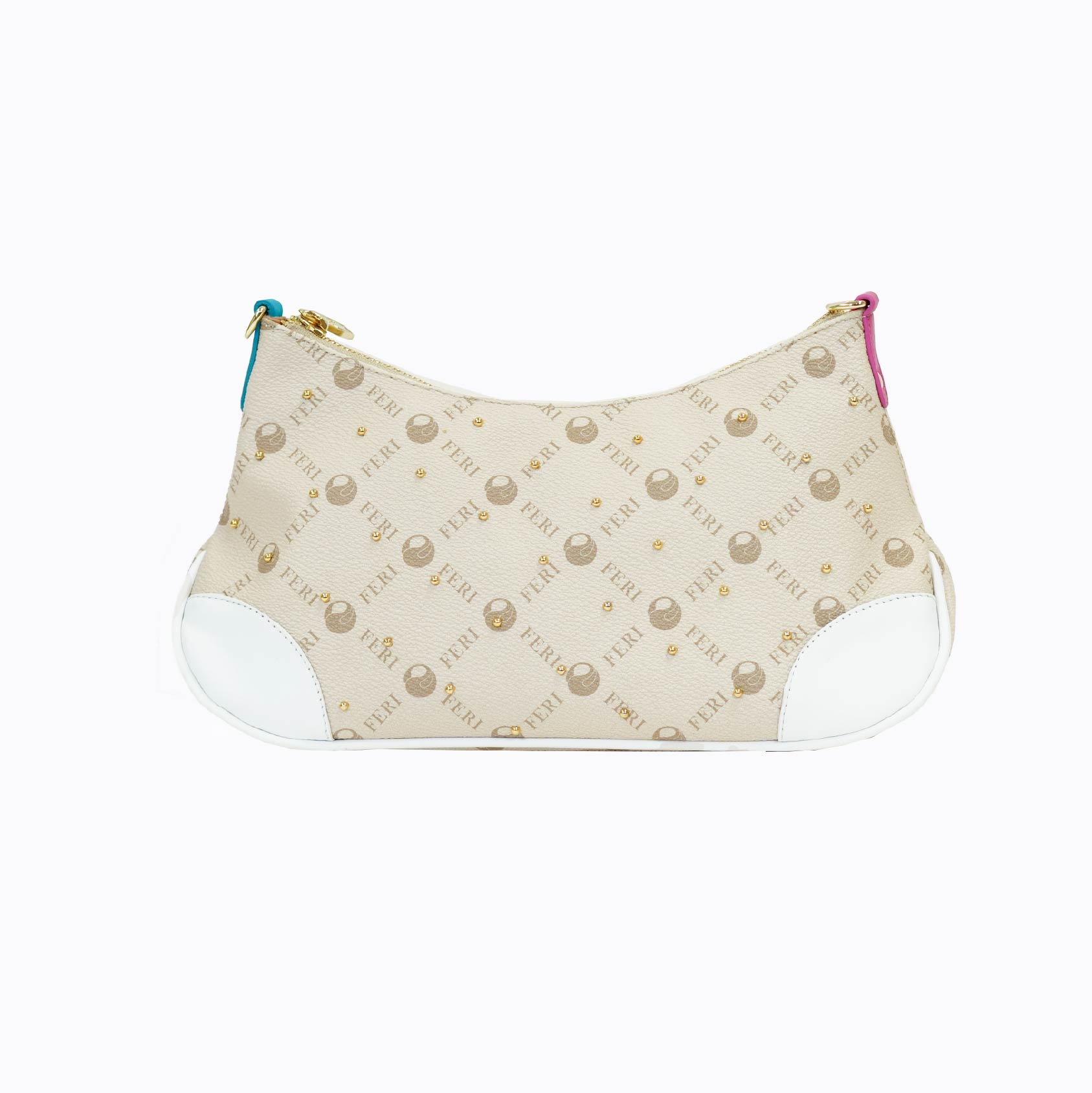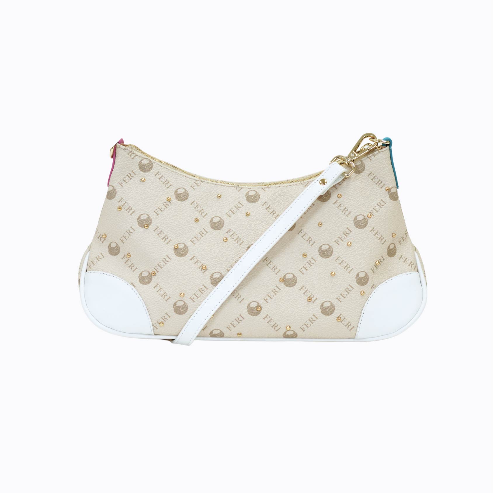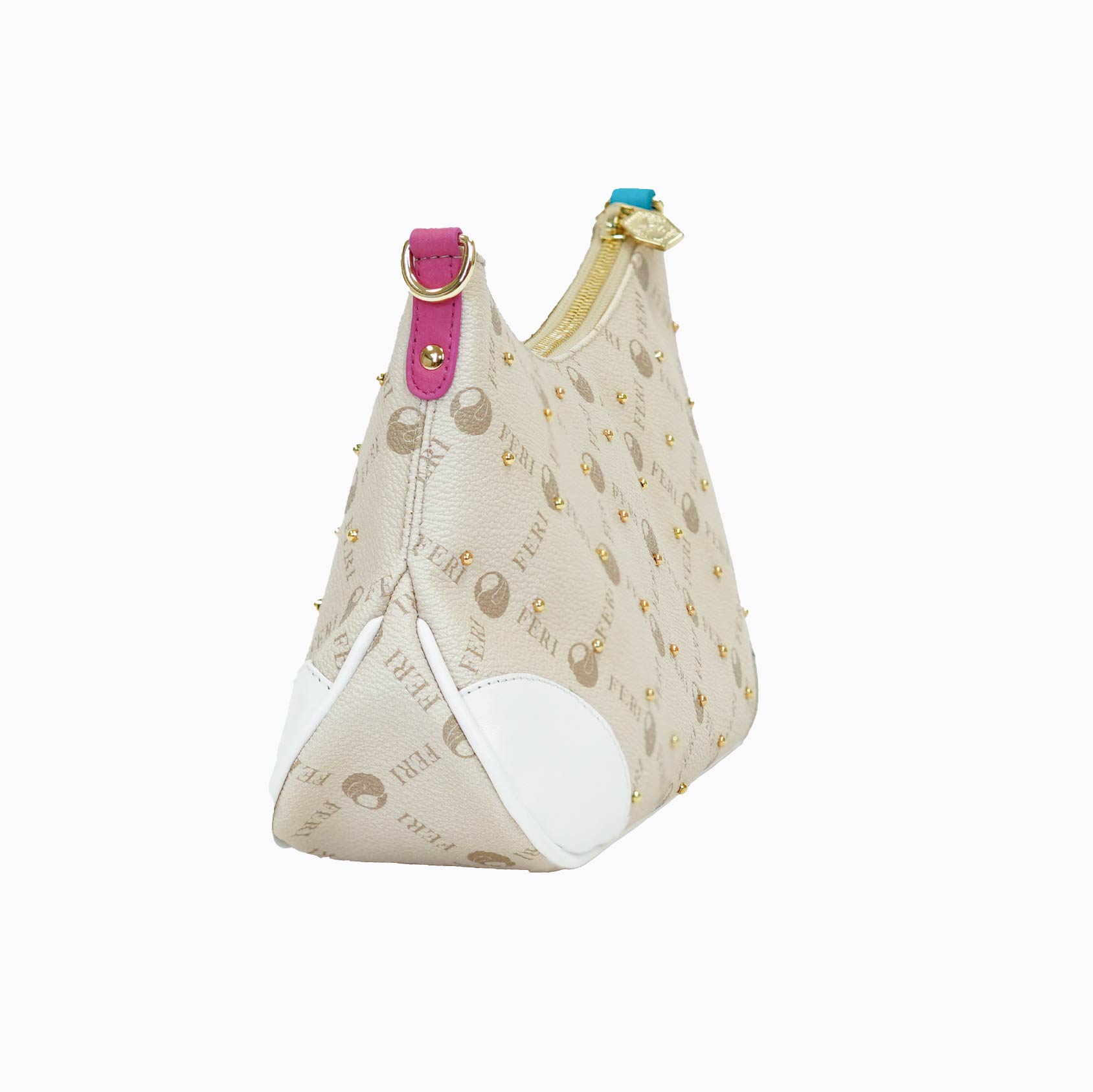A playful twist on elegance, the FERI Monogram Mini Purse combines timeless design with modern flair. Crafted from soft beige leather embossed with the iconic FERI monogram print, this compact silhouette is elevated with sparkling gold-tone studs for a touch of glamour. The contrast white colour corner panels and unexpected color-pop zipper tabs in cranberry and teal add a chic, youthful energy to the design.
