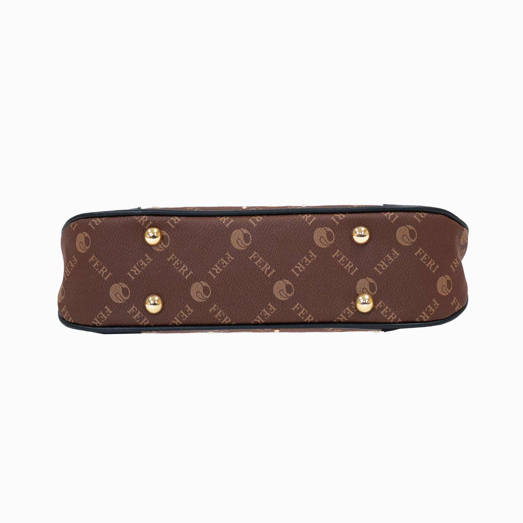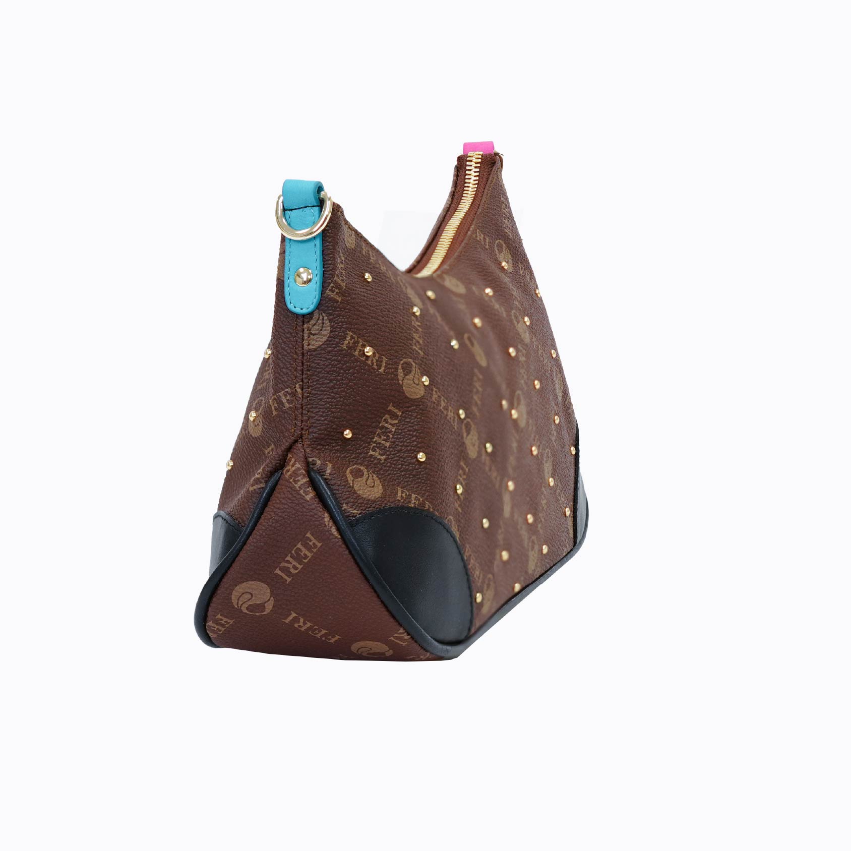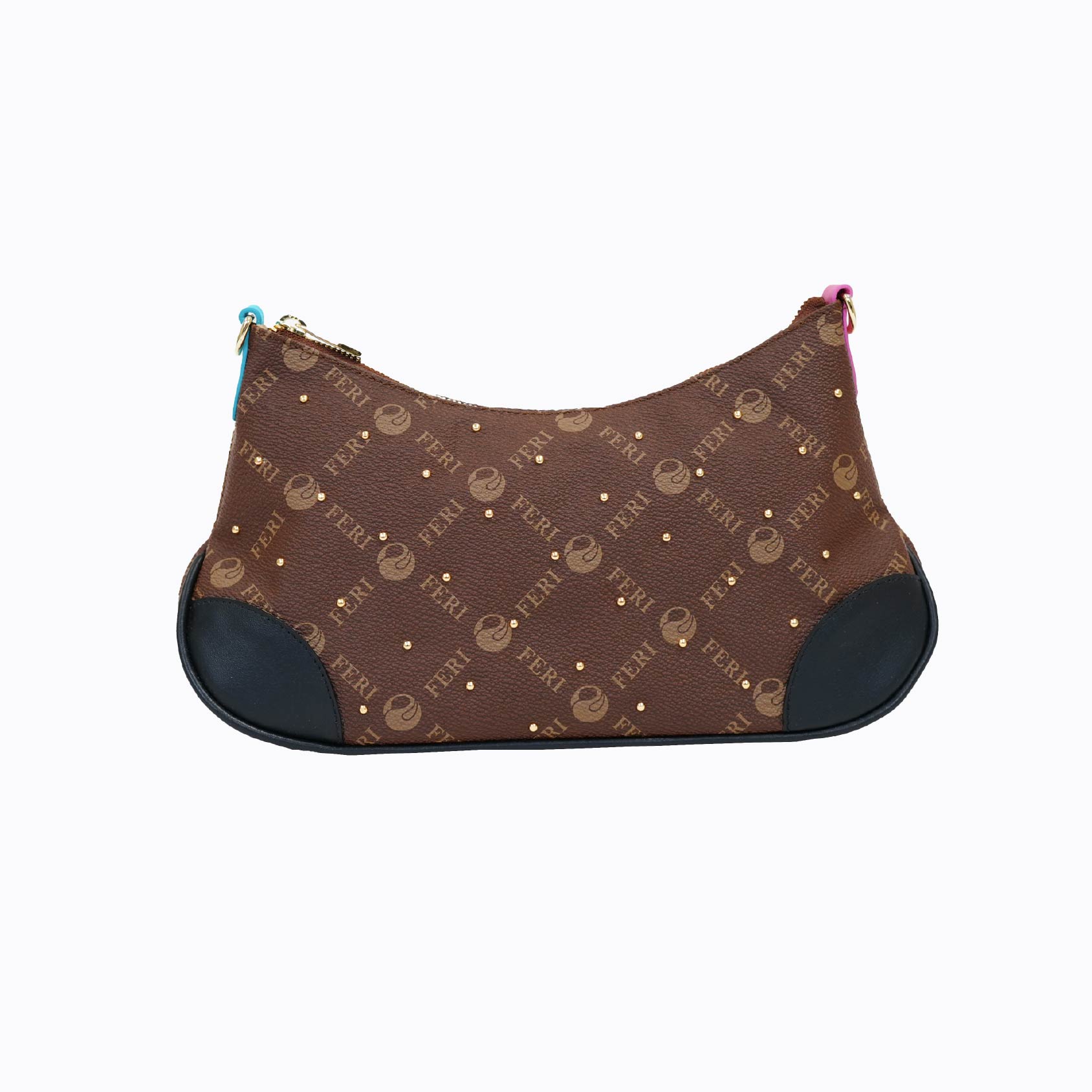 A playful twist on elegance, the FERI Monogram Mini Purse combines timeless design with modern flair. Crafted from classic brown leather embossed with the iconic FERI monogram print, this compact silhouette is elevated with sparkling gold-tone studs for a touch of glamour. The contrast black corner panels and unexpected color-pop zipper tabs in cranberry and teal add a chic, youthful energy to the design.