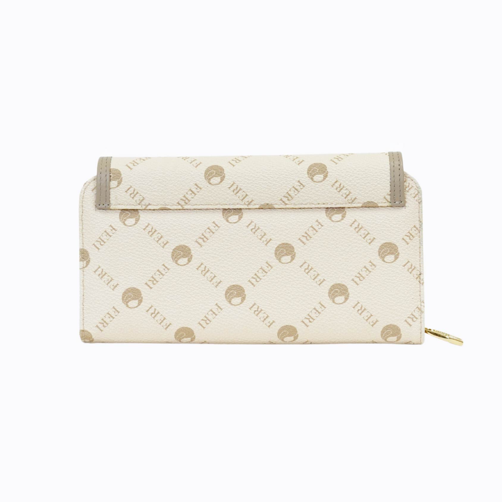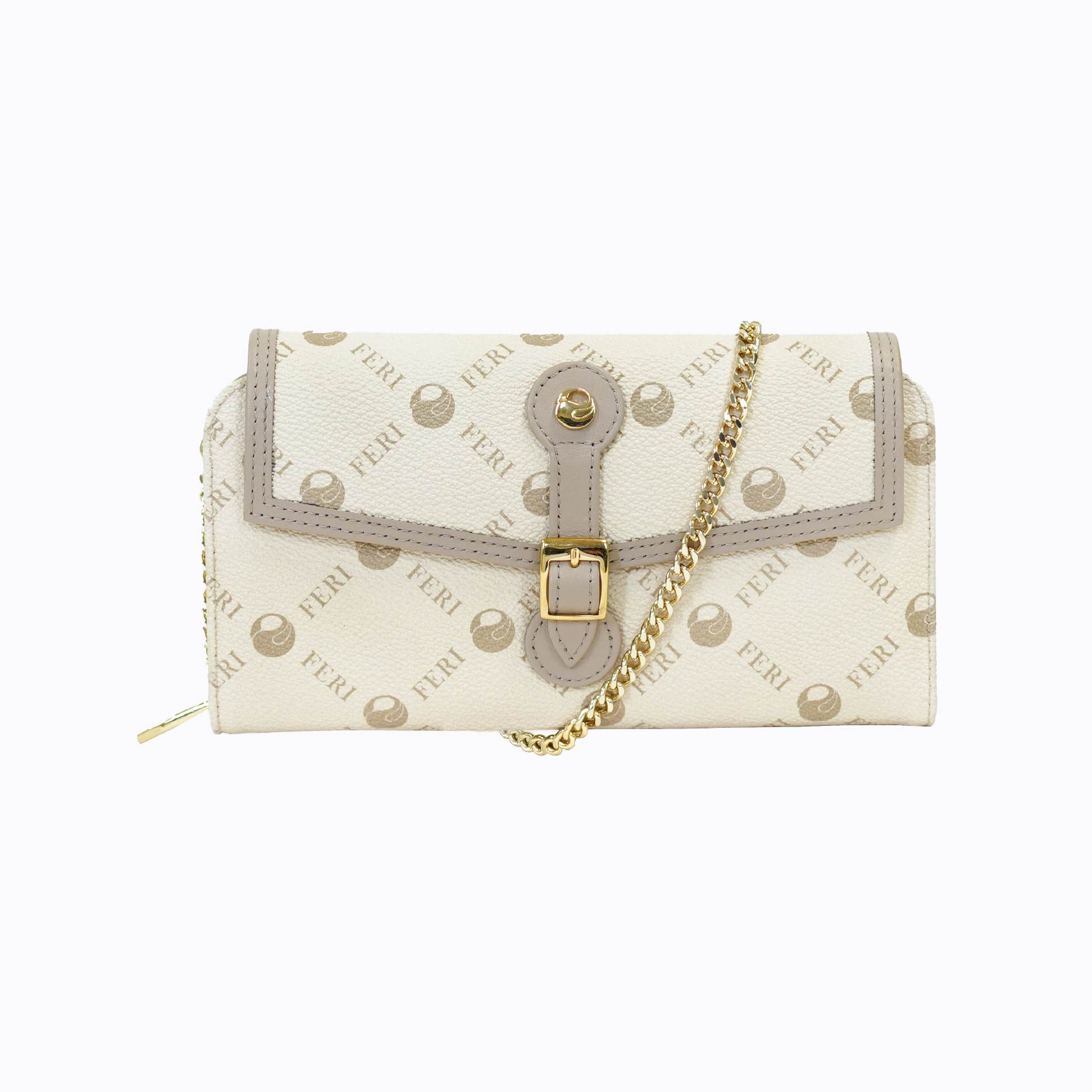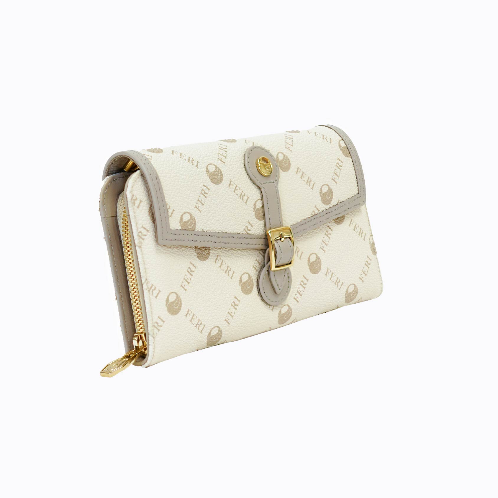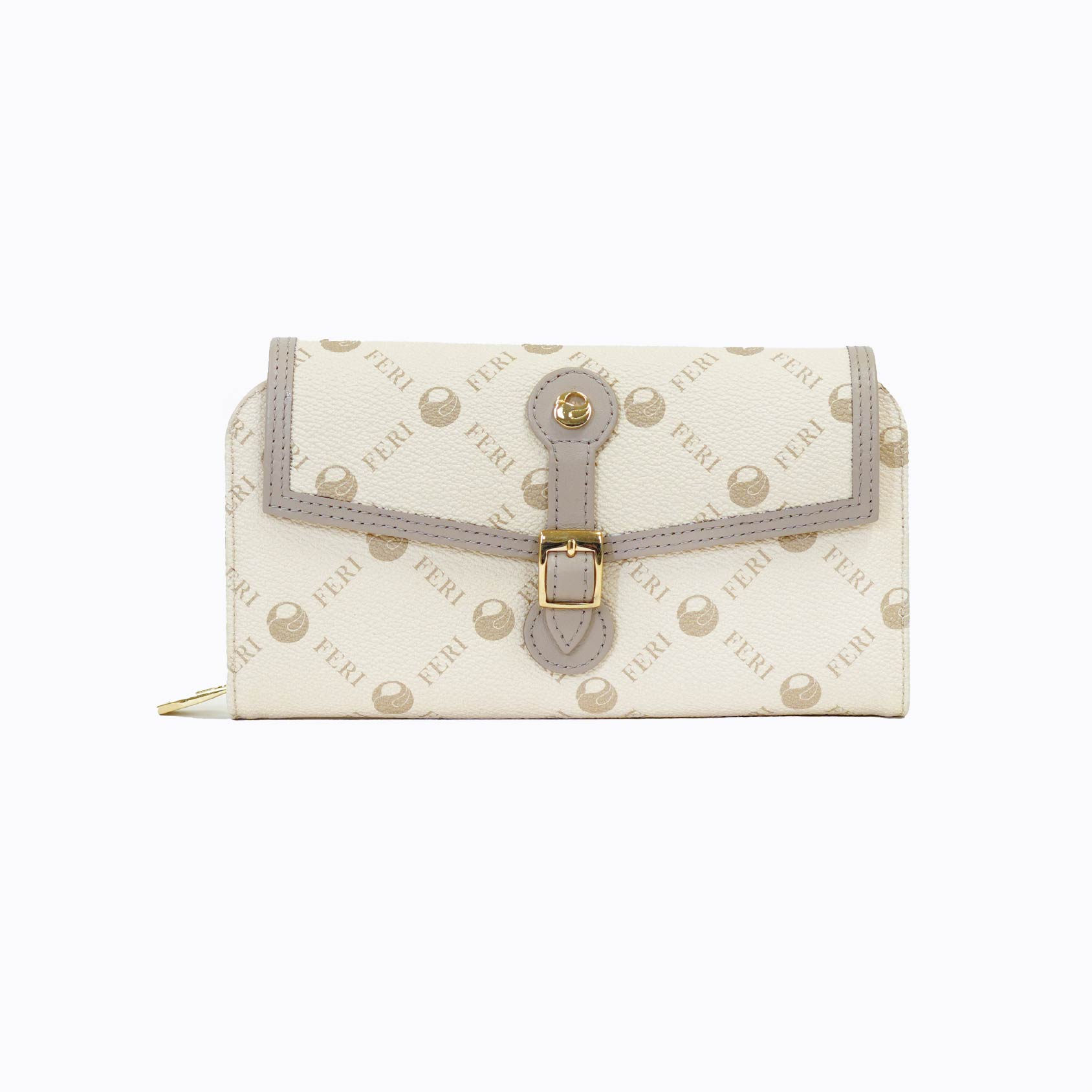 The FERI Signature Buckle-Flap Wallet blends classic elegance with smart utility. Crafted from soft beige textured leather featuring the all-over FERI monogram, this wallet stands out with its structured flap closure, complete with a decorative strap, gold-tone buckle, and button snap for added sophistication.