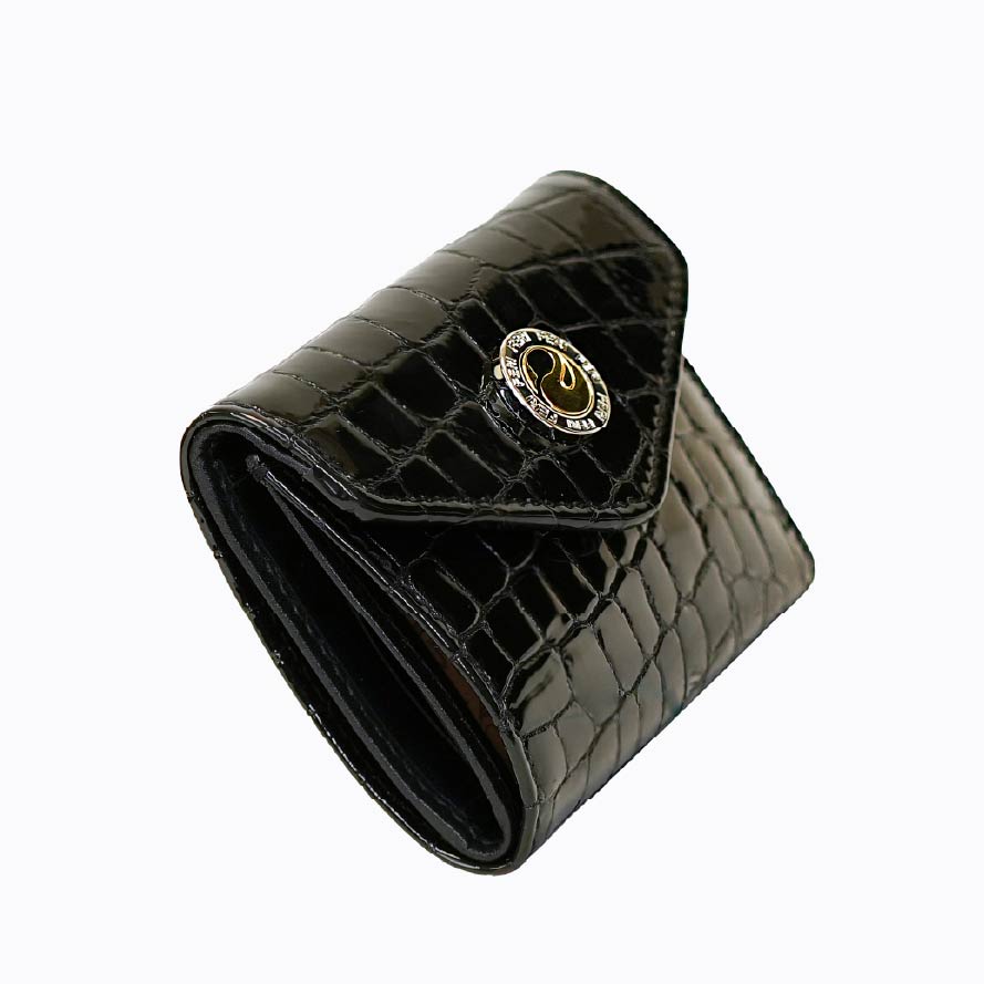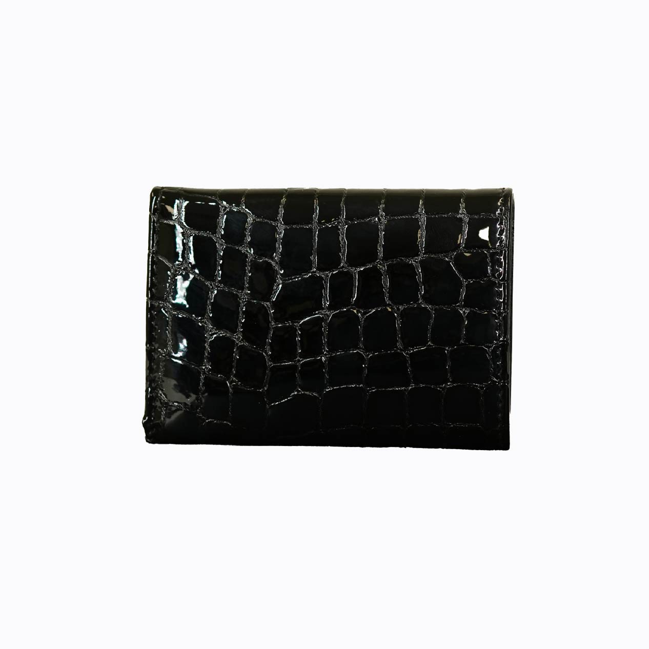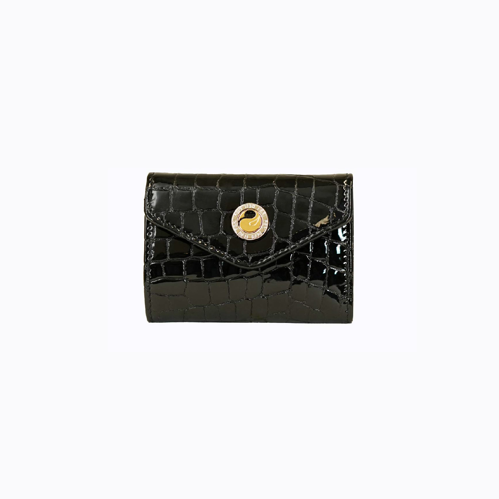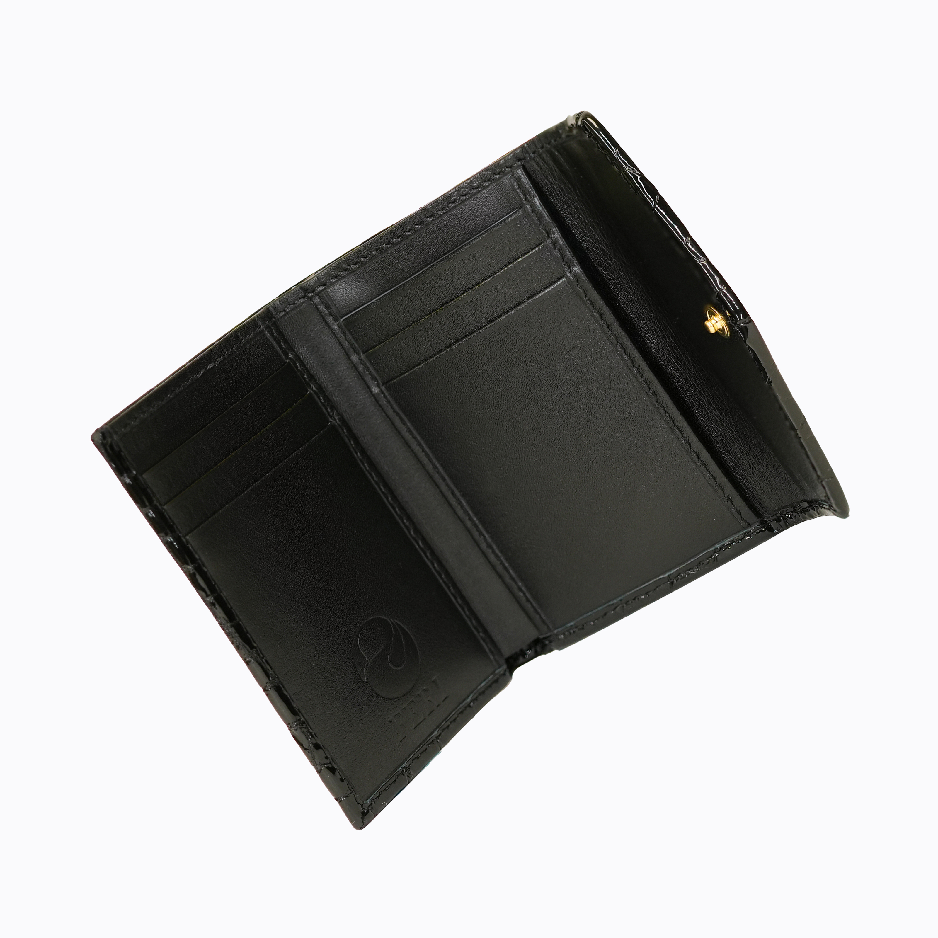 Sleek, sophisticated, and compact, the FERI Black croc-embossed Leather Mini Wallet is the perfect fusion of elegance and everyday function. Crafted from high-gloss croc-embossed leather, this mini wallet brings timeless style to modern utility. The envelope-style silhouette is accented with a polished metallic logo clasp, adding a refined finish. Designed to fit seamlessly in clutches, mini bags, or pockets, it’s ideal for carrying your cards and cash in chic fashion.