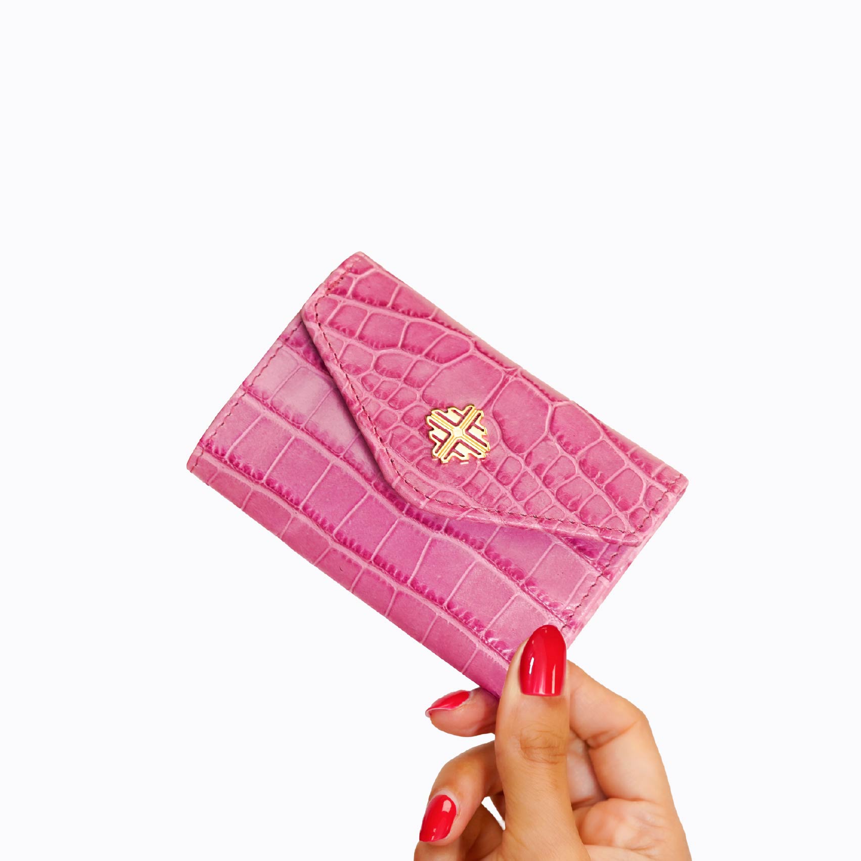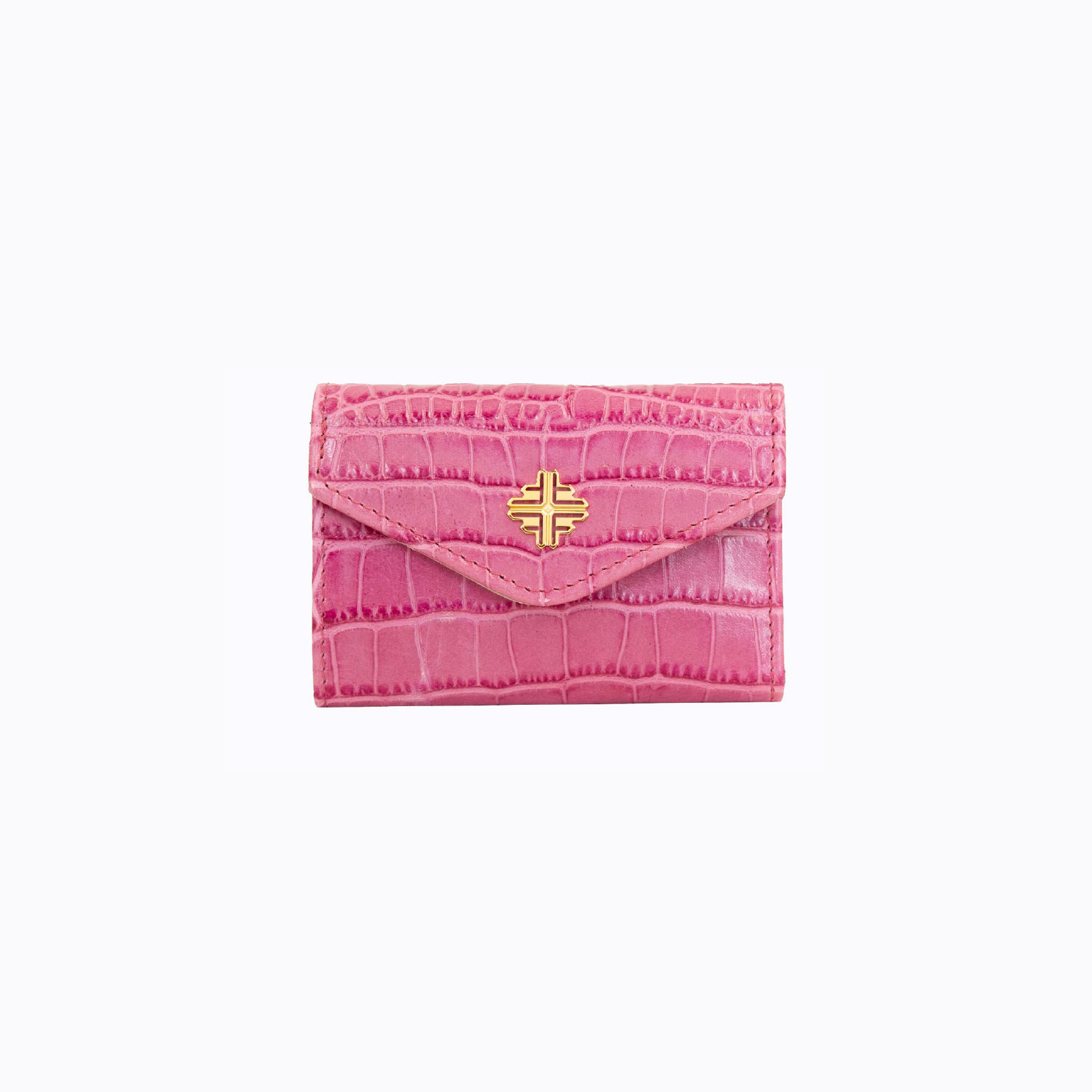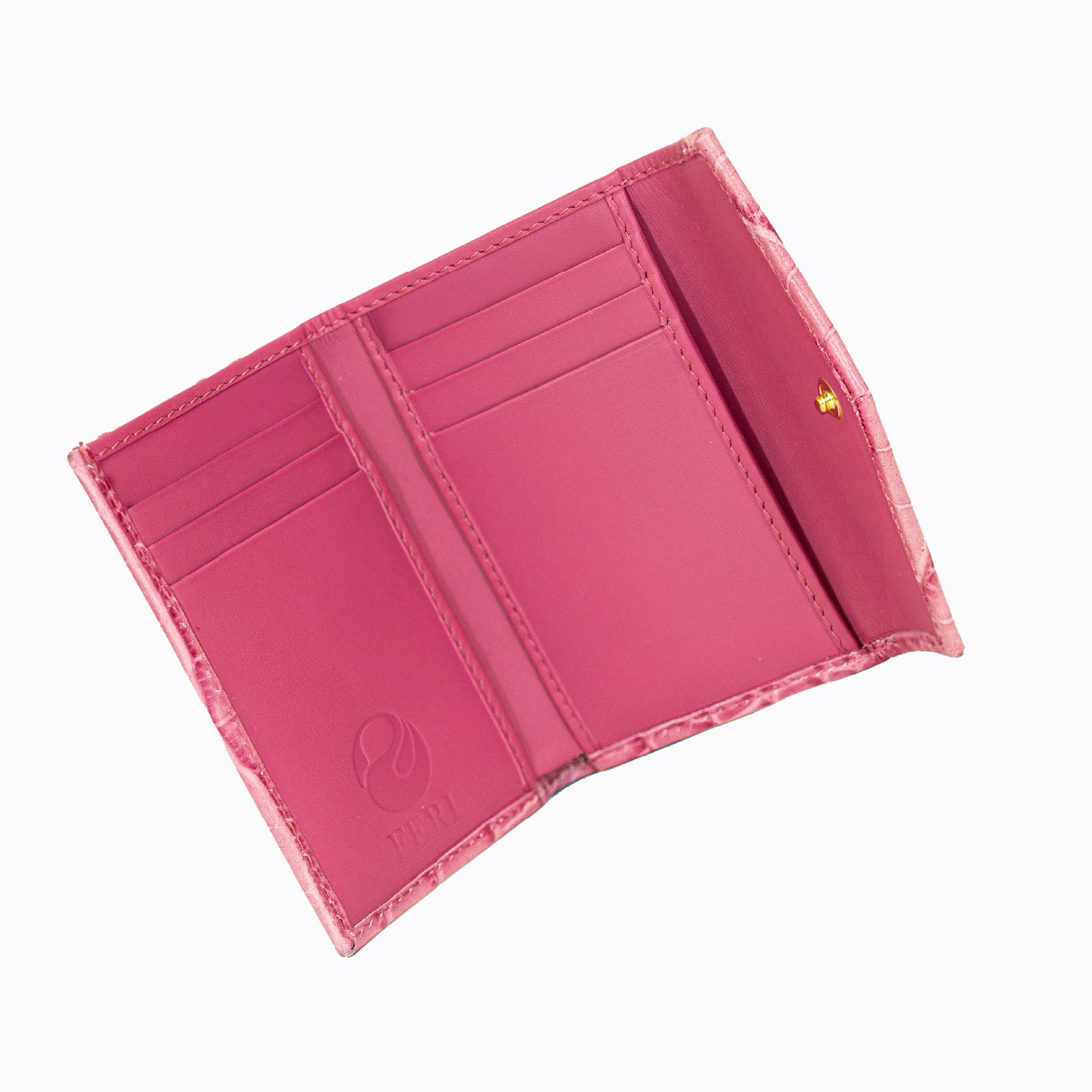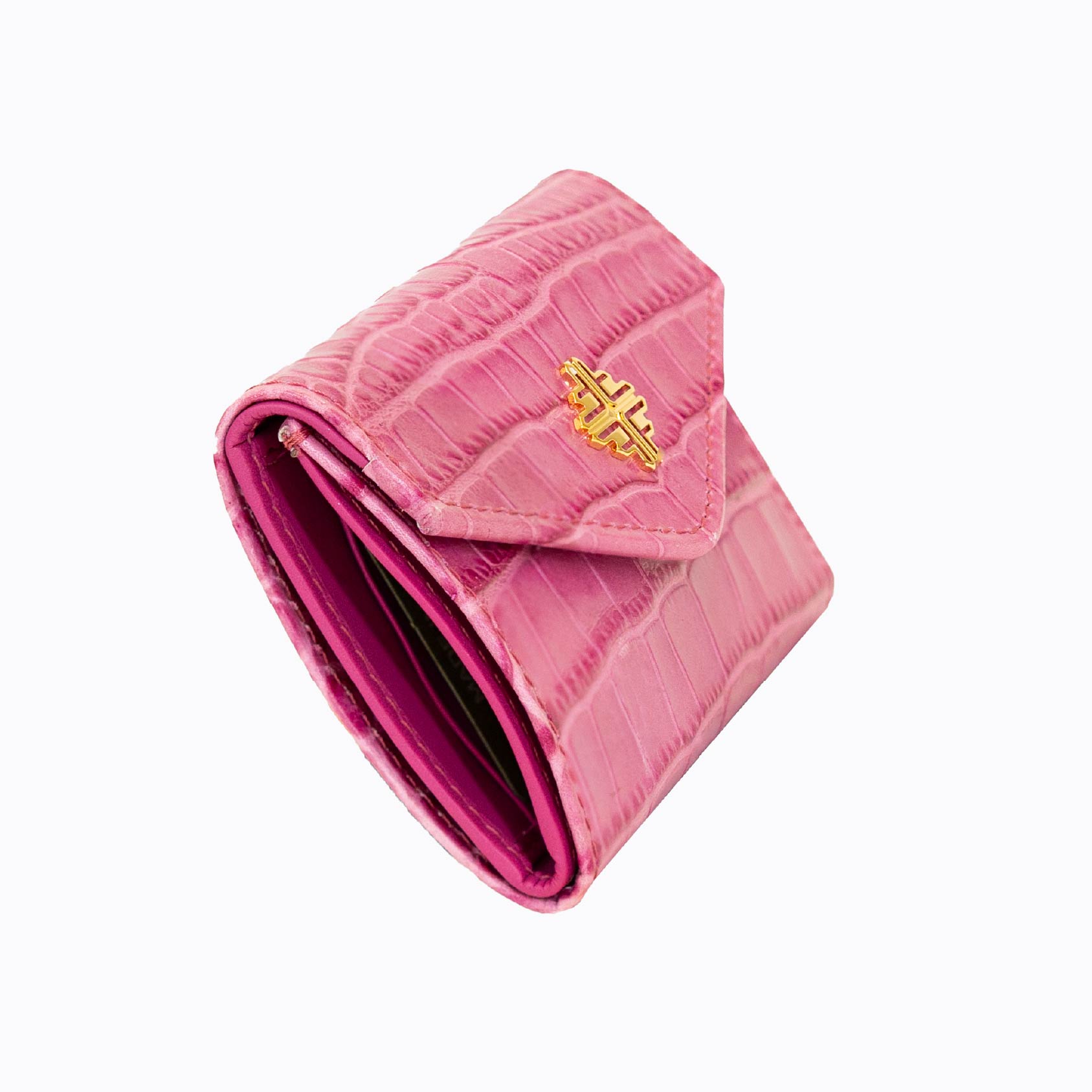 Bold yet refined, the FERI Pink colour Mini Wallet brings a regal touch to your everyday essentials. Crafted in high end leather with a croc-embossed, its pink captures attention while maintaining a sophisticated edge. The envelope silhouette and signature metallic logo clasp combine elegance with function, making it an ideal accessory for both daily use and special occasions.