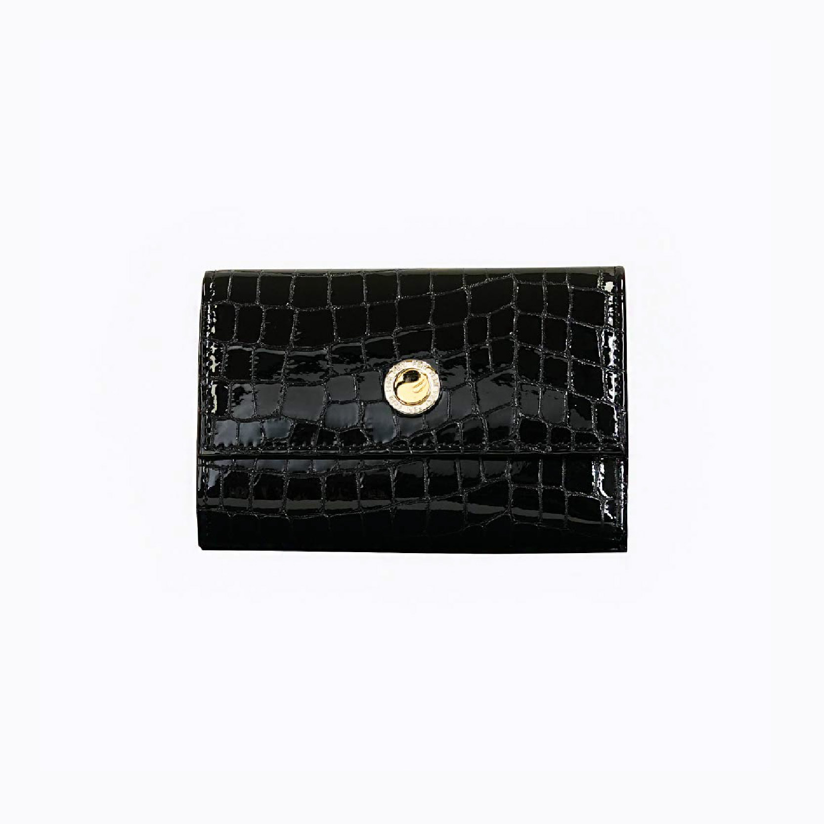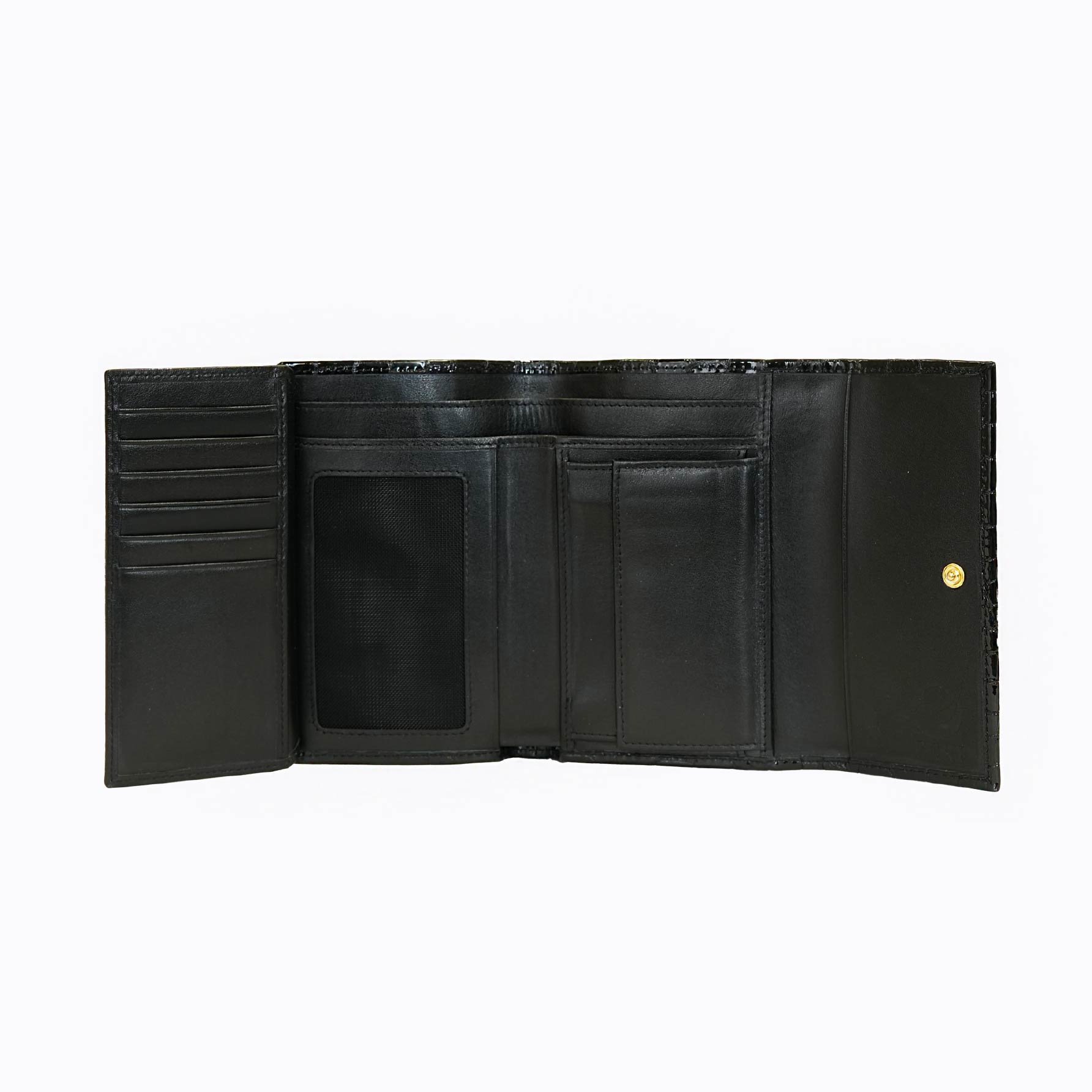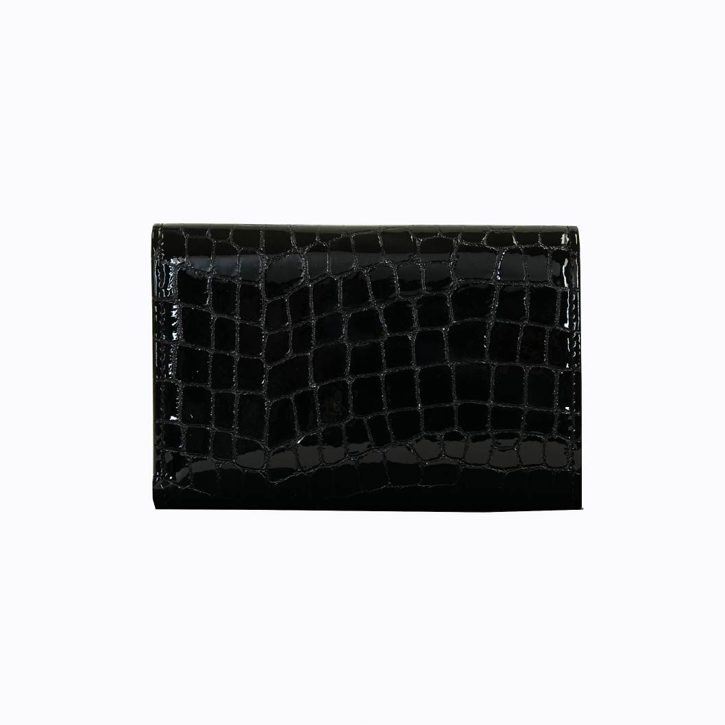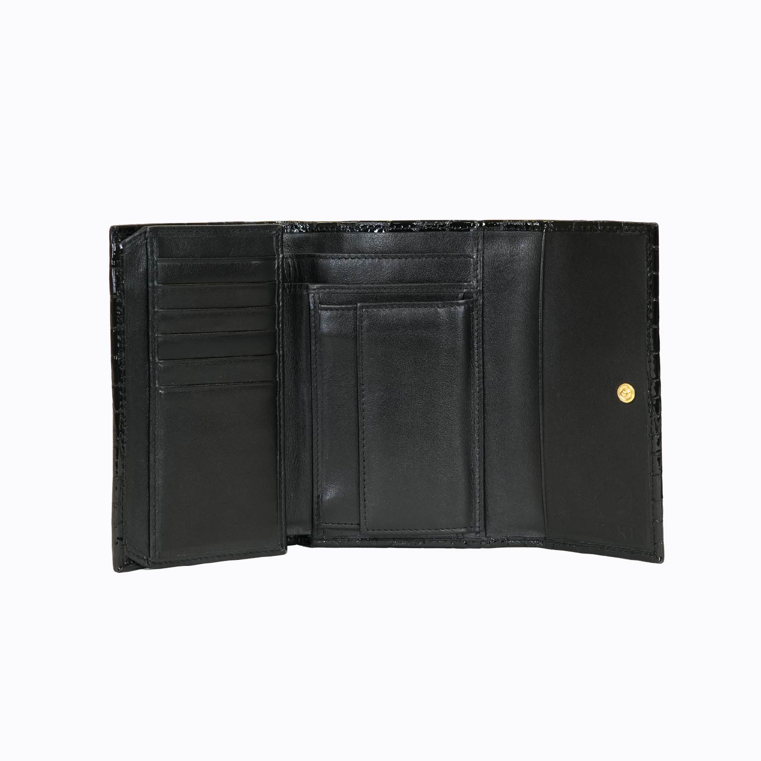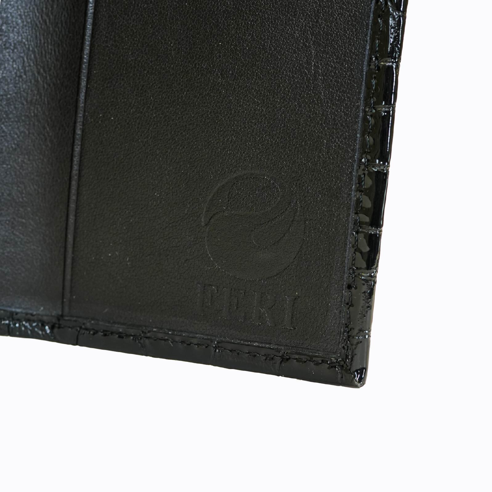 Sleek, structured, and stylish,the FERI Taupe Croc-Embossed Wallet is a refined essential for the modern woman. Crafted from glossy patent leather in a sophisticated black shade, this wallet features a croc-textured exterior and a clean, fold-over design secured by a polished FERI logo clasp. The interior offers practical storage for cards, cash, and other daily necessities, all while maintaining a compact profile that fits perfectly into your handbag.
