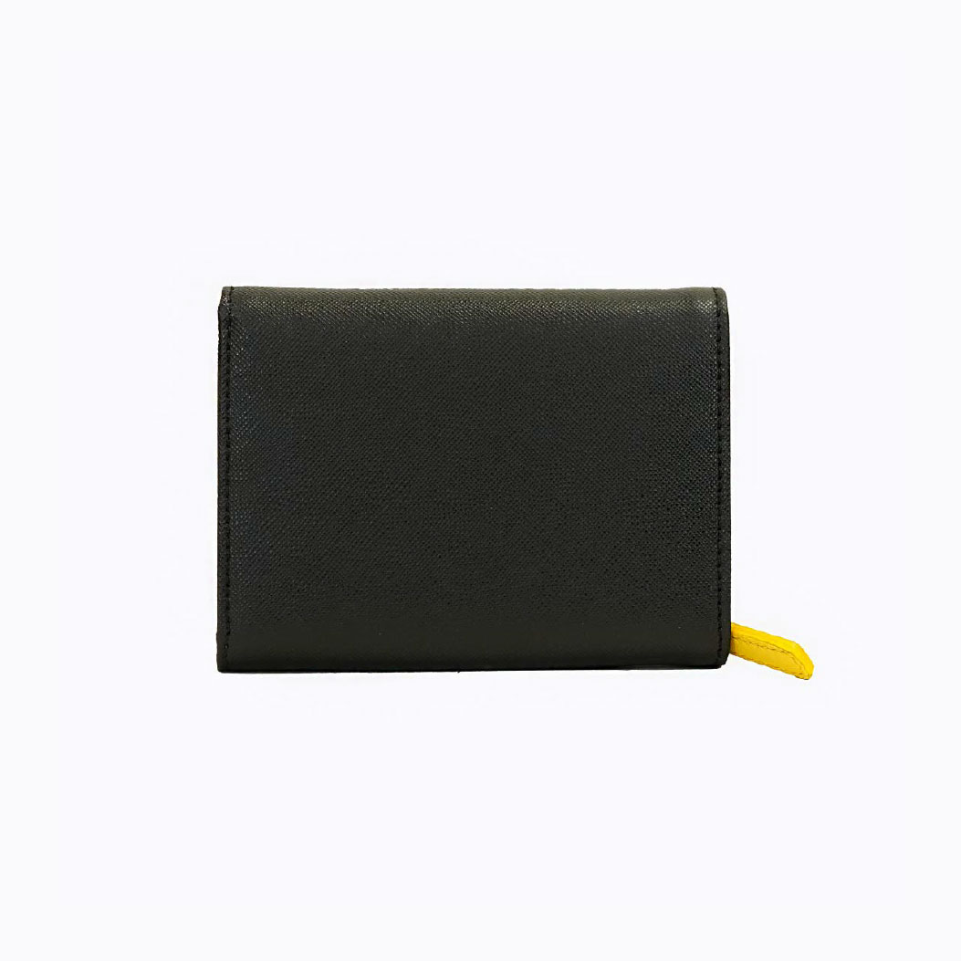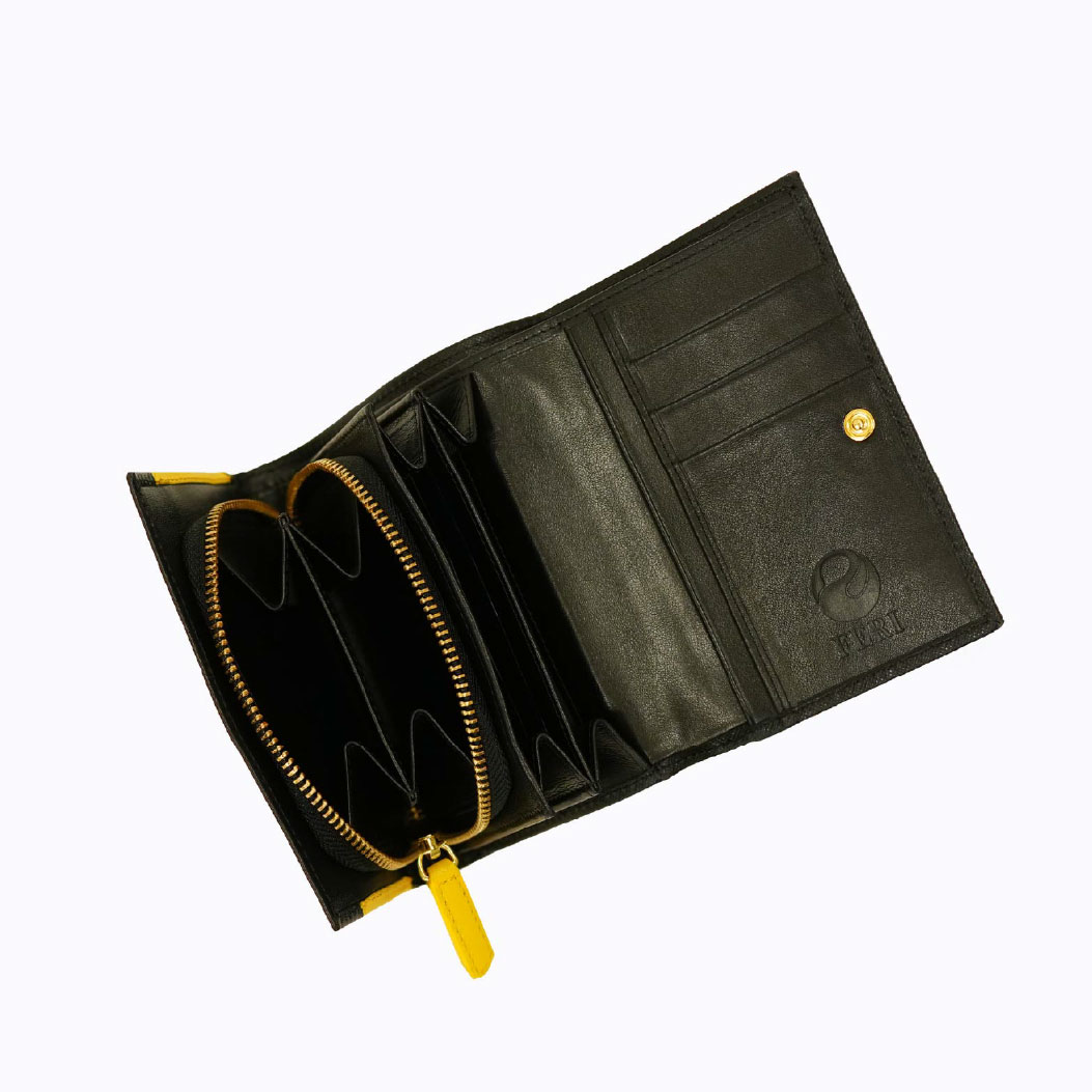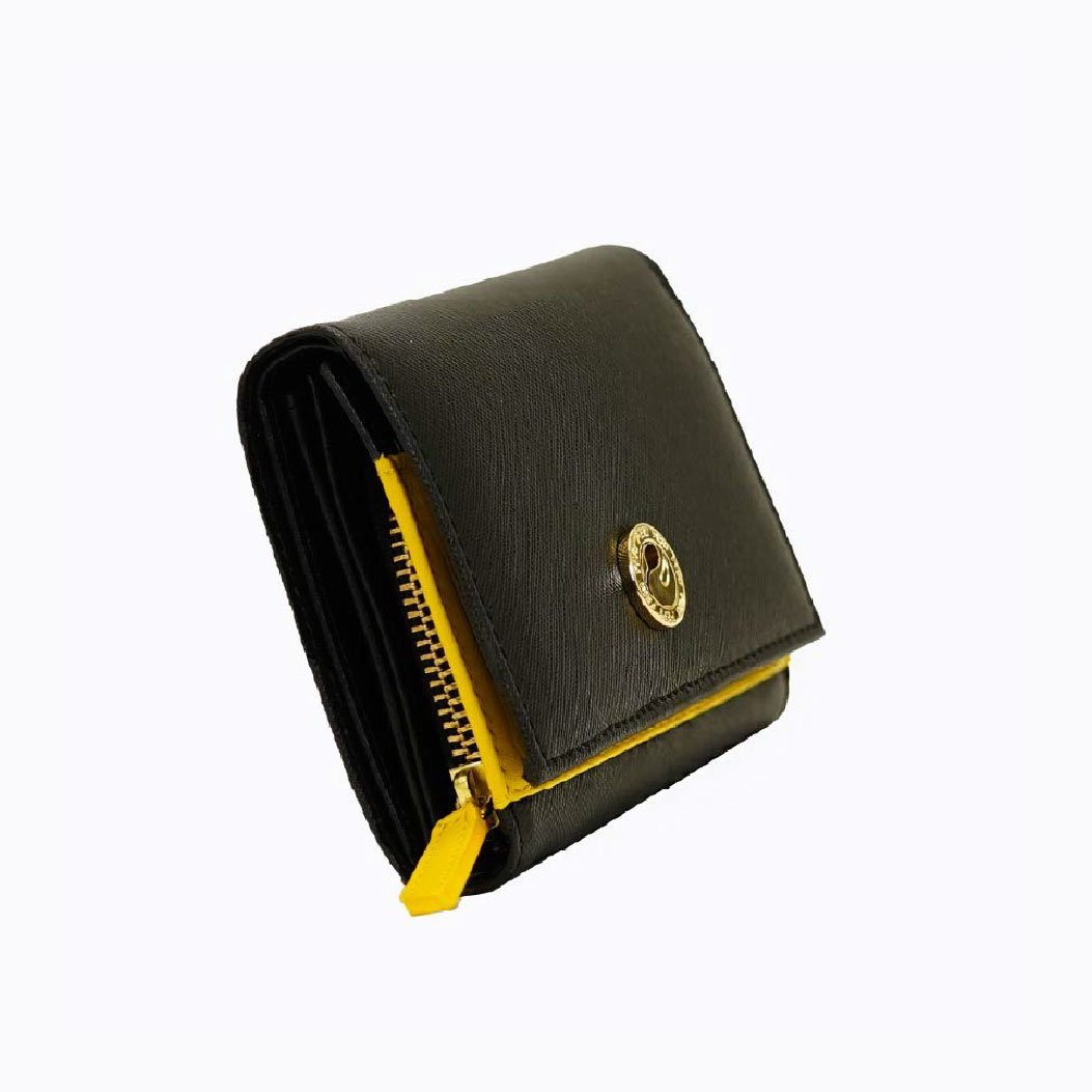 This stylish wallet combines elegance with practicality, featuring a sleek black textured leather exterior that exudes sophistication. The wallet is adorned with a chic gold-tone FERI logo snap closure, offering both security and a touch of luxury. Inside, it boasts multiple compartments for cards, cash, and coins, ensuring easy organization of your essentials. A vibrant yellow leather zipper puller and inside detail adds a playful contrast, enhancing its modern appeal. Compact yet functional, this wallet is perfect for everyday use, making it a versatile accessory that complements any outfit while keeping your belongings neatly arranged.
