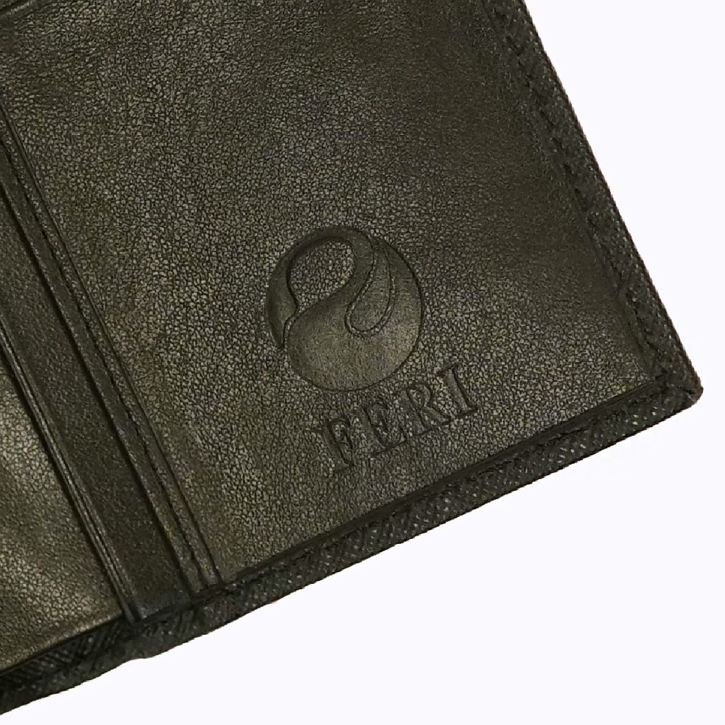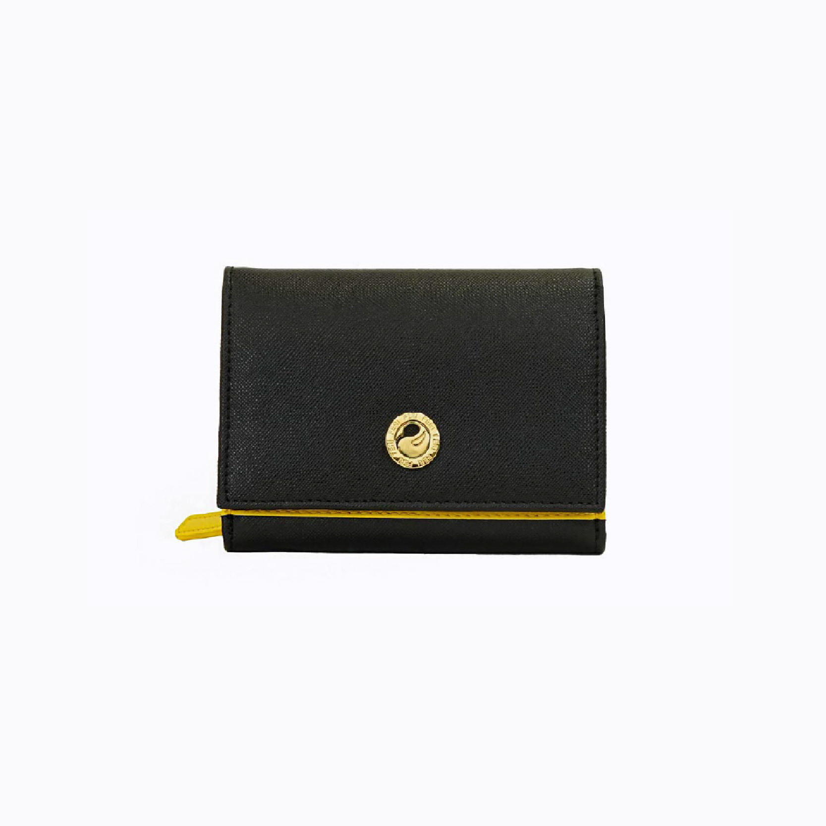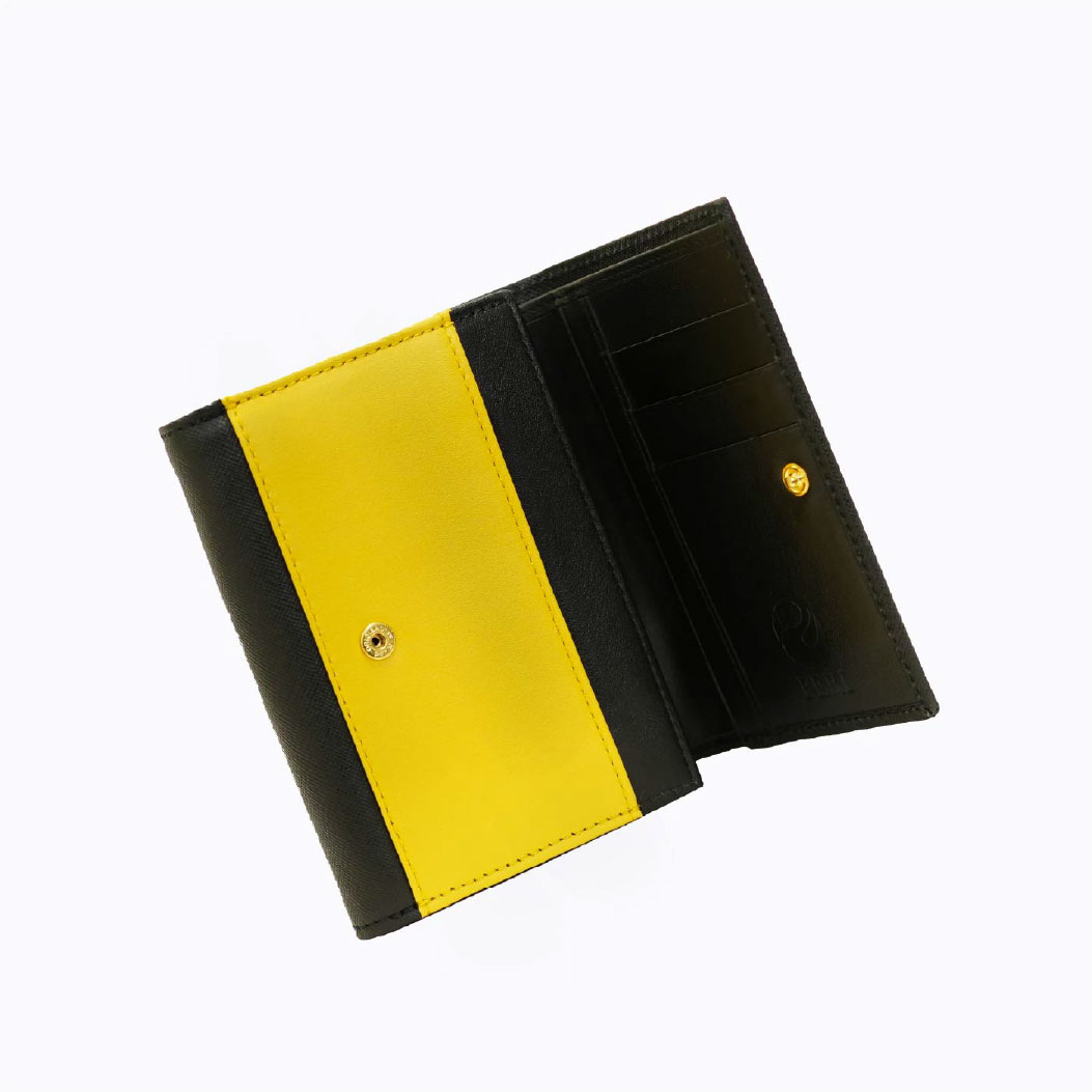 This stylish wallet combines elegance with practicality, featuring a sleek black textured leather exterior that exudes sophistication. The wallet is adorned with a chic gold-tone FERI logo snap closure, offering both security and a touch of luxury. Inside, it boasts multiple compartments for cards, cash, and coins, ensuring easy organization of your essentials. A vibrant yellow leather zipper puller and inside detail adds a playful contrast, enhancing its modern appeal. Compact yet functional, this wallet is perfect for everyday use, making it a versatile accessory that complements any outfit while keeping your belongings neatly arranged.