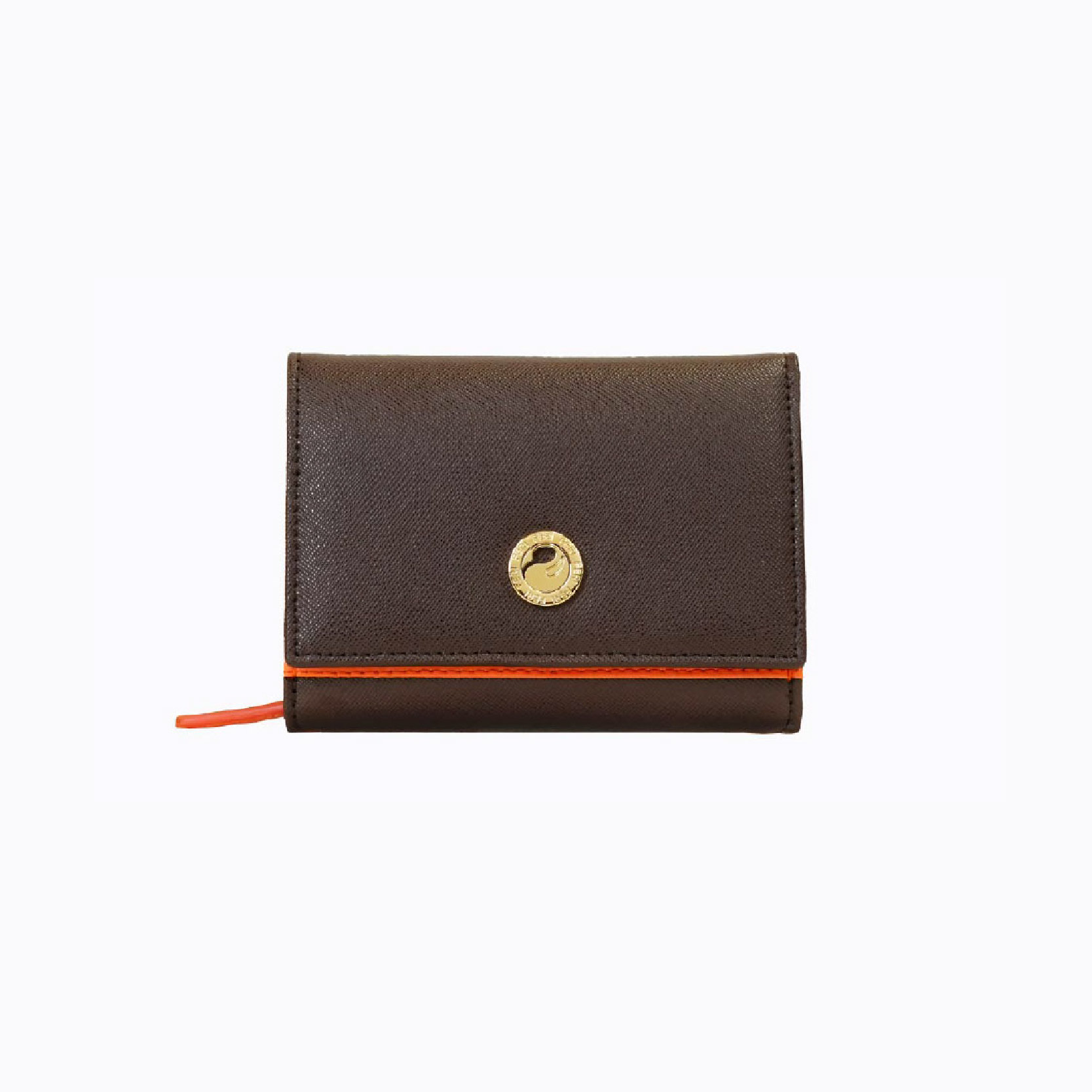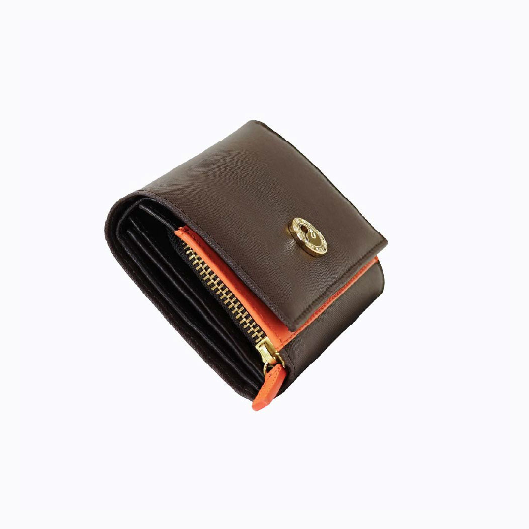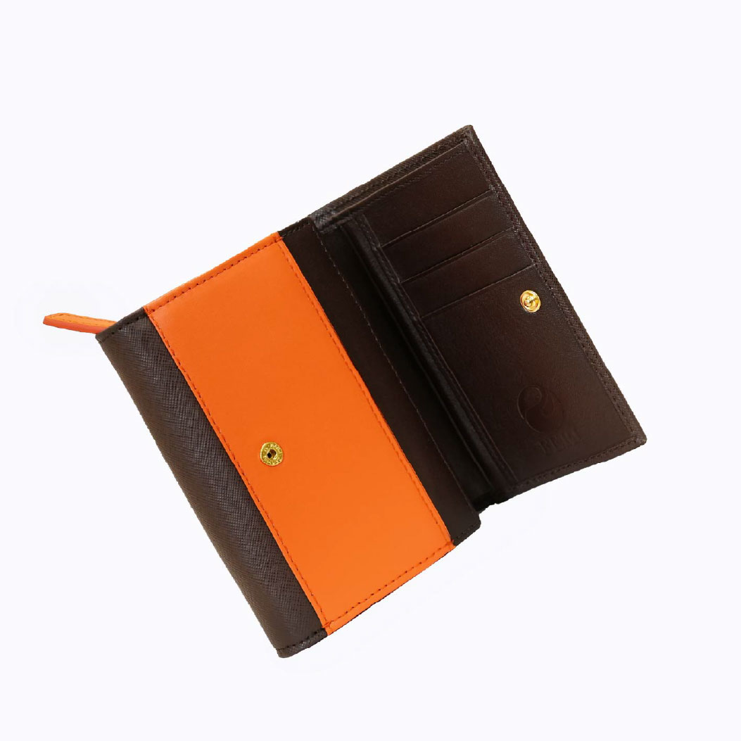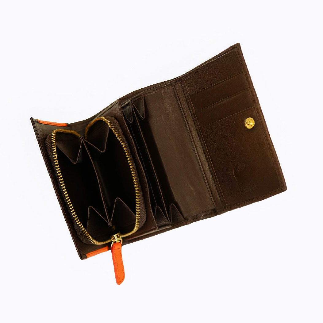 This stylish wallet combines elegance with practicality, featuring a sleek cognac textured leather exterior that exudes sophistication. The wallet is adorned with a chic gold-tone FERI logo snap closure, offering both security and a touch of luxury. Inside, it boasts multiple compartments for cards, cash, and coins, ensuring easy organization of your essentials. An orange leather zipper puller and inside detail adds a playful contrast, enhancing its modern appeal. Compact yet functional, this wallet is perfect for everyday use, making it a versatile accessory that complements any outfit while keeping your belongings neatly arranged.