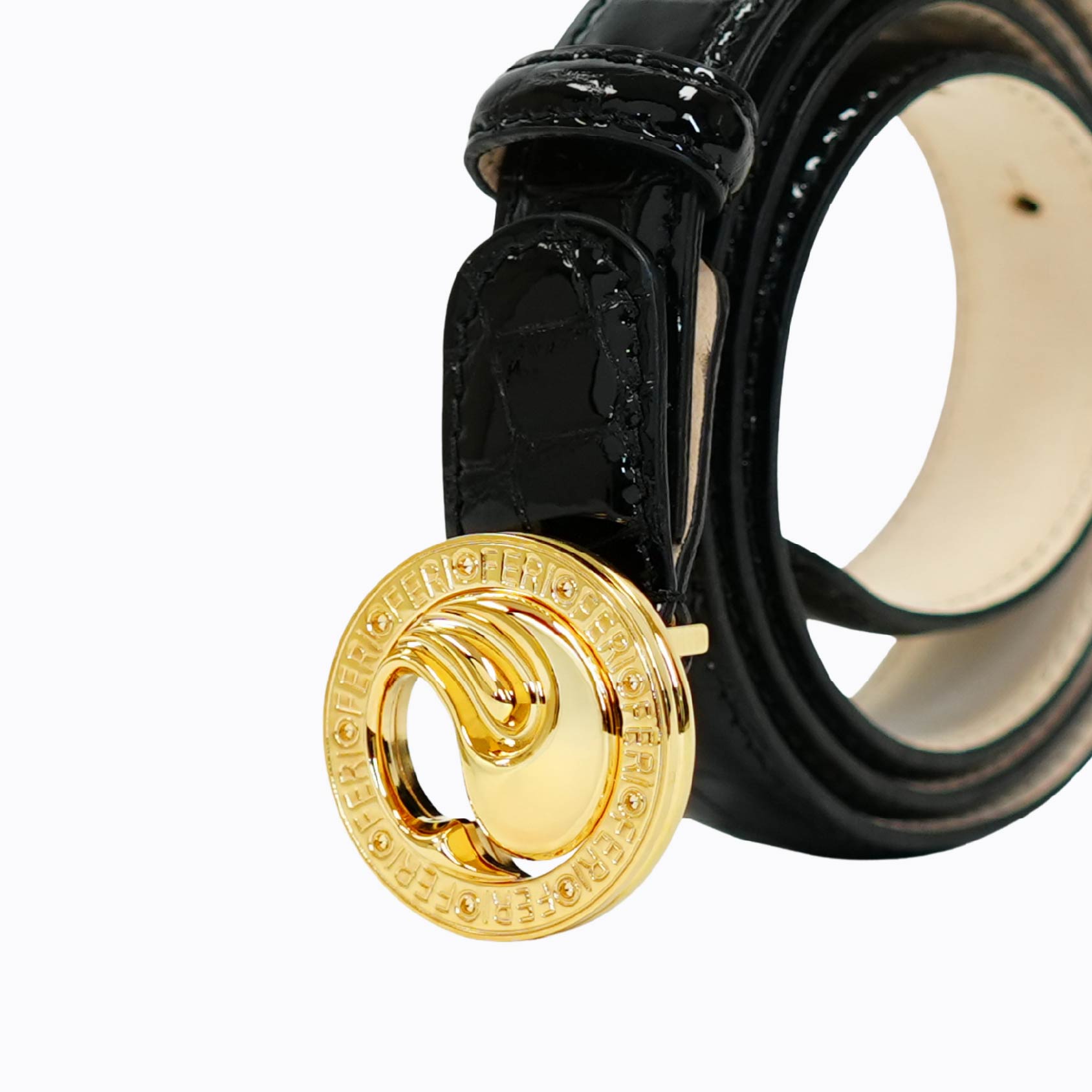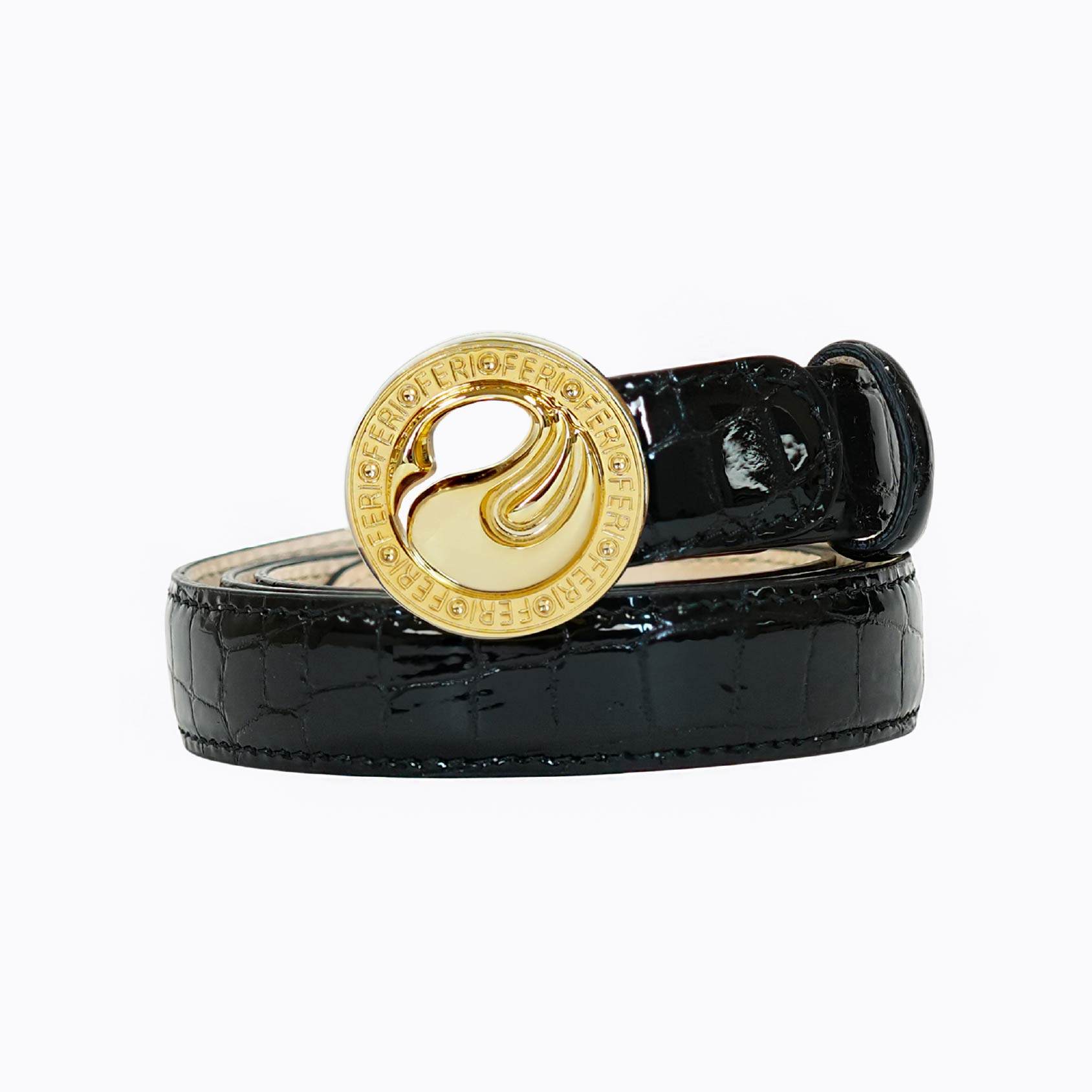 Refined elegance meets signature luxury in the FERI Croc-Embossed Leather Belt. Designed for fashion-forward individuals, this belt features a premium black leather strap with an embossed crocodile texture, offering a rich and sophisticated look. The centerpiece is a striking round buckle with a Gold-tone finish, polished gold at the center and gold-toned outer rim, engraved with the FERI insignia for a high-end designer touch. Whether paired with formal attire for upscale casualwear, this belt adds instant sophistication.