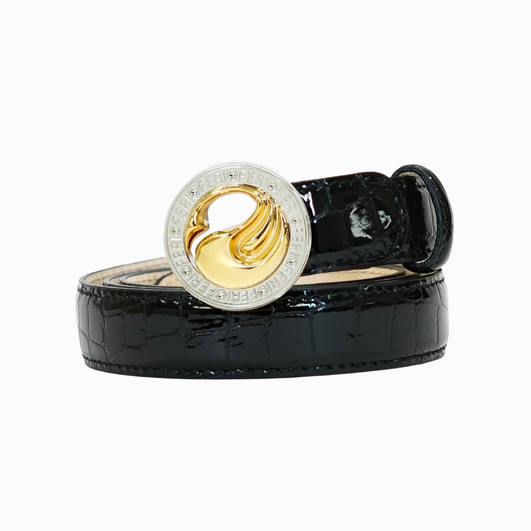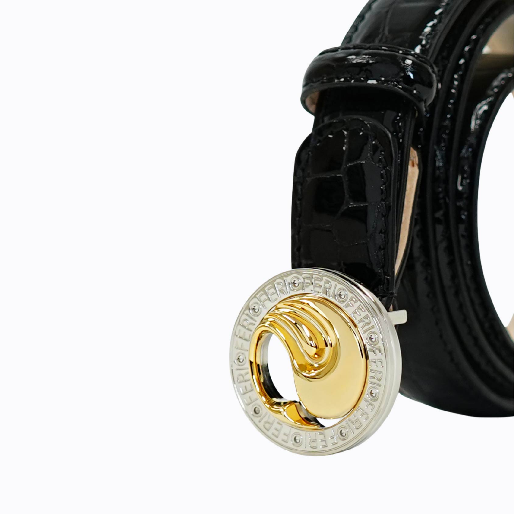 Refined elegance meets signature luxury in the FERI Croc-Embossed Leather Belt. Designed for fashion-forward individuals, this belt features a premium black leather strap with an embossed crocodile texture, offering a rich and sophisticated look. The centerpiece is a striking round buckle with a dual-tone finish, polished gold at the center and silver-toned outer rim, engraved with the FERI insignia for a high-end designer touch. Whether paired with formal attire for upscale casualwear, this belt adds instant sophistication.