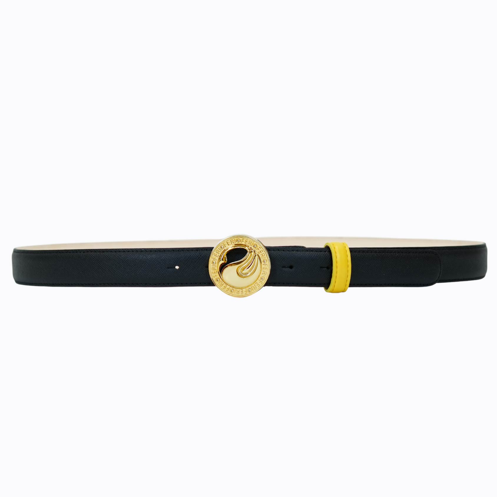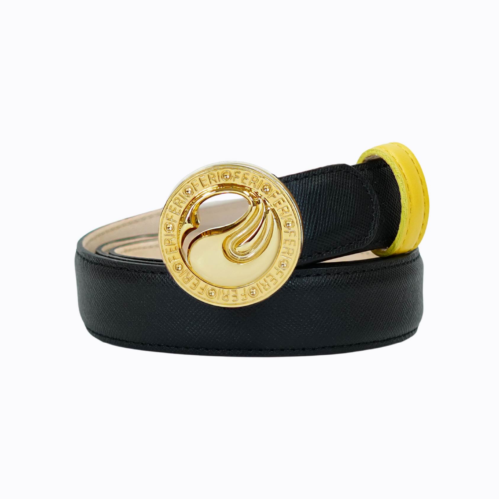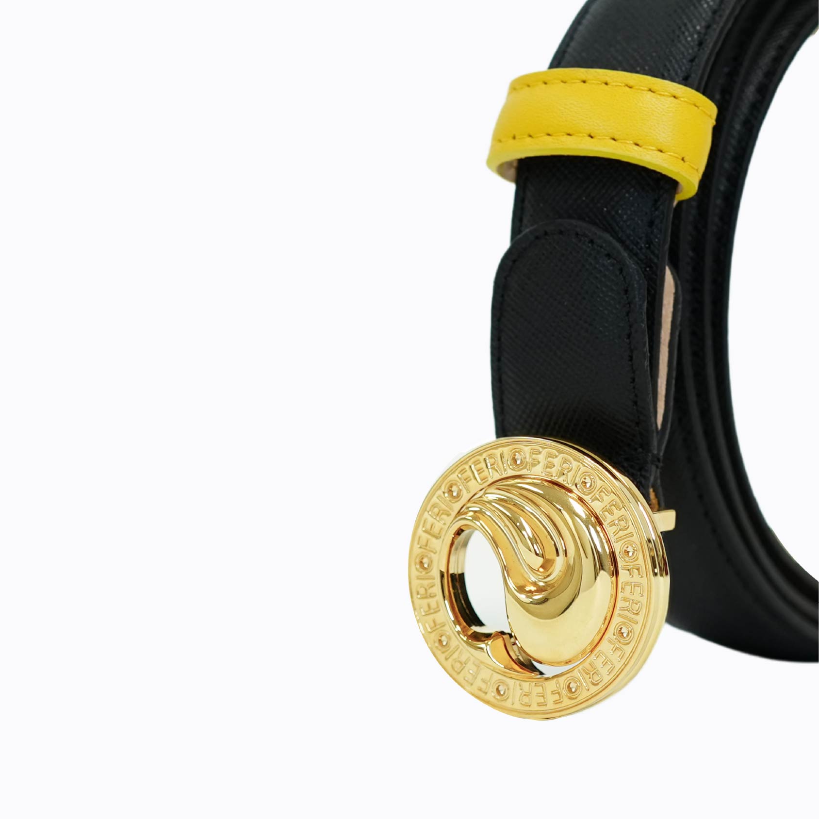 This stylish belt features a sleek black leather strap with a unique textured finish, adding a modern touch to any outfit. The standout feature is the bold, circular buckle, crafted from gold tone metal, which showcases intricate Logo engravings that enhance its luxurious appeal. The combination of materials and colors creates a striking contrast, making this belt a statement accessory. Versatile enough for both casual and formal wear, it effortlessly complements jeans, dresses, or tailored trousers, adding a touch of sophistication to your ensemble. Perfect for those who appreciate quality and design.