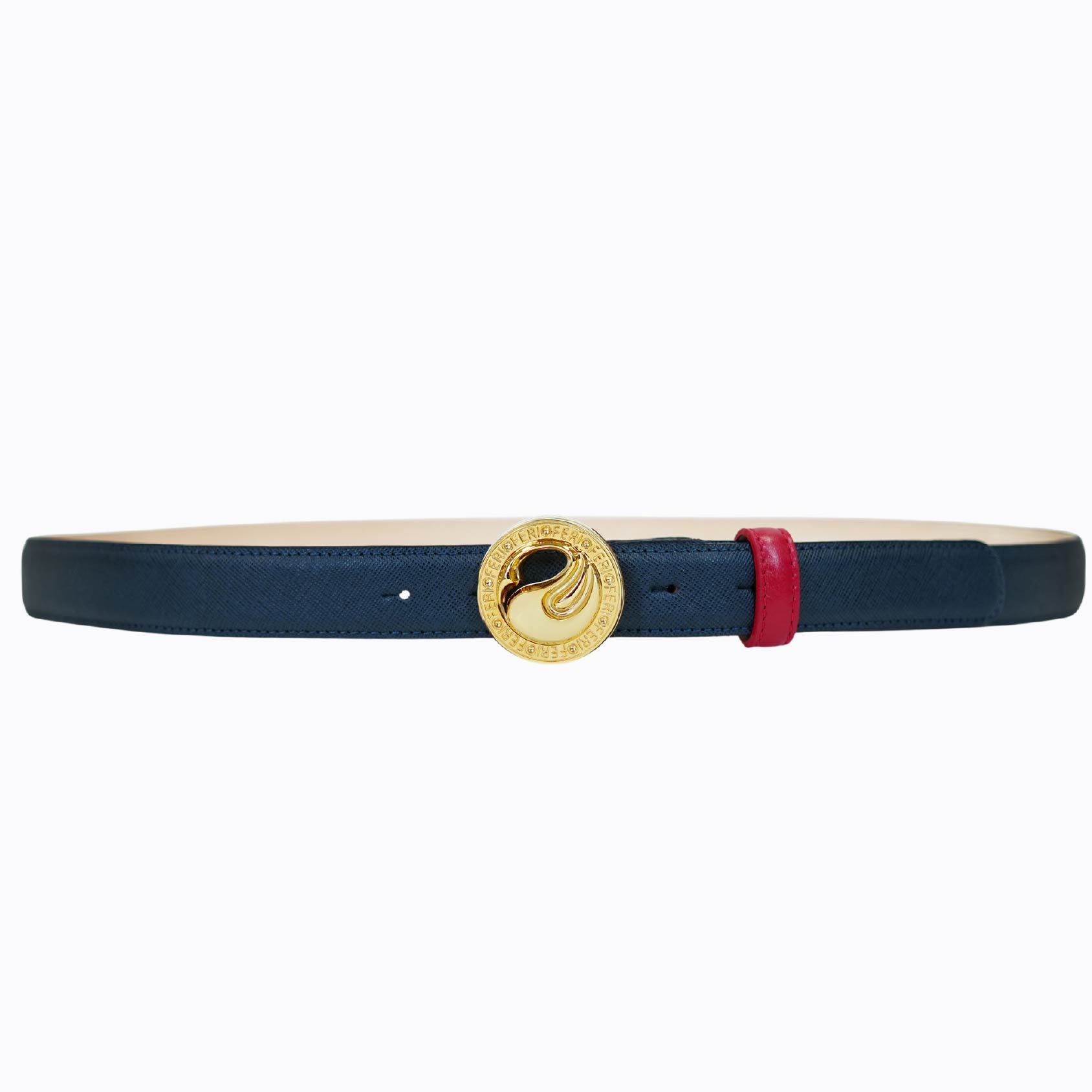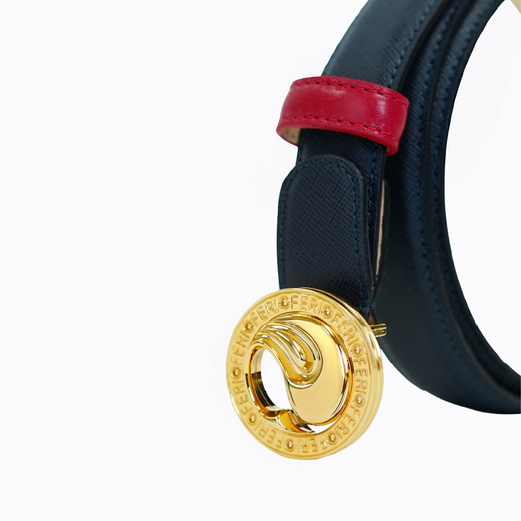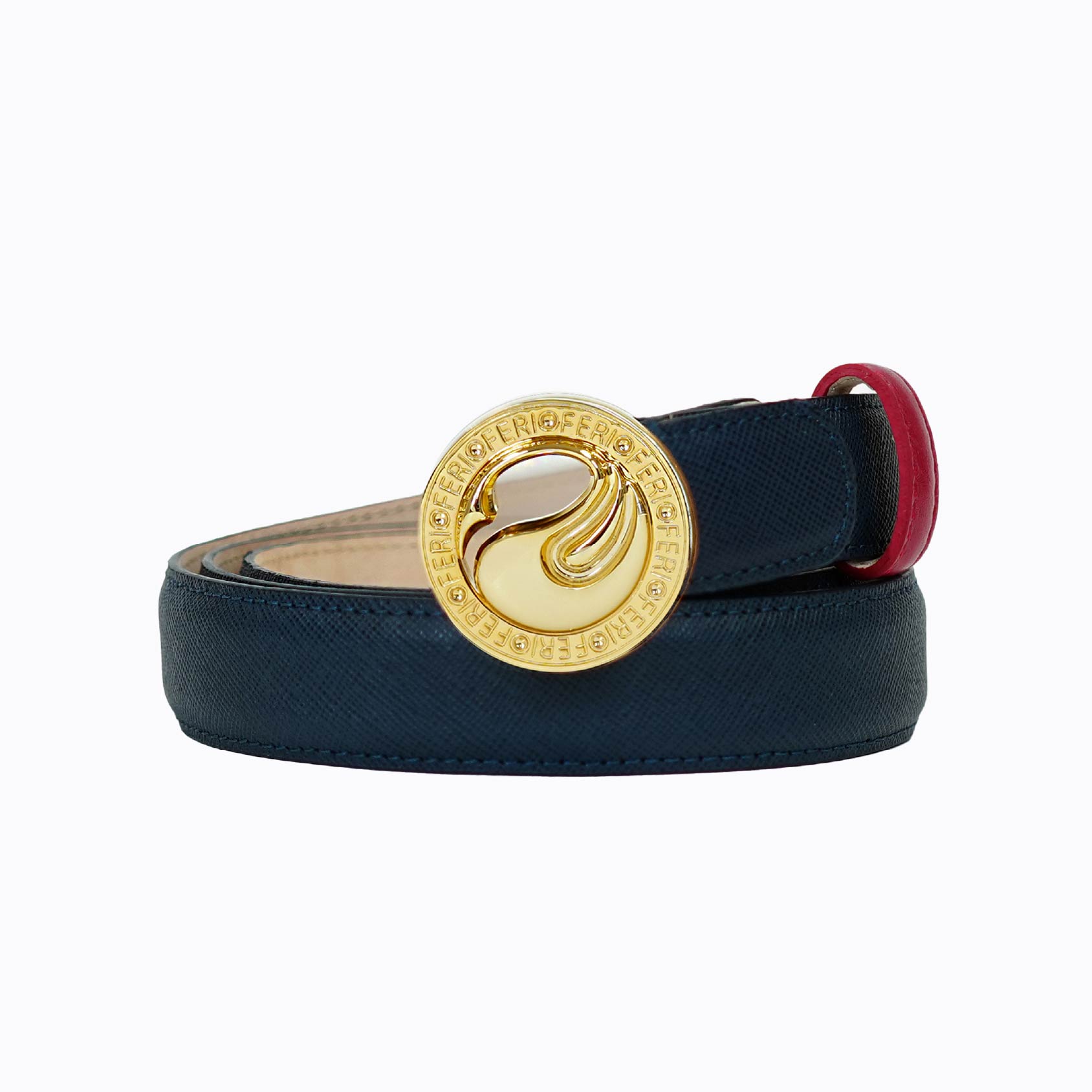 This stylish belt features a sleek blue leather strap with a unique textured finish, adding a modern touch to any outfit. The standout feature is the bold, circular buckle, crafted from gold tone metal, which showcases intricate Logo engravings that enhance its luxurious appeal. The combination of materials and colors creates a striking contrast, making this belt a statement accessory. Versatile enough for both casual and formal wear, it effortlessly complements jeans, dresses, or tailored trousers, adding a touch of sophistication to your ensemble. Perfect for those who appreciate quality and design.