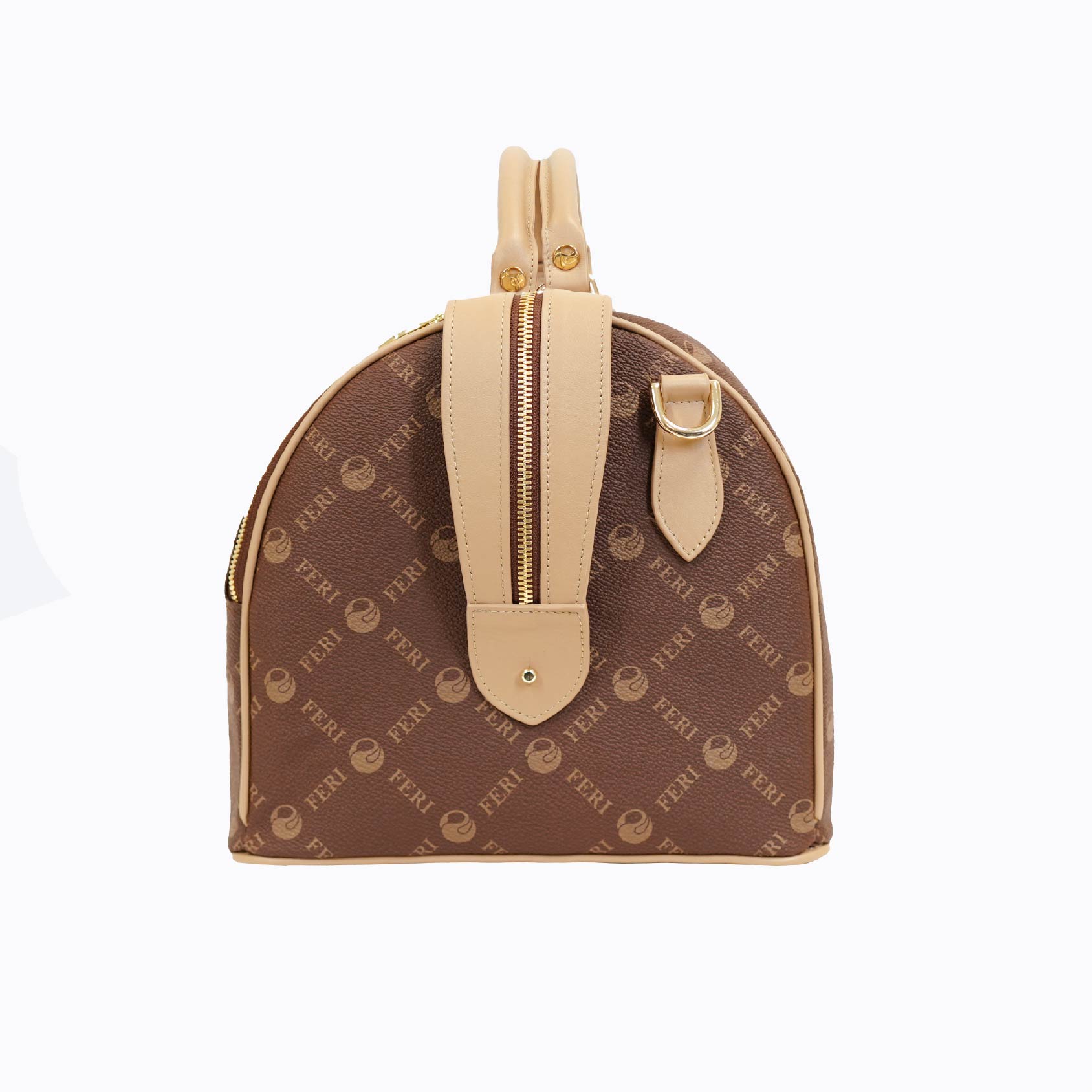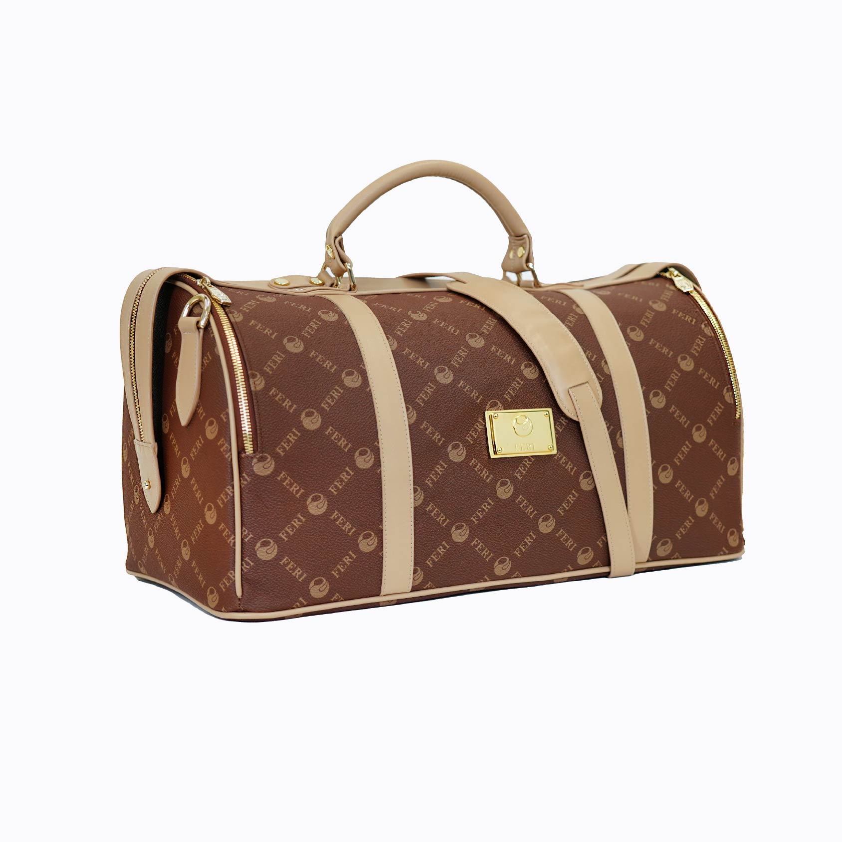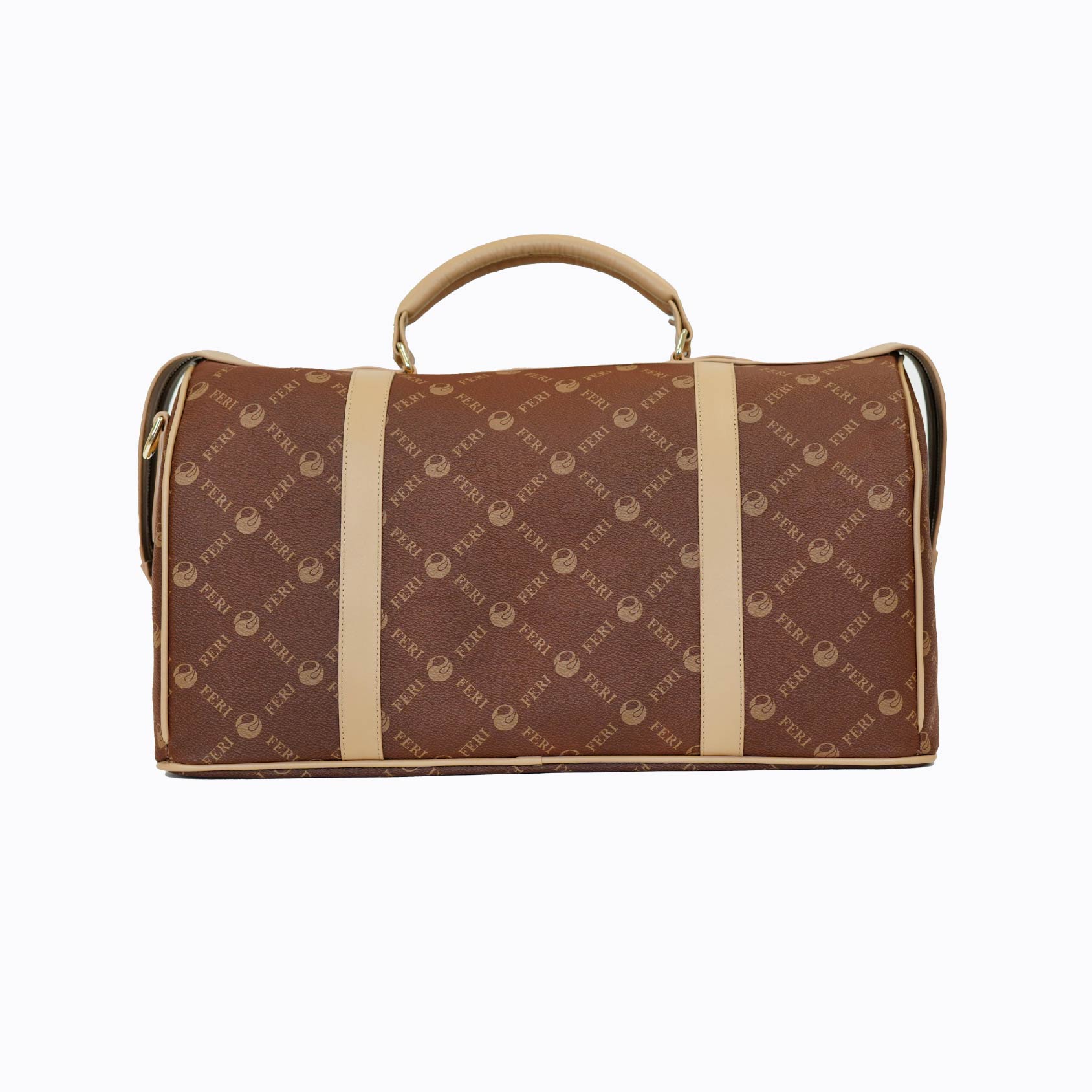 Travel in style with the FERI Signature Monogram Duffle Bag, a perfect blend of elegance and function. Crafted from premium textured genuine vegetable leather, this sophisticated duffle features an all-over monogram print with the iconic FERI logo arranged in a diamond pattern. The soft beige body is complemented by taupe vertical trims and matching double handles for a chic and modern finish.