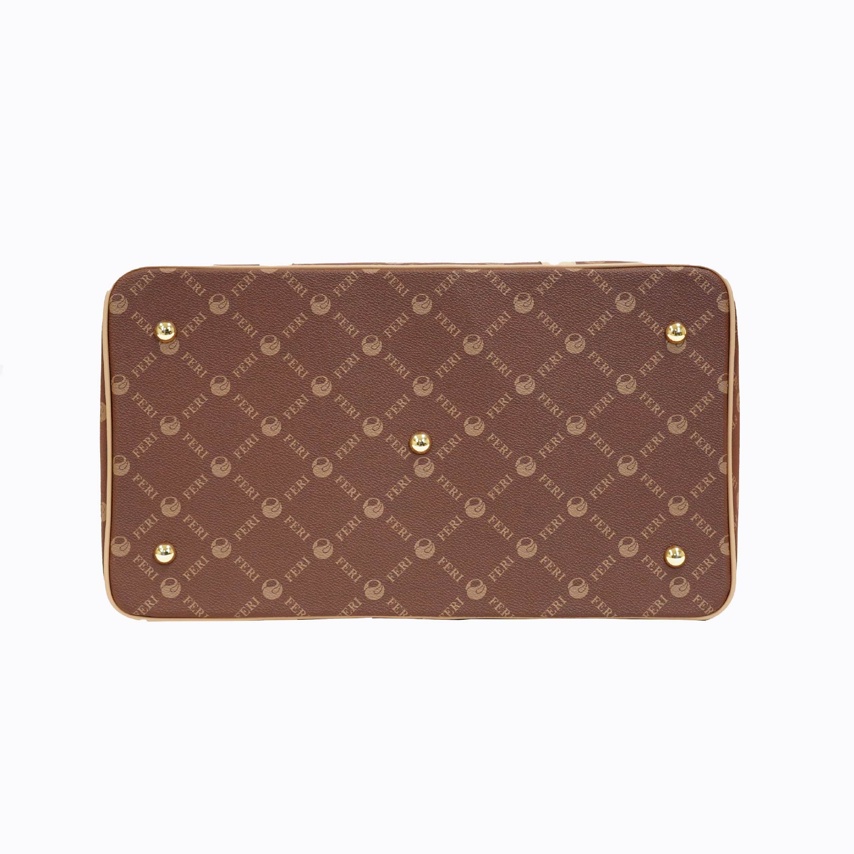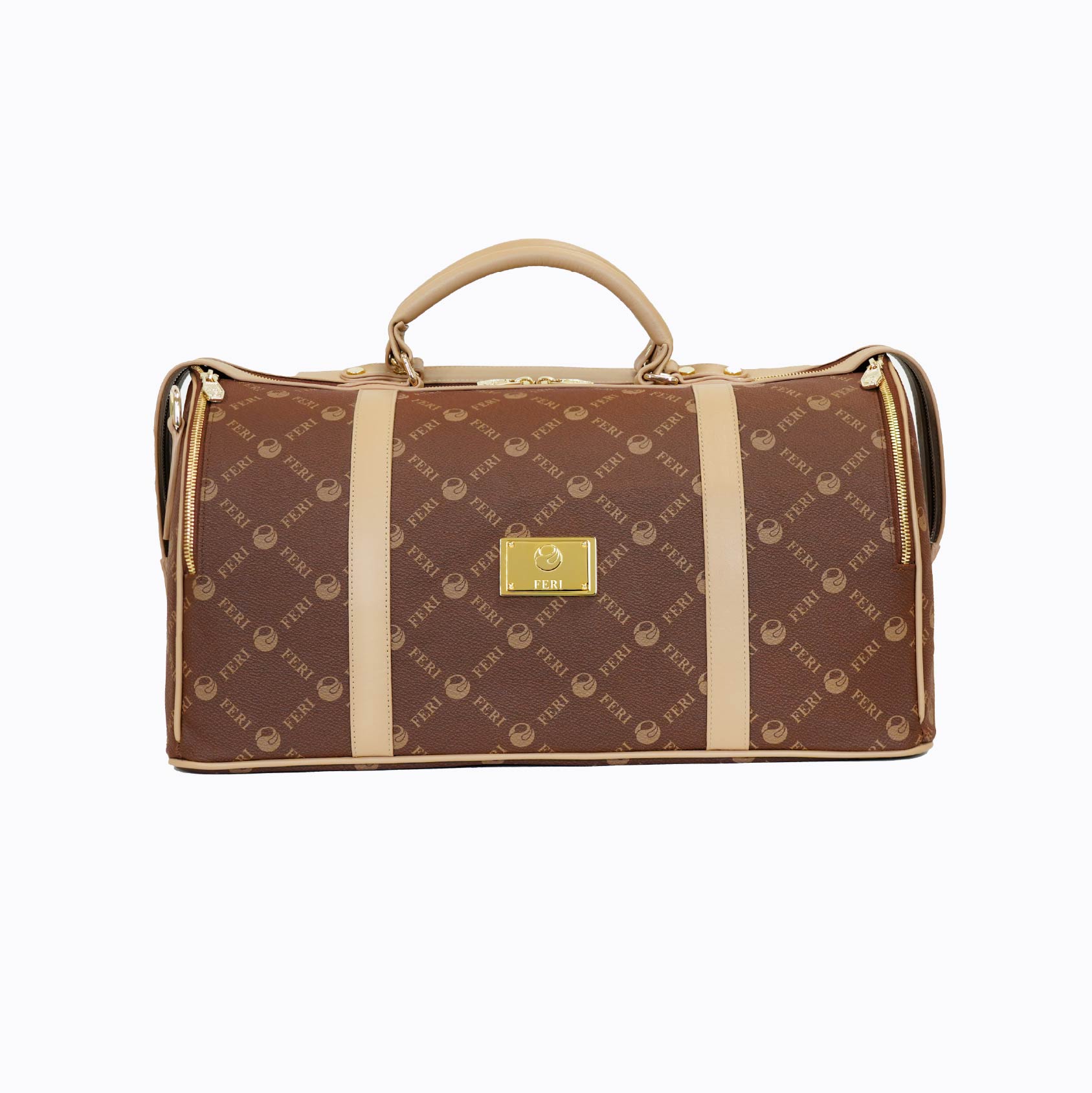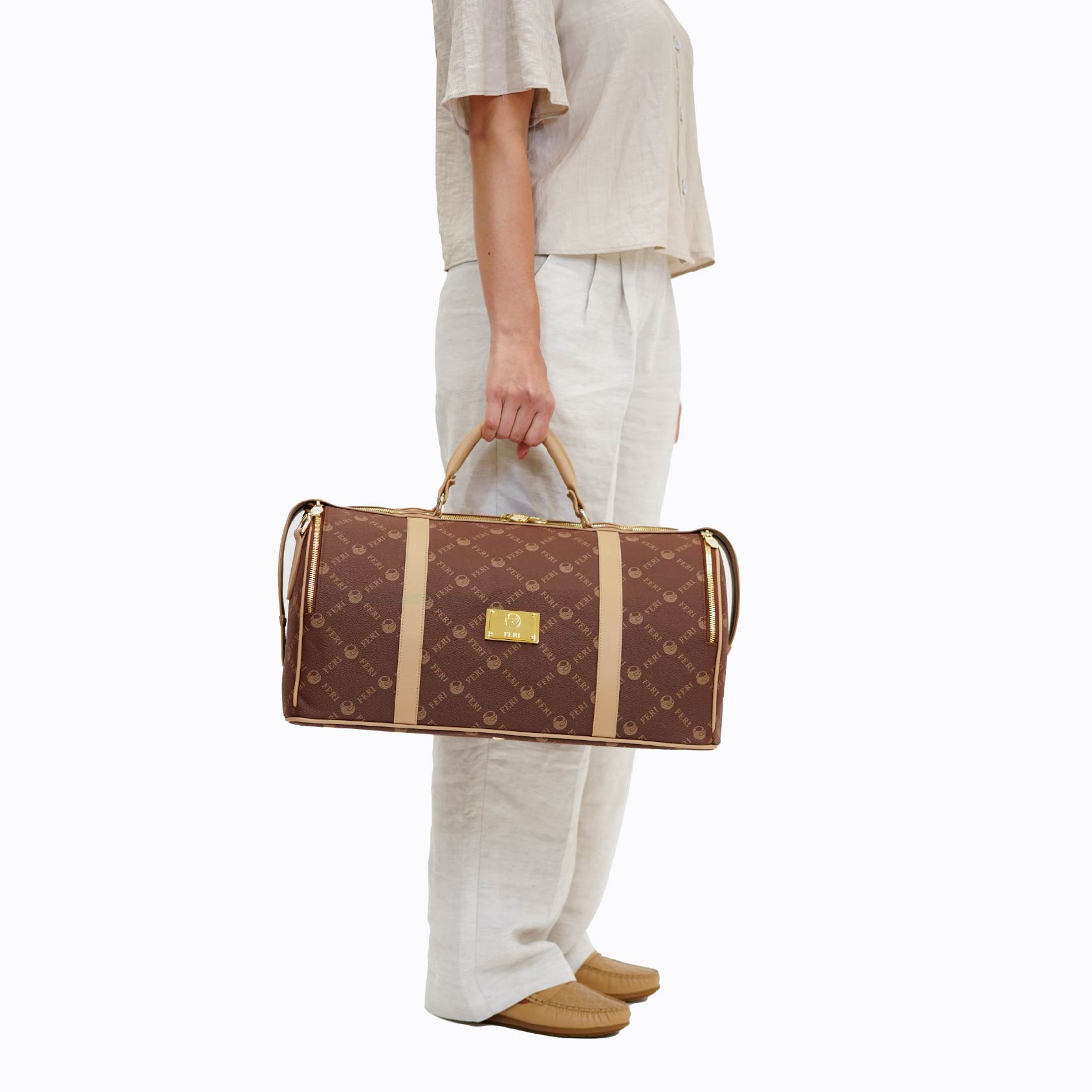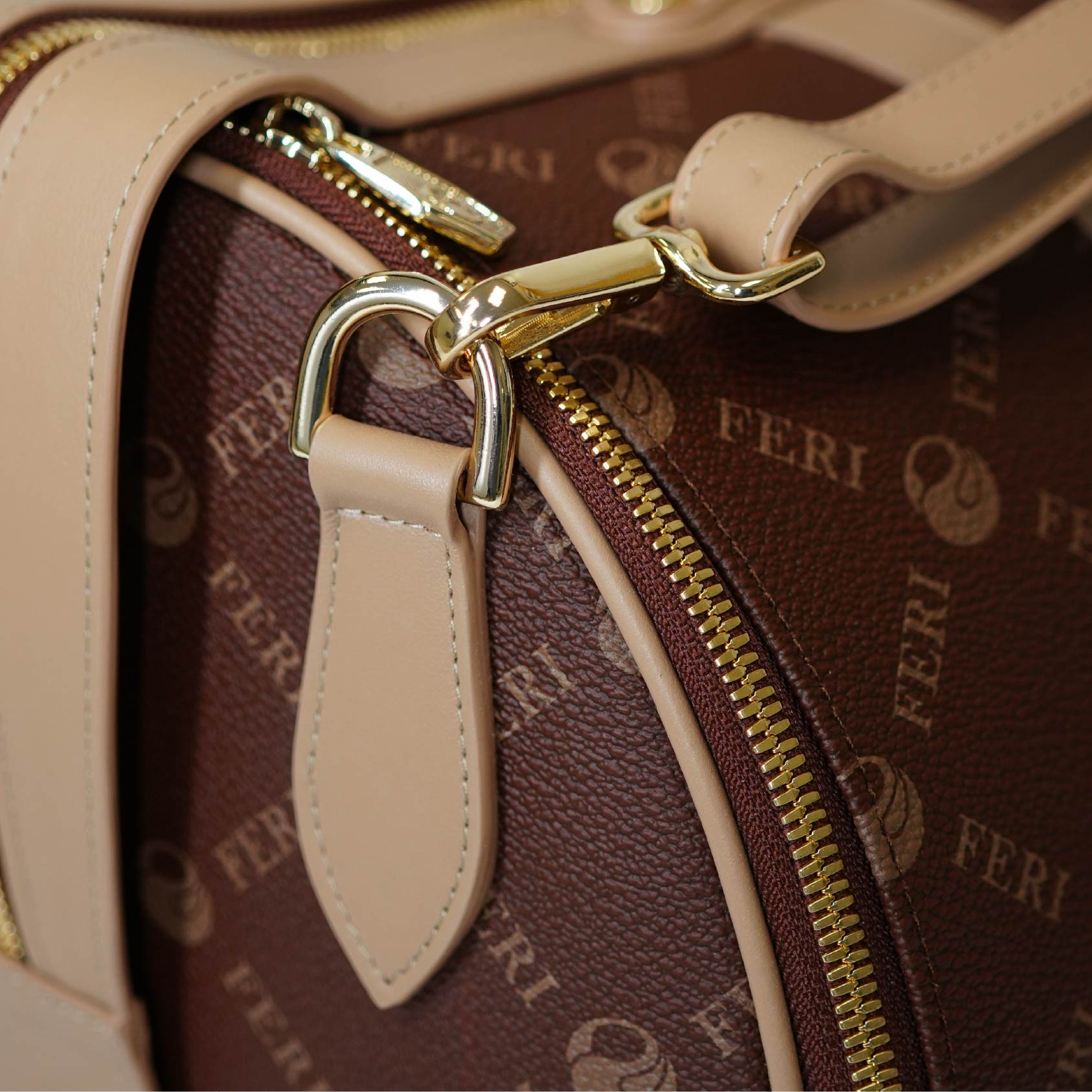 Travel in style with the FERI Signature Monogram Duffle Bag, a perfect blend of elegance and function. Crafted from premium textured genuine vegetable leather, this sophisticated duffle features an all-over monogram print with the iconic FERI logo arranged in a diamond pattern. The soft beige body is complemented by taupe vertical trims and matching double handles for a chic and modern finish.