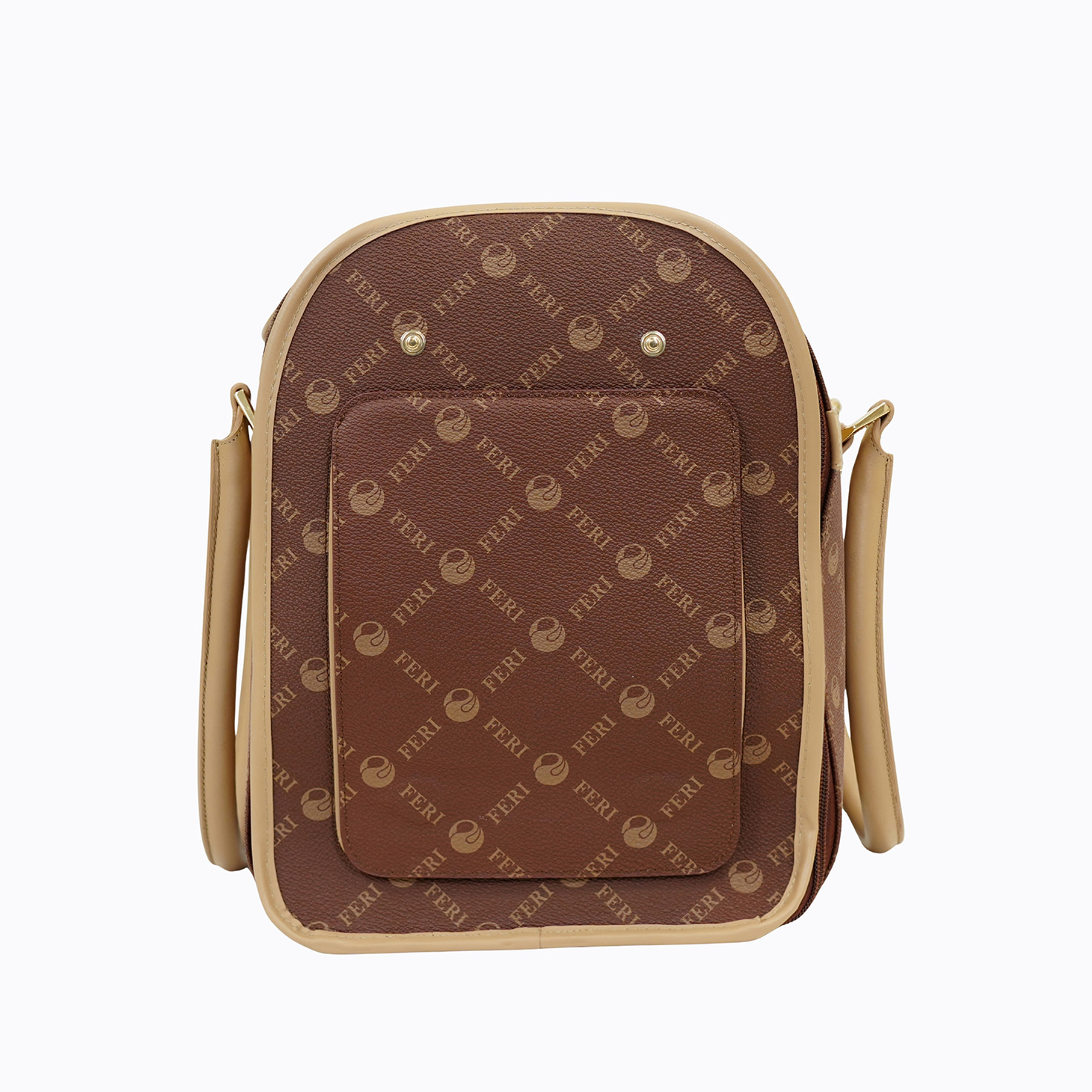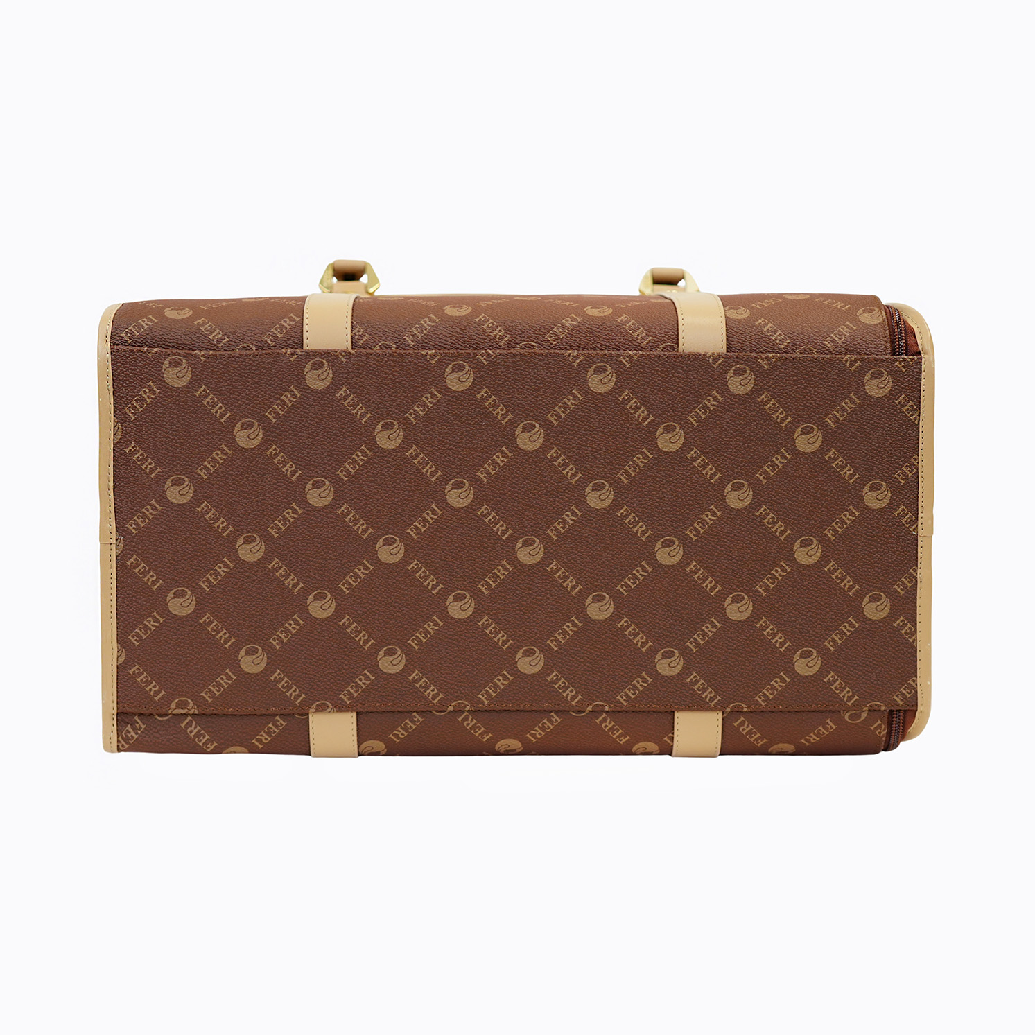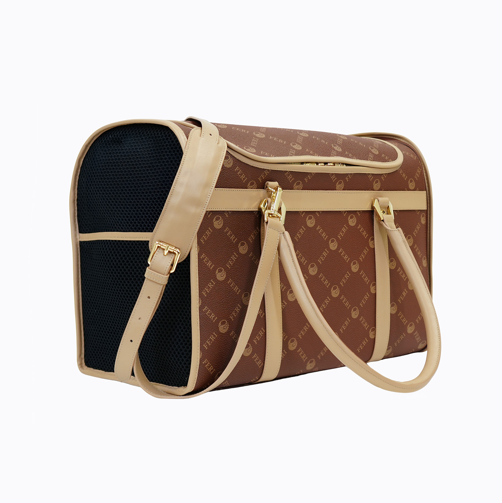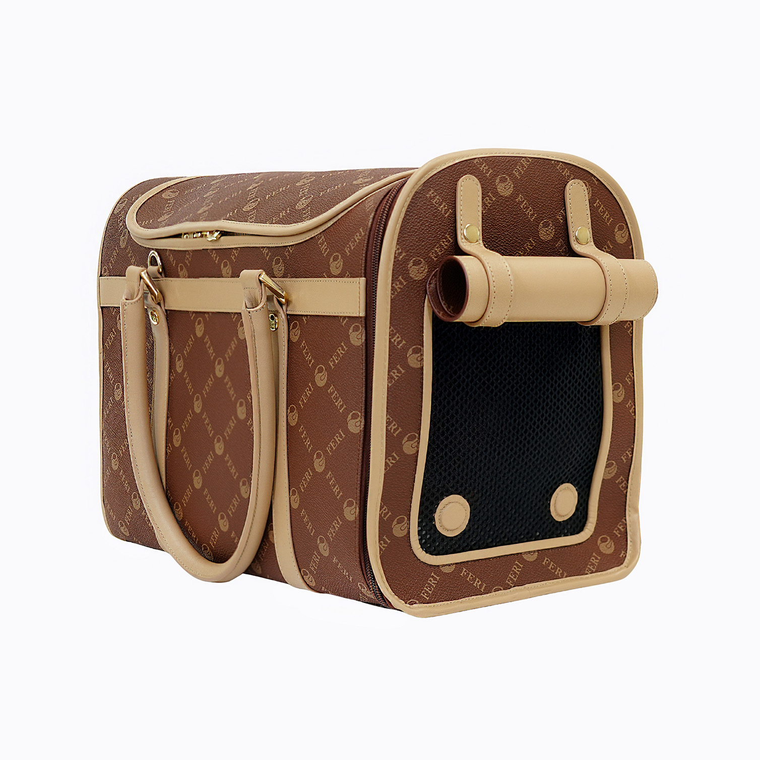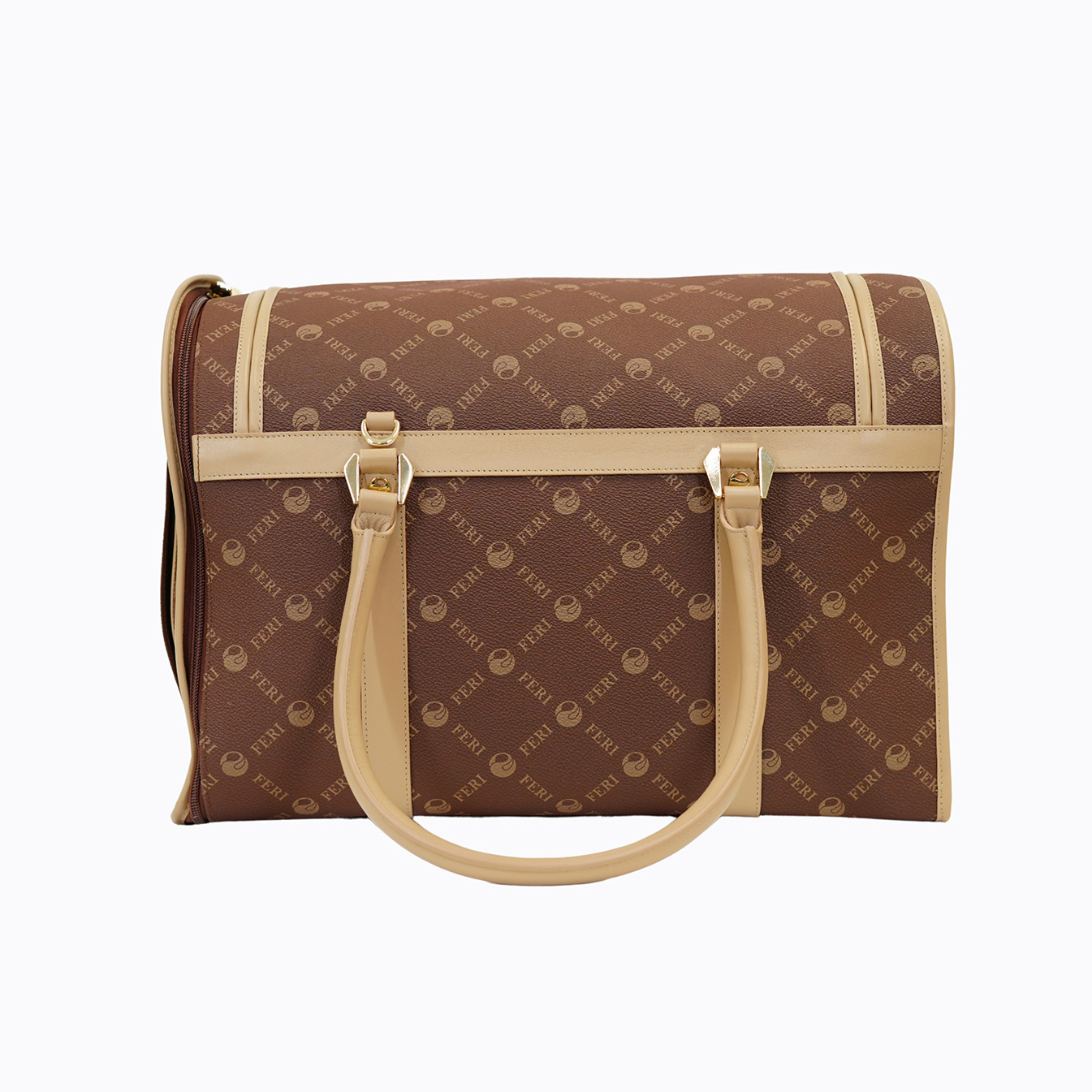 Give your furry friend a first-class travel experience with the FERI Luxury Monogram Pet Carrier. Designed with both fashion and function in mind, this premium pet bag is perfect for stylish pet owners on the go. The body is crafted from classic brown leather adorned with the signature FERI monogram, paired with contrasting beige leather trim and handles for a timeless two-tone look.