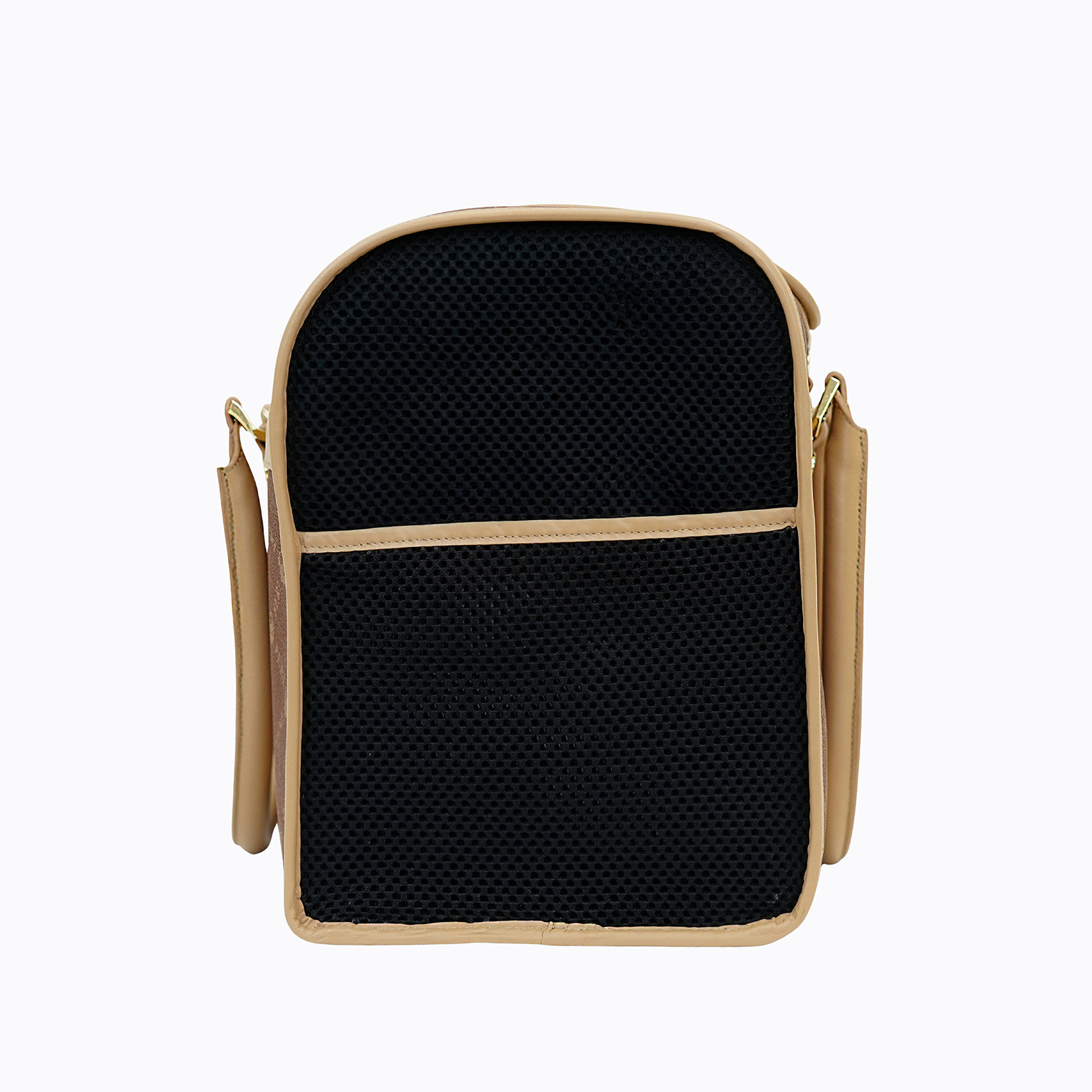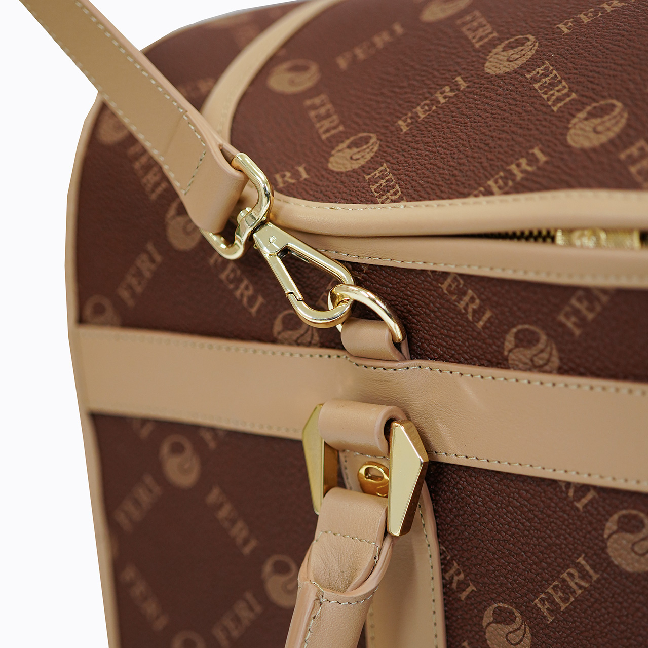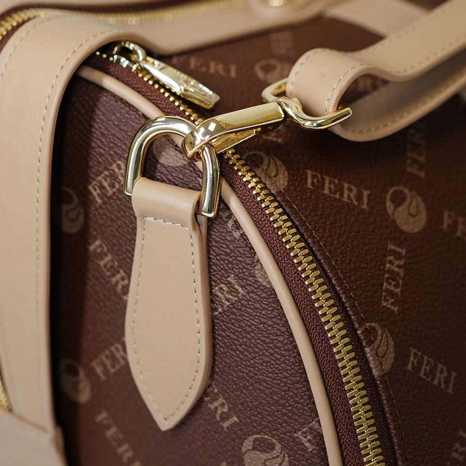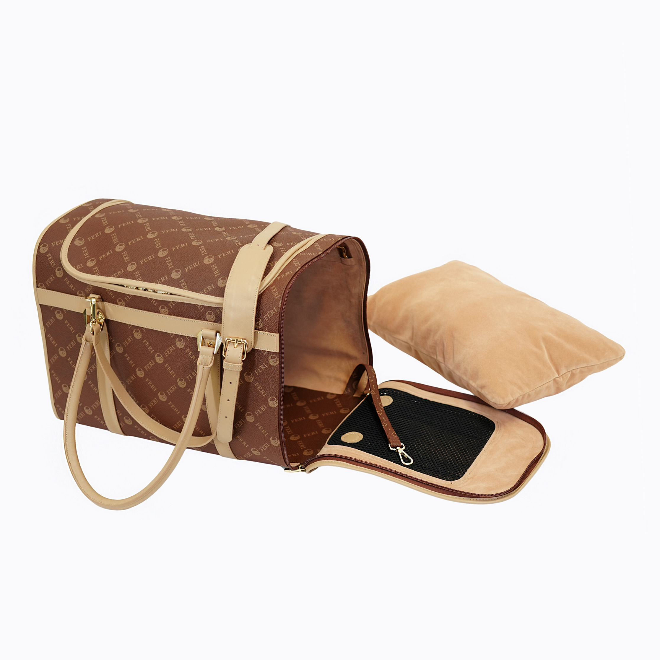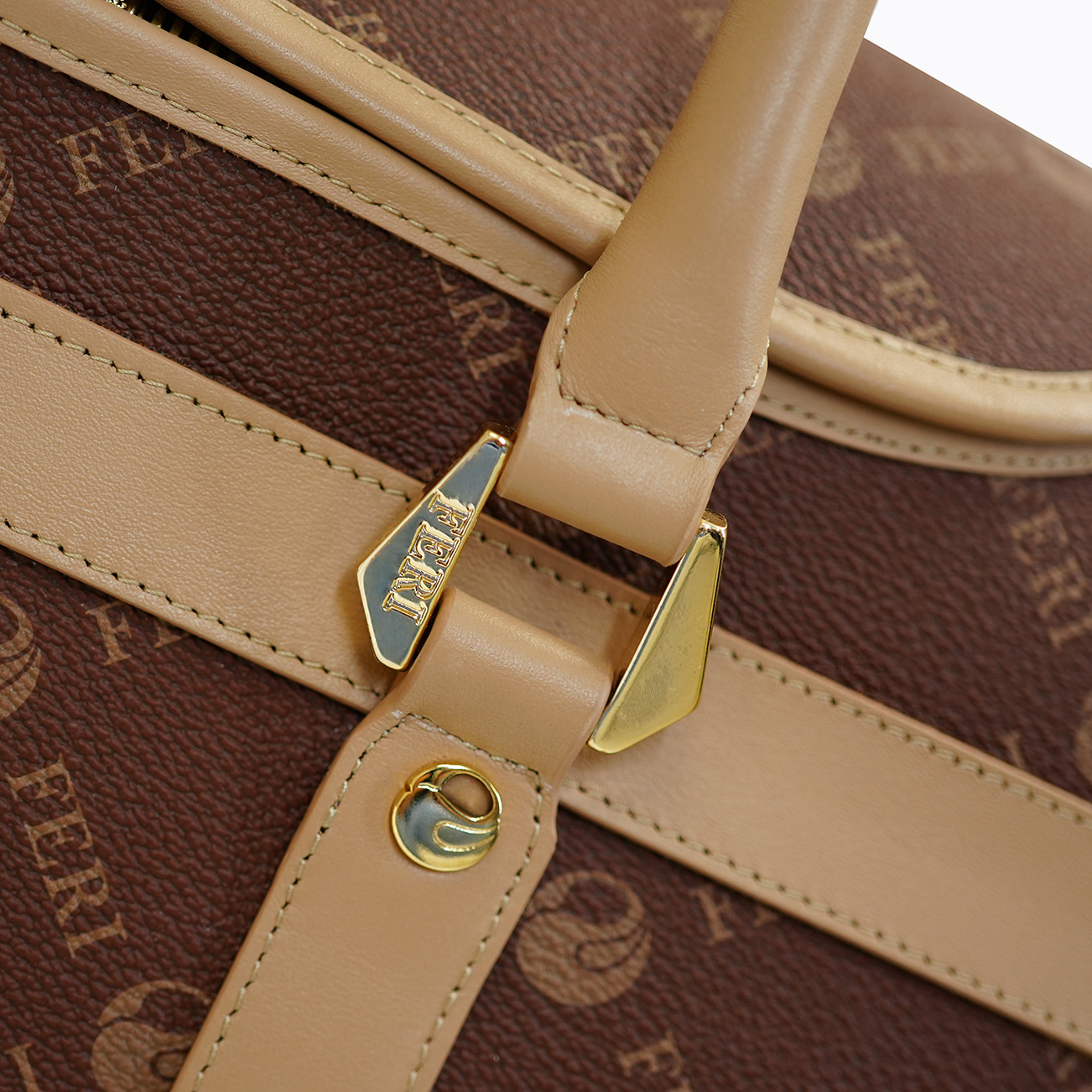 Give your furry friend a first-class travel experience with the FERI Luxury Monogram Pet Carrier. Designed with both fashion and function in mind, this premium pet bag is perfect for stylish pet owners on the go. The body is crafted from classic brown leather adorned with the signature FERI monogram, paired with contrasting beige leather trim and handles for a timeless two-tone look.