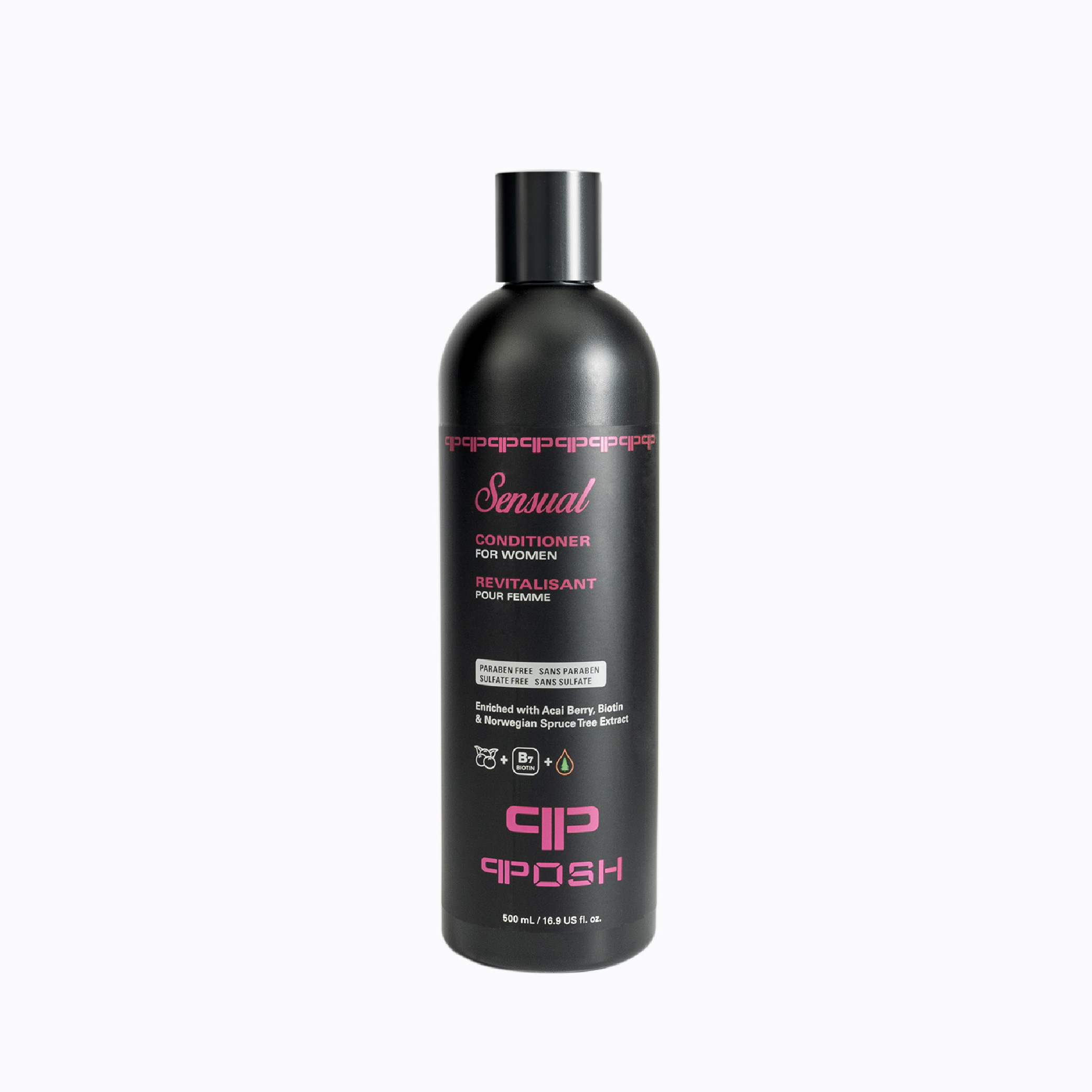 POSH Sensual Conditioner is infused with the Norwegian spruce tree extract in Fountain of Life, gently reduces flakes and improves scalp and hair health, leaving it feeling moisturized and luxurious. Acai berry promotes skin health with vitamins that promote blood circulation in the scalp. Biotin promotes hair growth, adding fullness while preventing breakage. Sensual strengthens and supports your hair for more shine and body without feeling greasy.
