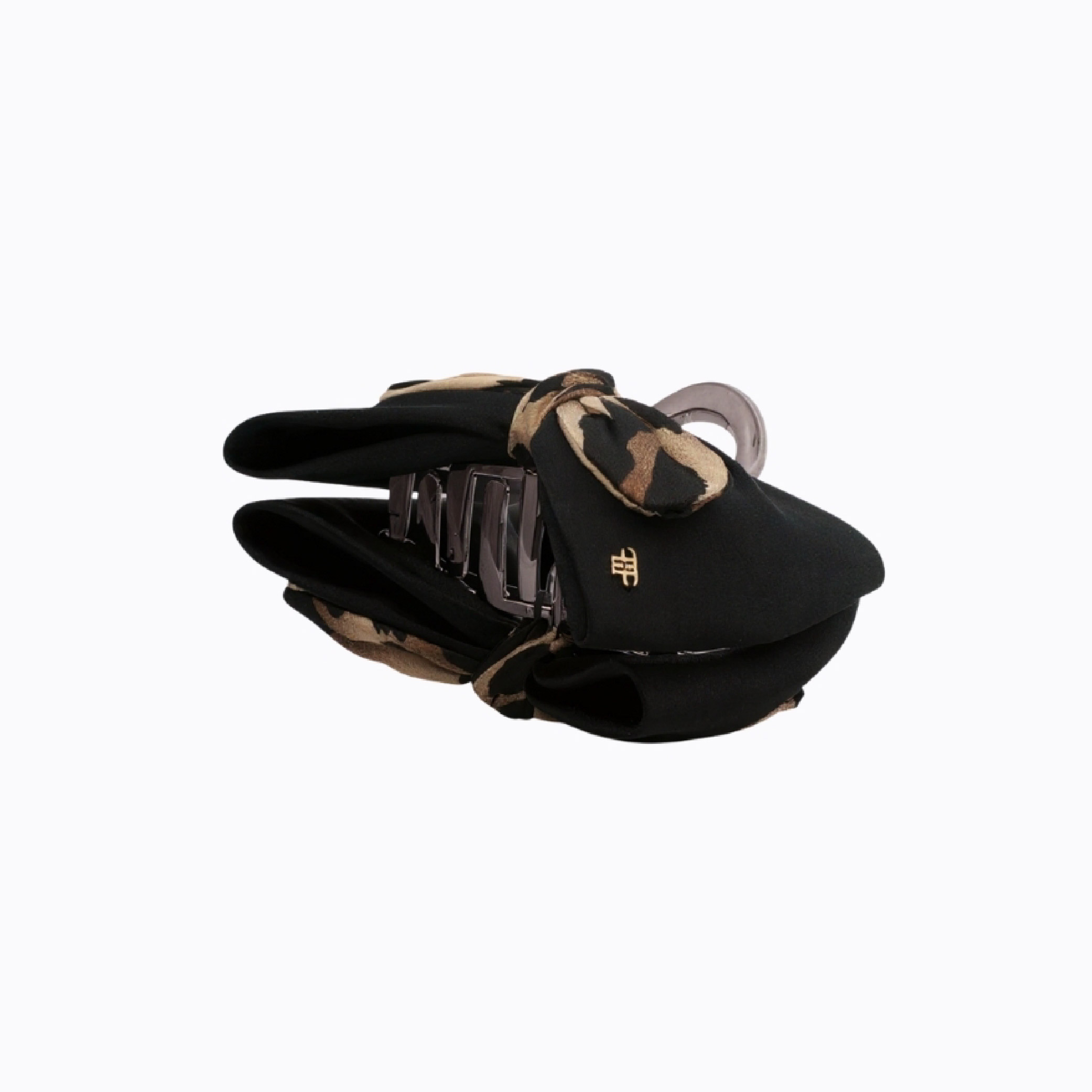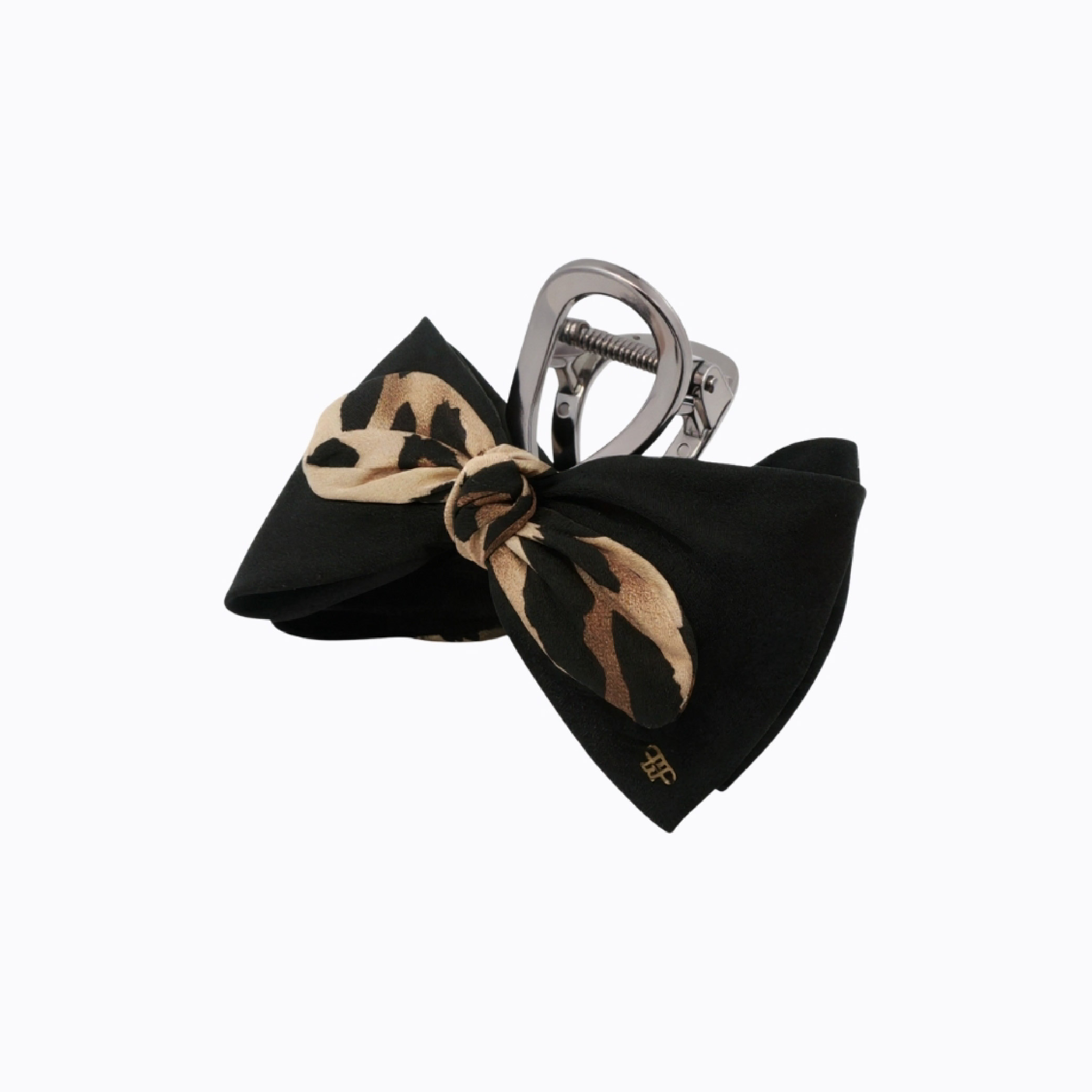 "- This charming hair clip features a playful bow design that combines sleek black fabric with a stylish cheetah print accent