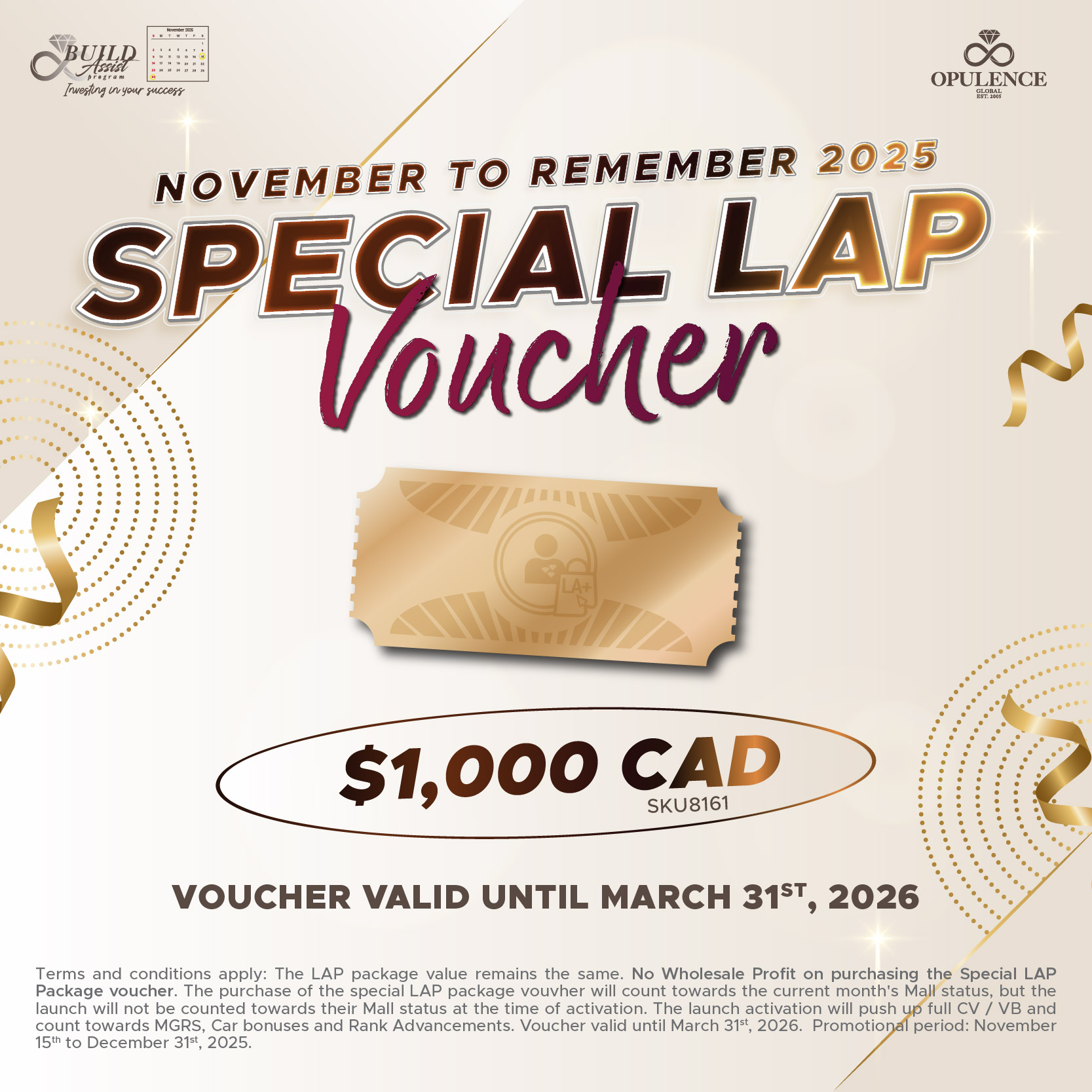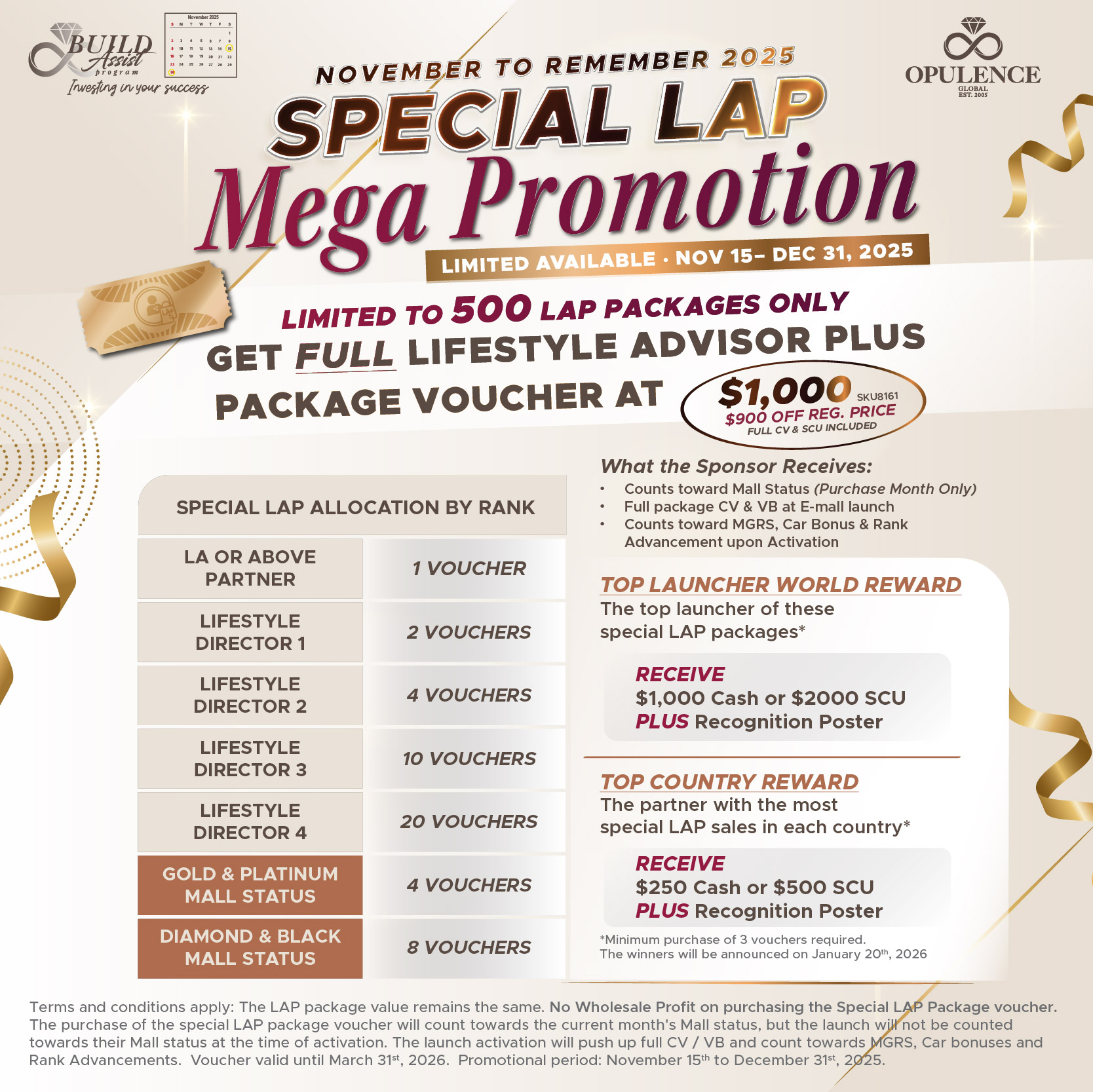 No Wholesale Profit on purchasing the Special LAP Package voucher. The purchase of the special LAP package voucher will count towards the current month’s Mall status, but the launch will not be counted towards their Mall status at the time of activation. The launch activation will push up full CV / VB and count towards MGRS, Car bonuses and Rank Advancements.