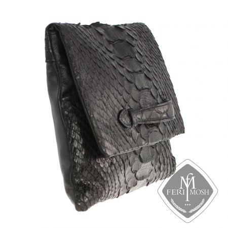 FERI MOSH- Black genuine python and nappa leather envelope clutch - Made with python skin and backed with nappa leather - Back zippered pocket - Magnetic button flap closure - Main compartment with zipper pouch - Secondary compartment with magnetic button closu...