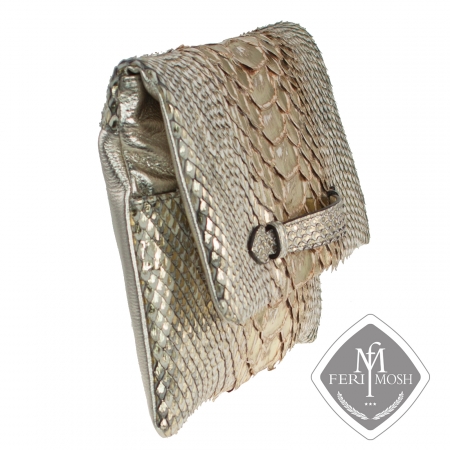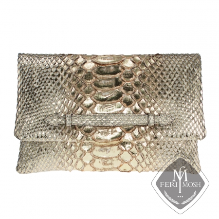 FERI MOSH- Gold metallic genuine python and nappa leather envelope clutch - Made with python skin and backed with nappa leather - Back zippered pocket - Magnetic button flap closure - Main compartment with zipper pouch - Secondary compartment with magnetic but...