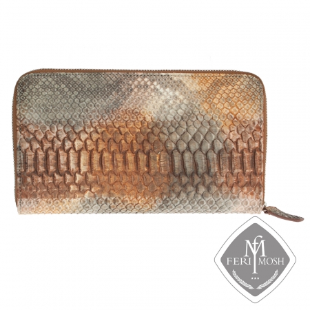 FERI MOSH- Caramel and grey genuine python leather zippered pocketbook - Exterior slit pocket with top stitching - Quality metal zipper closure - Interior lined with nappa leather - Accordion style opening - 2 zippered pockets - Space for 8 cards - Ample spac...