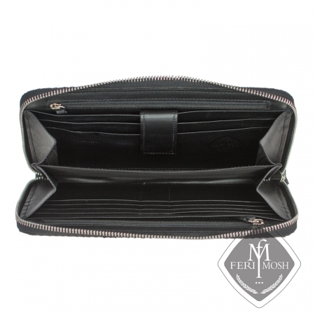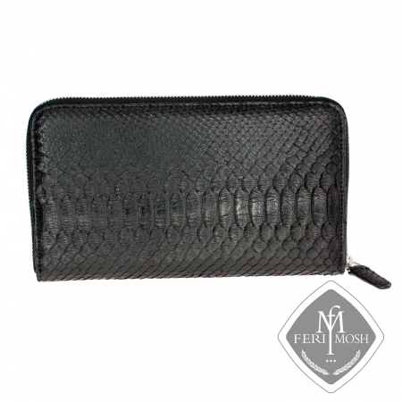 FERI MOSH- Black genuine python leather zippered pocketbook - Exterior slit pocket with top stitching - Quality metal zipper closure - Interior lined with nappa leather - Accordion style opening - 2 zippered pockets - Space for 8 cards - Ample space and slit...