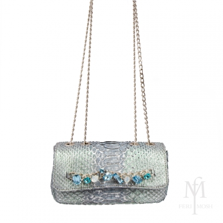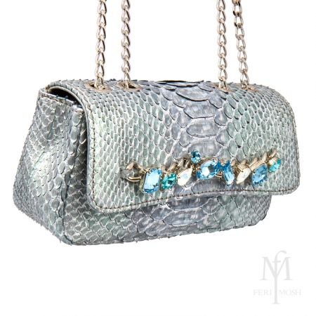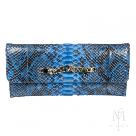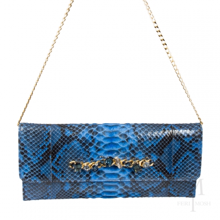 FERI MOSH- Ocean blue genuine python and nappa leather evening bag - Envelope clutch style bag - Made with python skin and backed with nappa leather - Embellished with gold toned chain and glass cut stones - Magnetic button flap closure - Gold toned chain shoul...