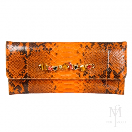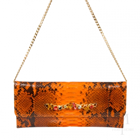 FERI MOSH- Orange genuine python and nappa leather evening bag - Envelope clutch style bag - Made with python skin and backed with nappa leather - Embellished with gold toned chain and glass cut stones - Magnetic button flap closure - Gold toned chain shoulder ...