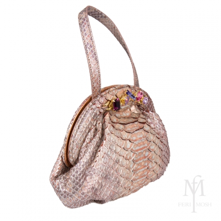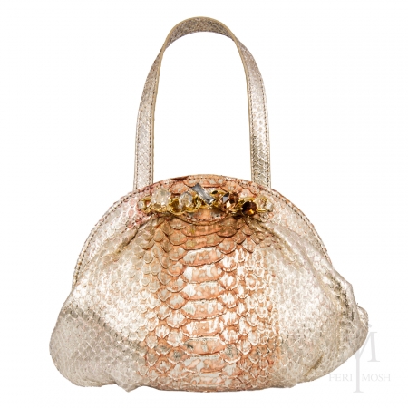 FERI MOSH- Salmon Metallic genuine python and nappa leather evening bag - Elegant clam shell handbag - Made with python skin and backed with nappa leather - Embellished with gold toned chain and glass cut stones - Magnetic button clam closure with snaps - Python...