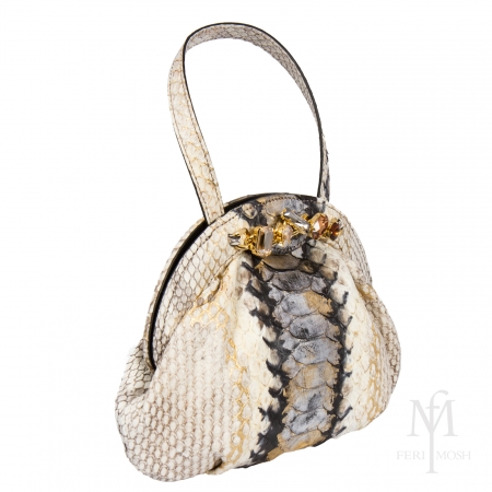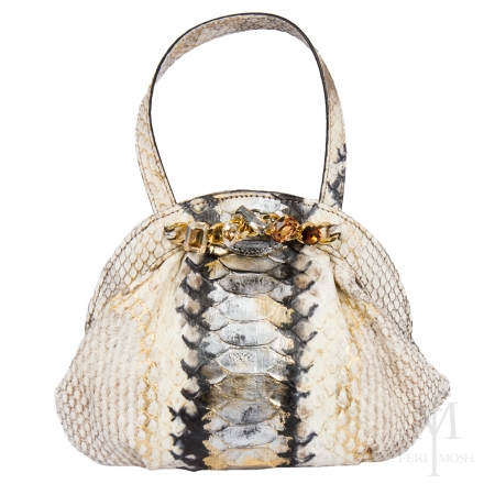 FERI MOSH- Cream and black Metallic genuine python and nappa leather evening bag - Elegant clam shell handbag - Made with python skin and backed with nappa leather - Embellished with gold toned chain and glass cut stones - Magnetic button clam closure with snaps ...