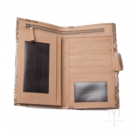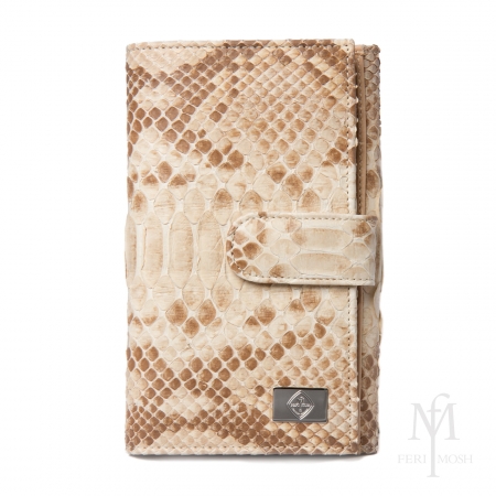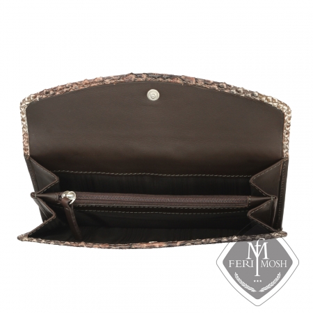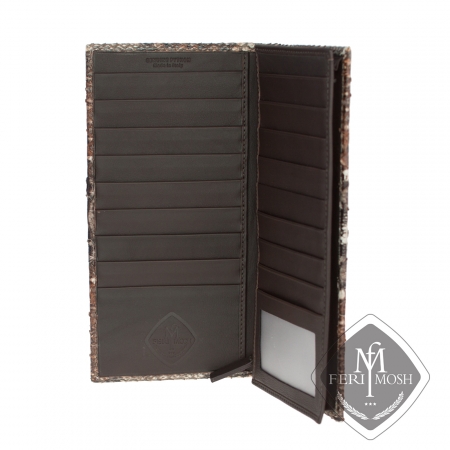 FERI MOSH- Large brown genuine python leather fold wallet - Made with real python skin and nappa leather - Single fold wallet with space for 18 cards - Single accordion slot with zippered pouch for change - One slot for cash or cheques - FERI MOSH logo embossed...